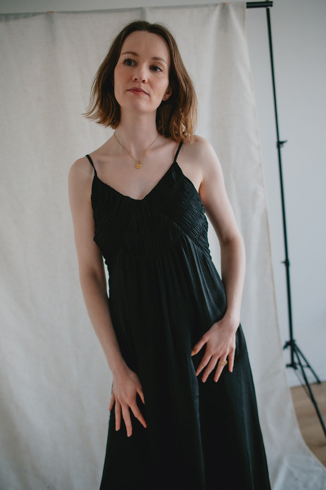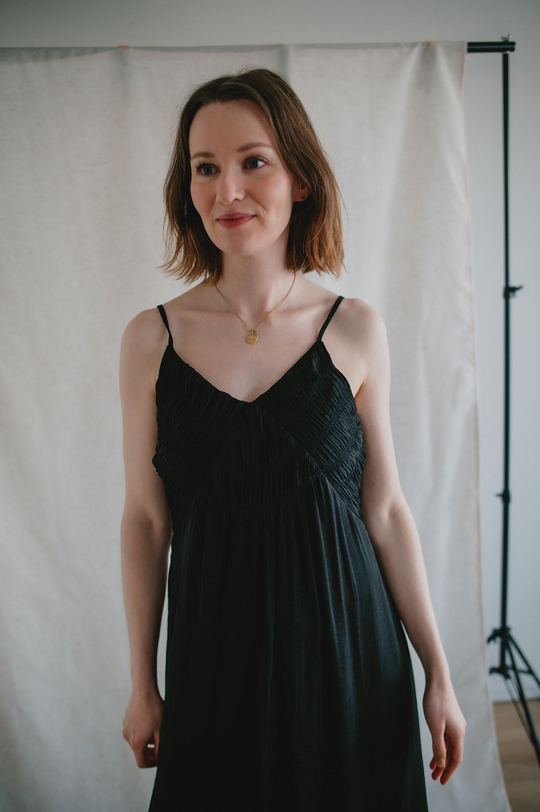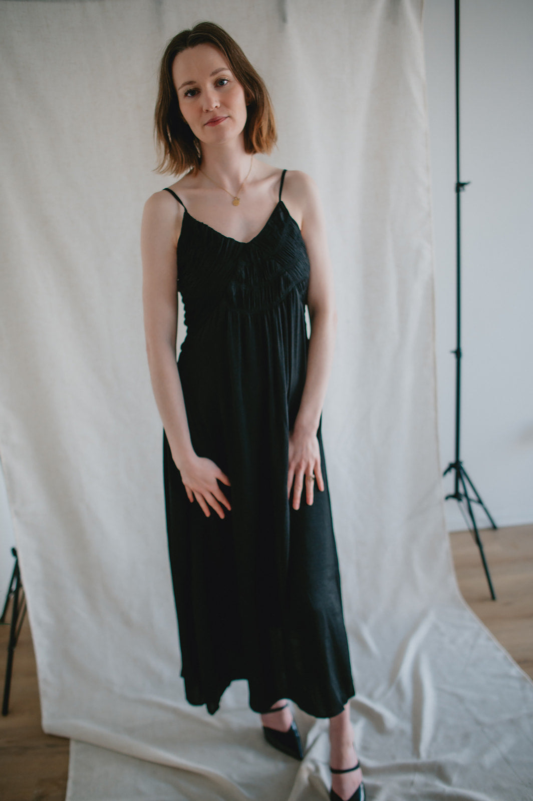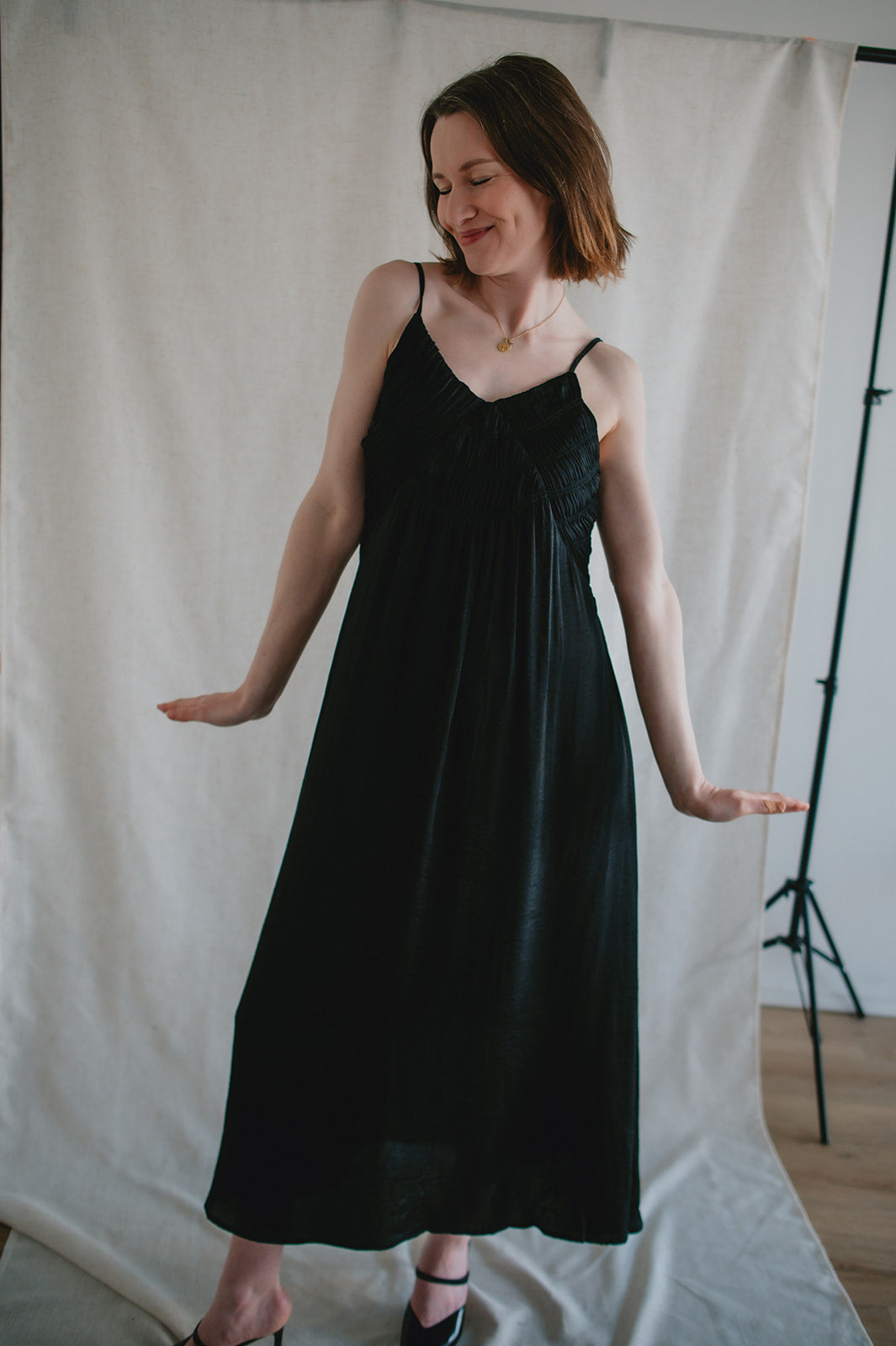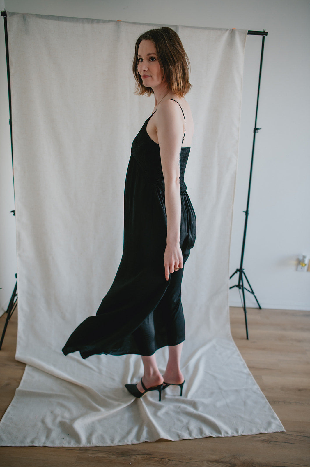 This dress has so many gorgeous details. From the smocked chest, to the satiny flow and finish of the material, to the way she can be styled dressy or casual, she's just lovely!