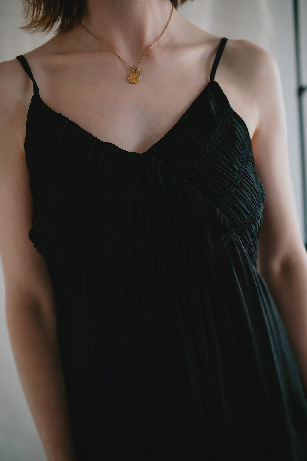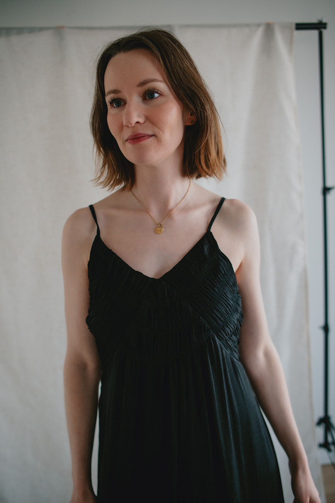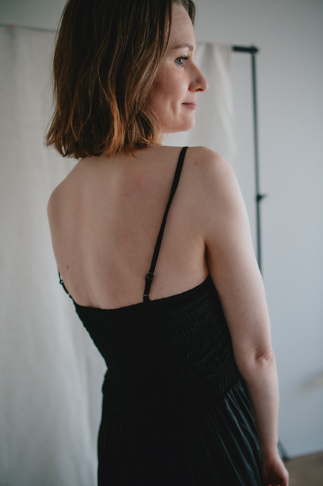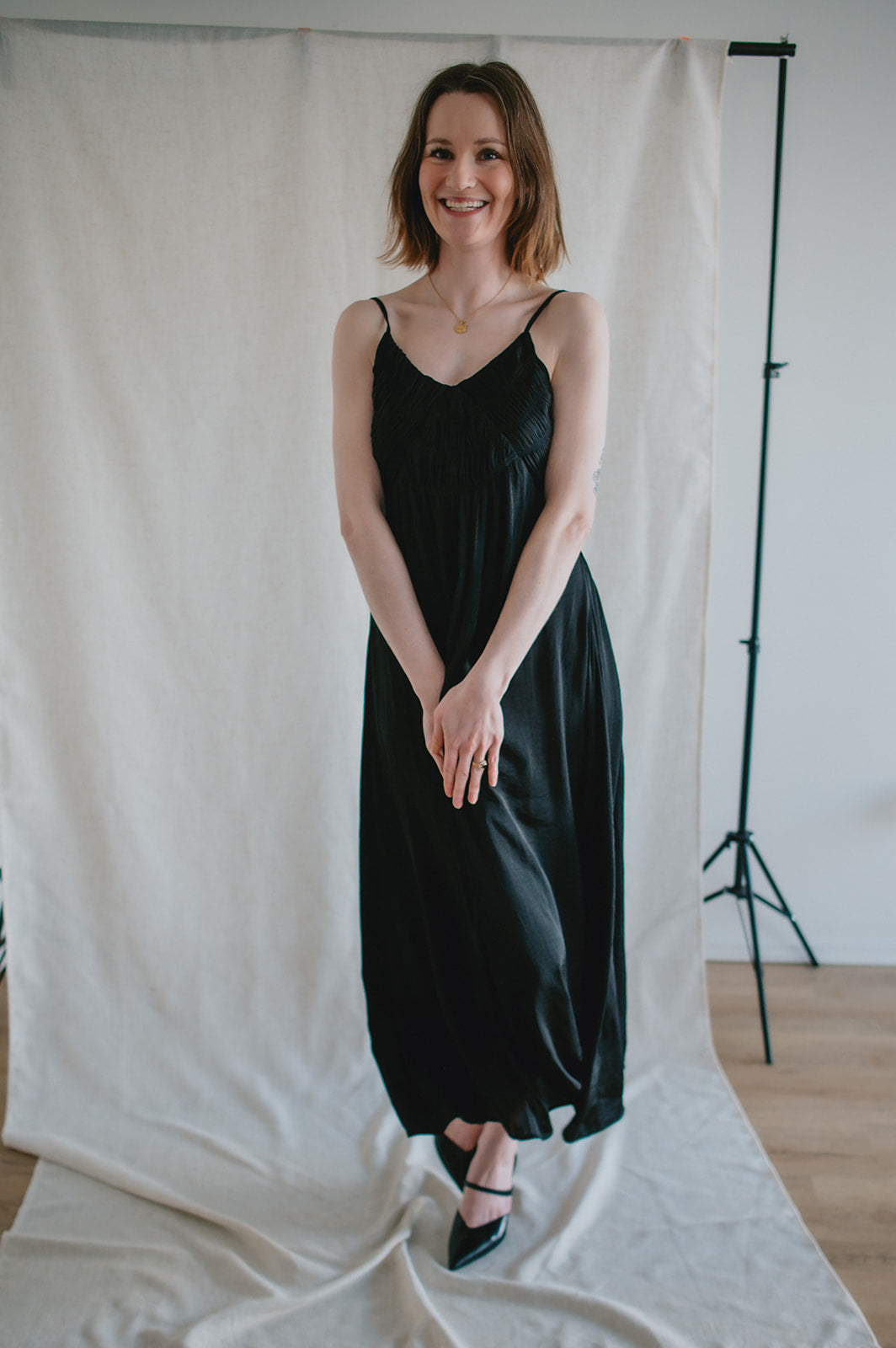This dress has so many gorgeous details. From the smocked chest, to the satiny flow and finish of the material, to the way she can be styled dressy or casual, she's just lovely!