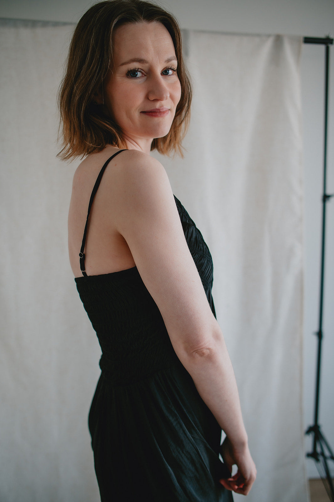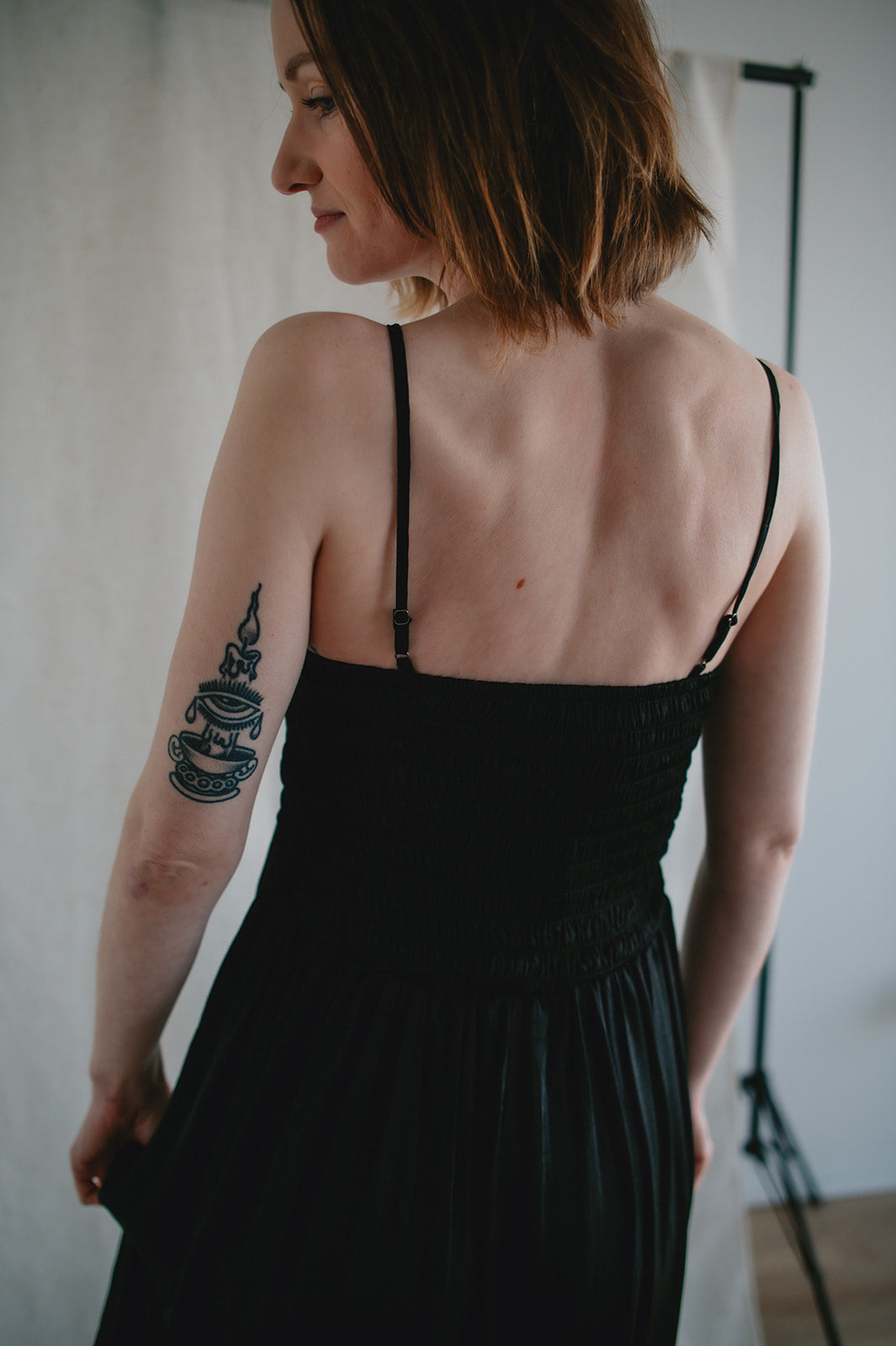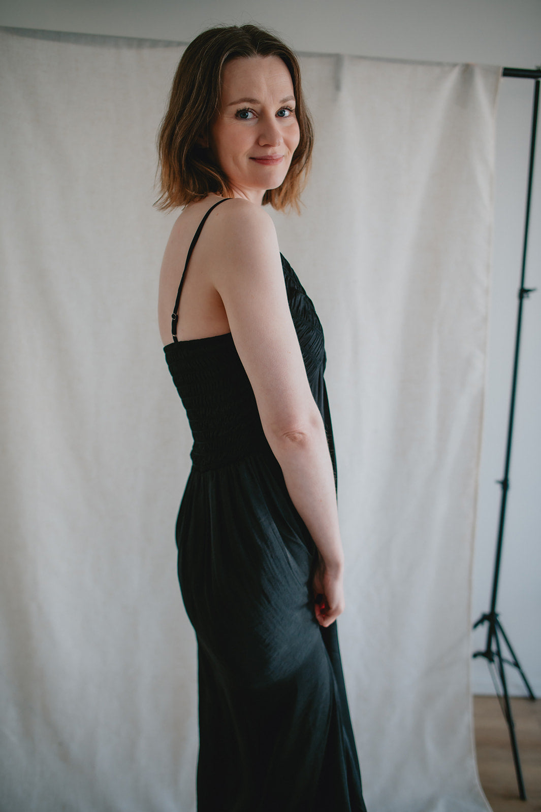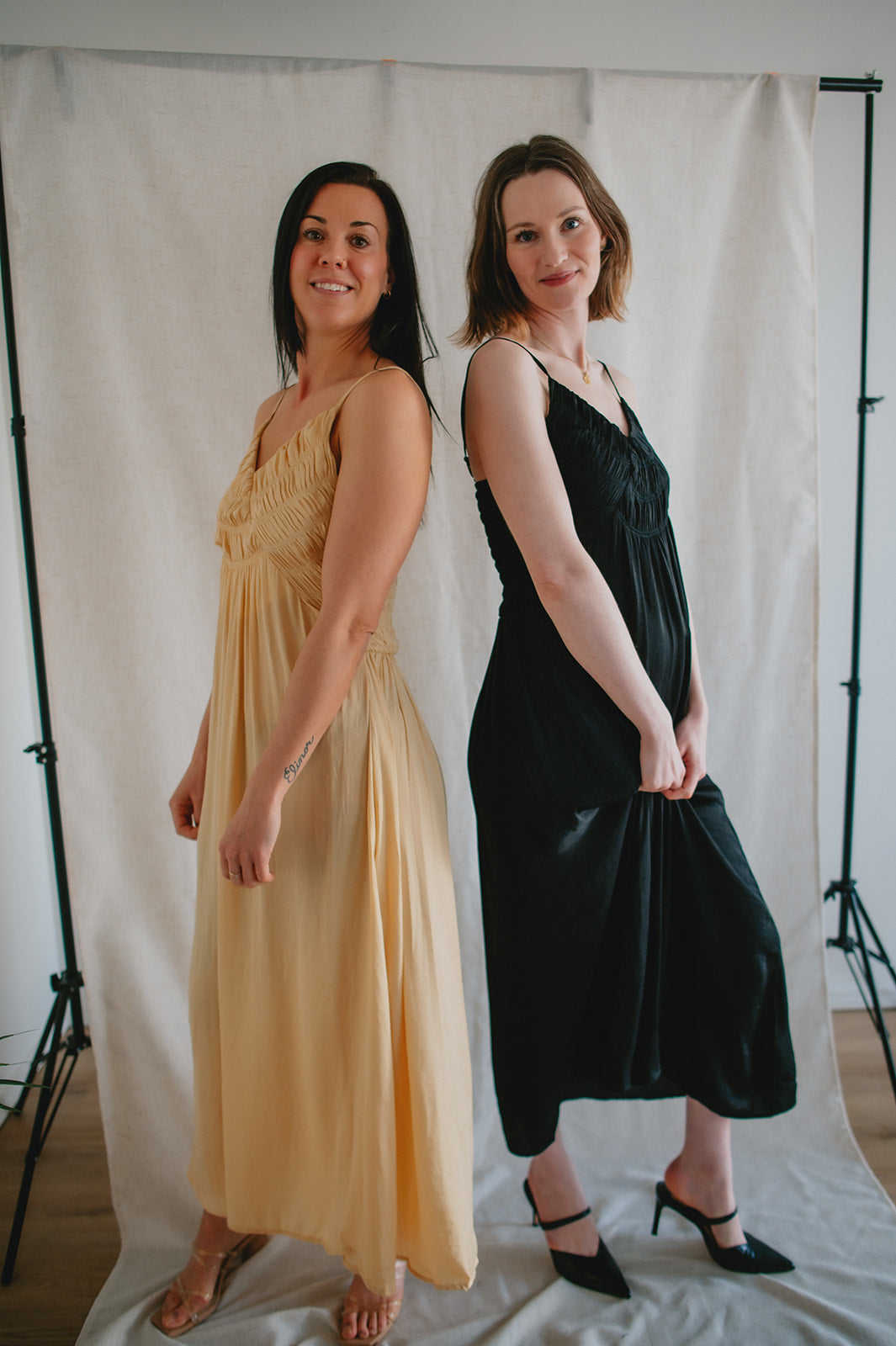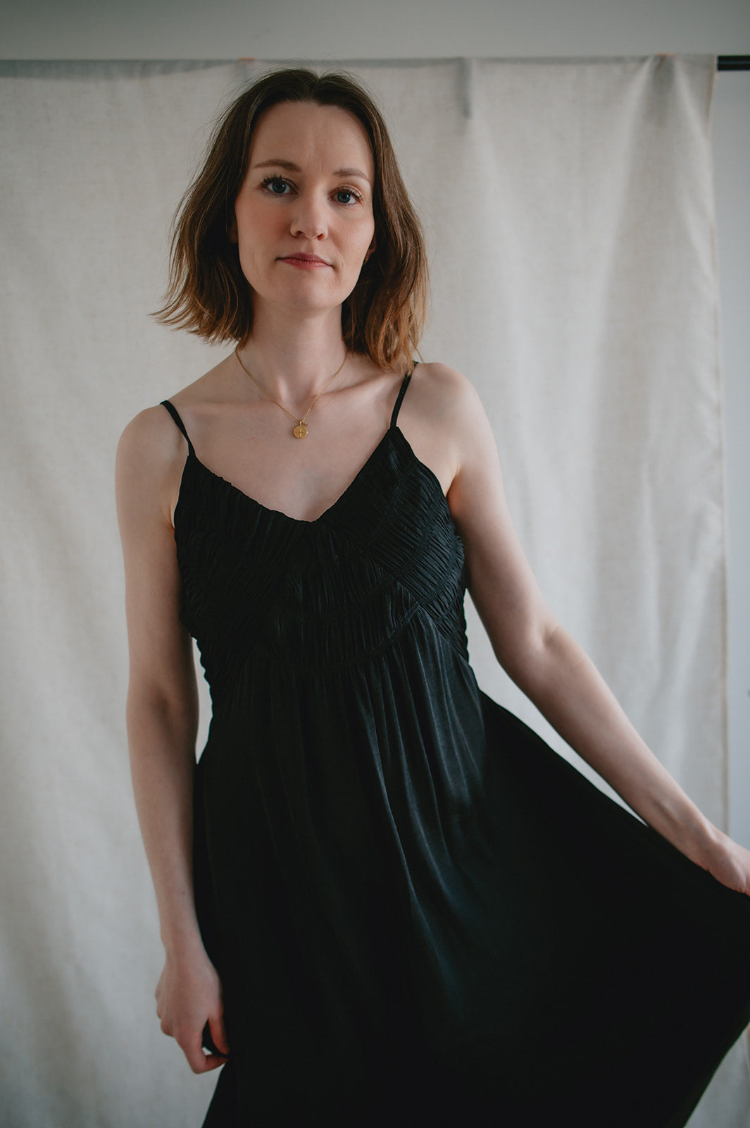 This dress has so many gorgeous details. From the smocked chest, to the satiny flow and finish of the material, to the way she can be styled dressy or casual, she's just lovely!