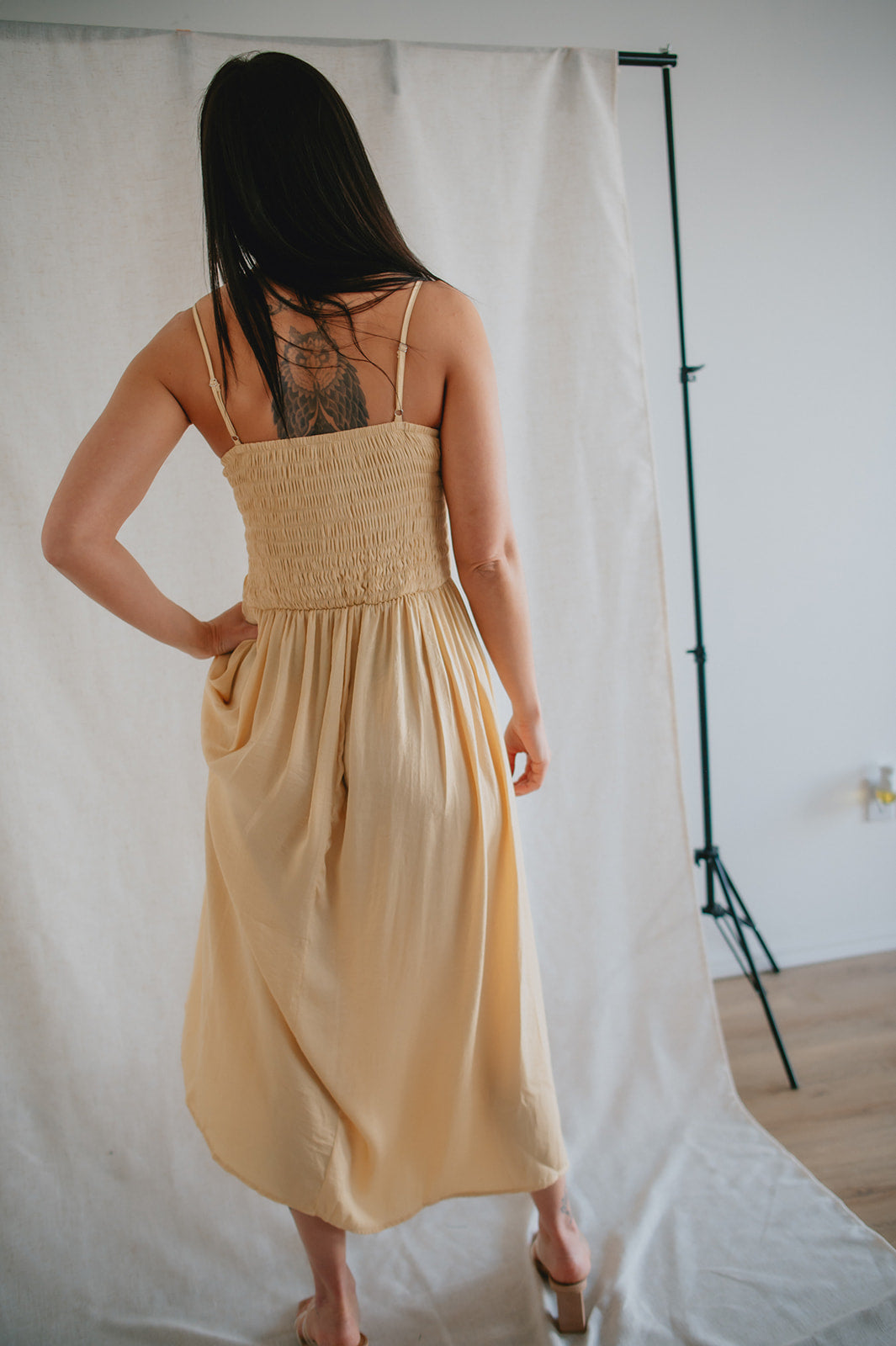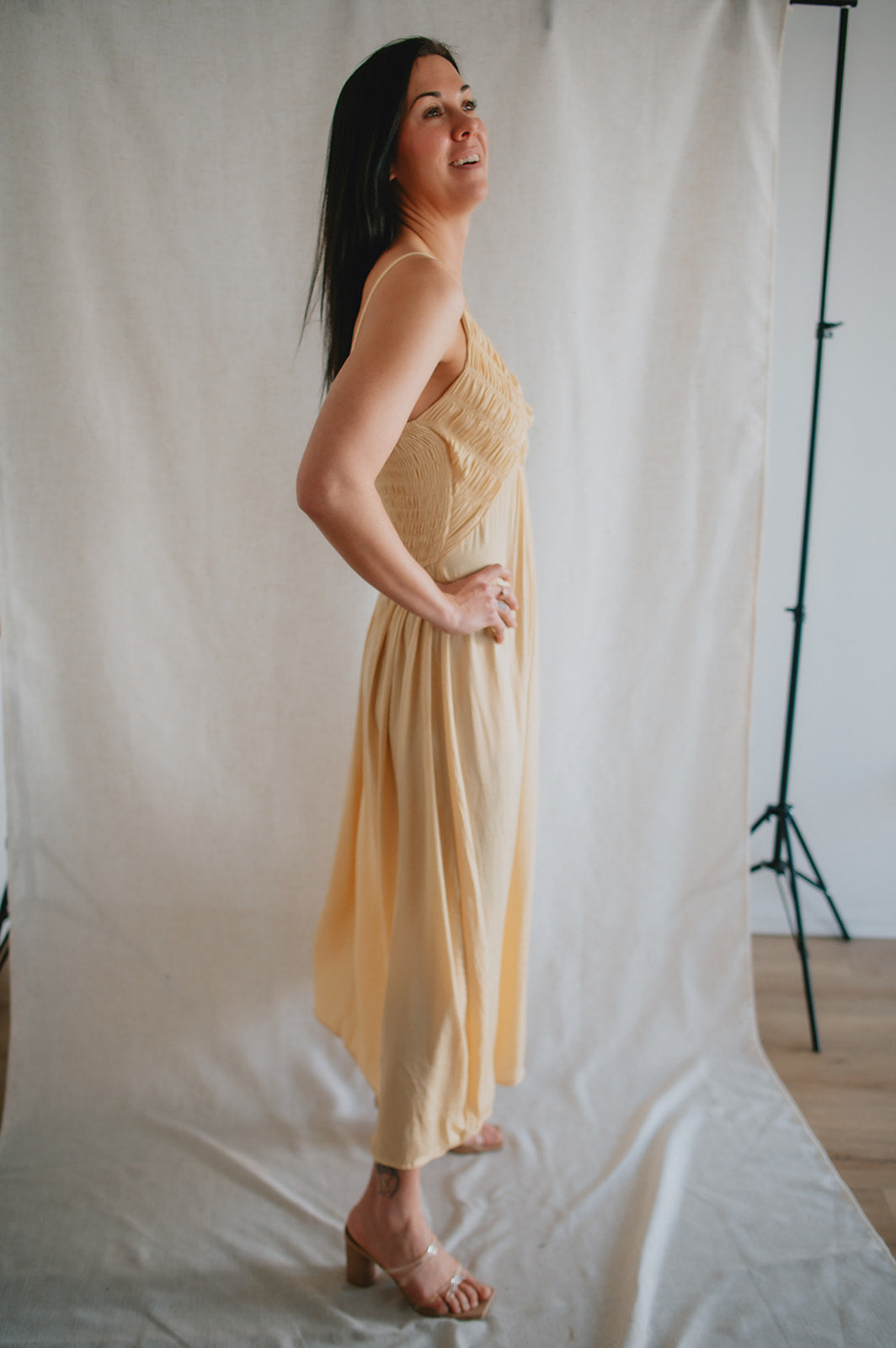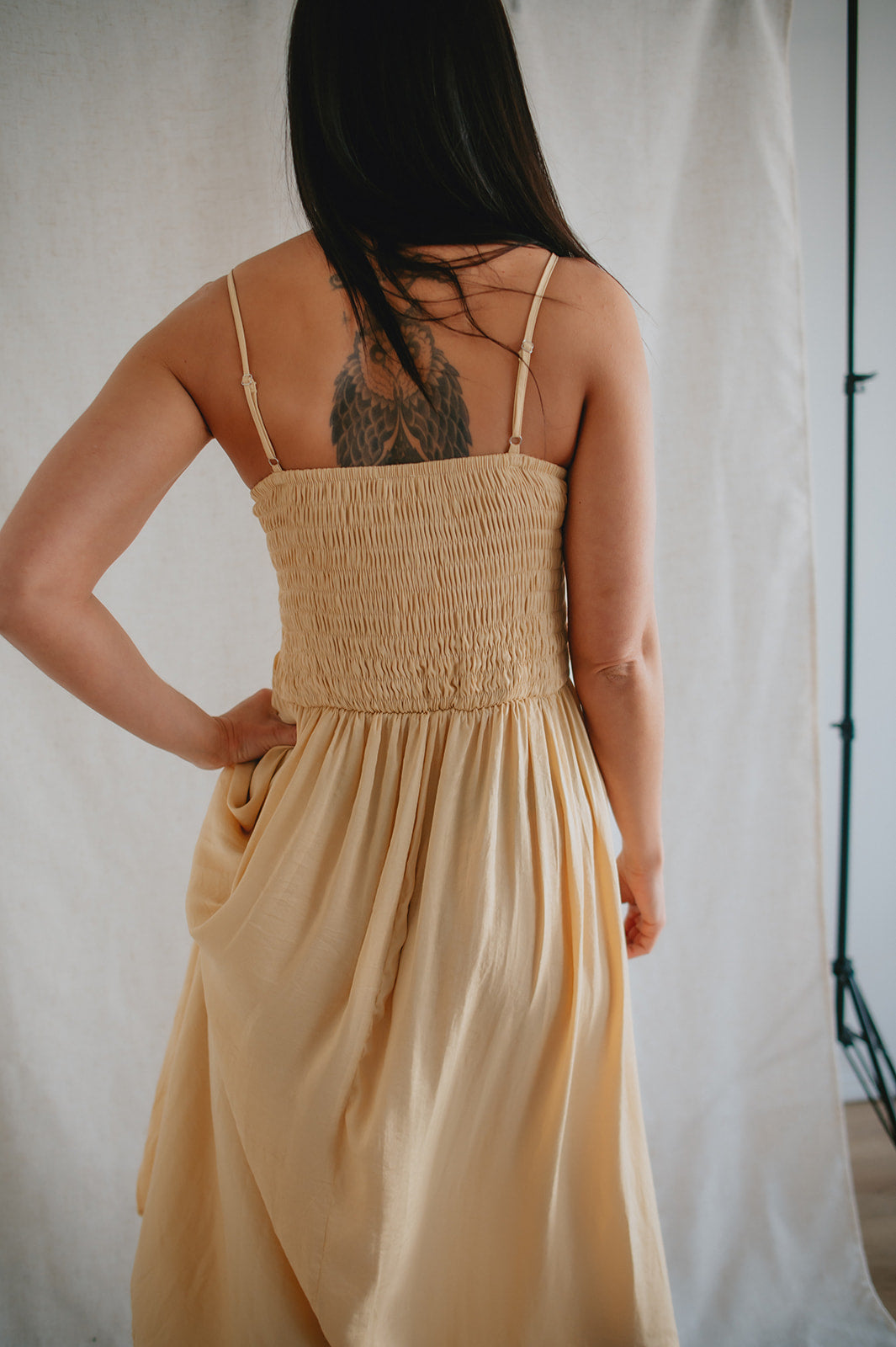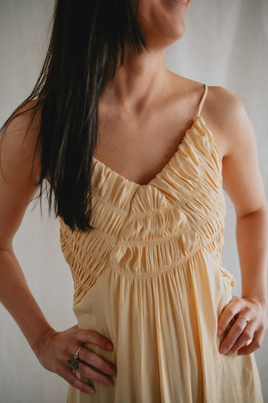 This dress has so many gorgeous details. From the smocked chest, to the satiny flow and finish of the material, to the way she can be styled dressy or casual, she's just lovely!