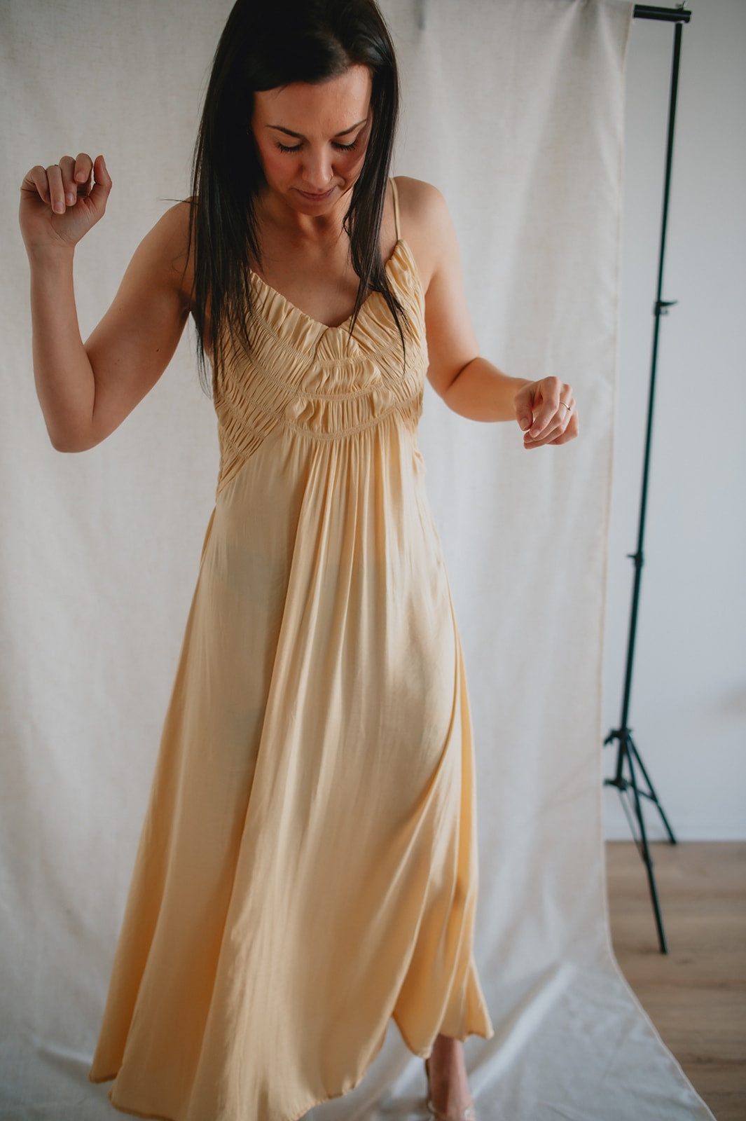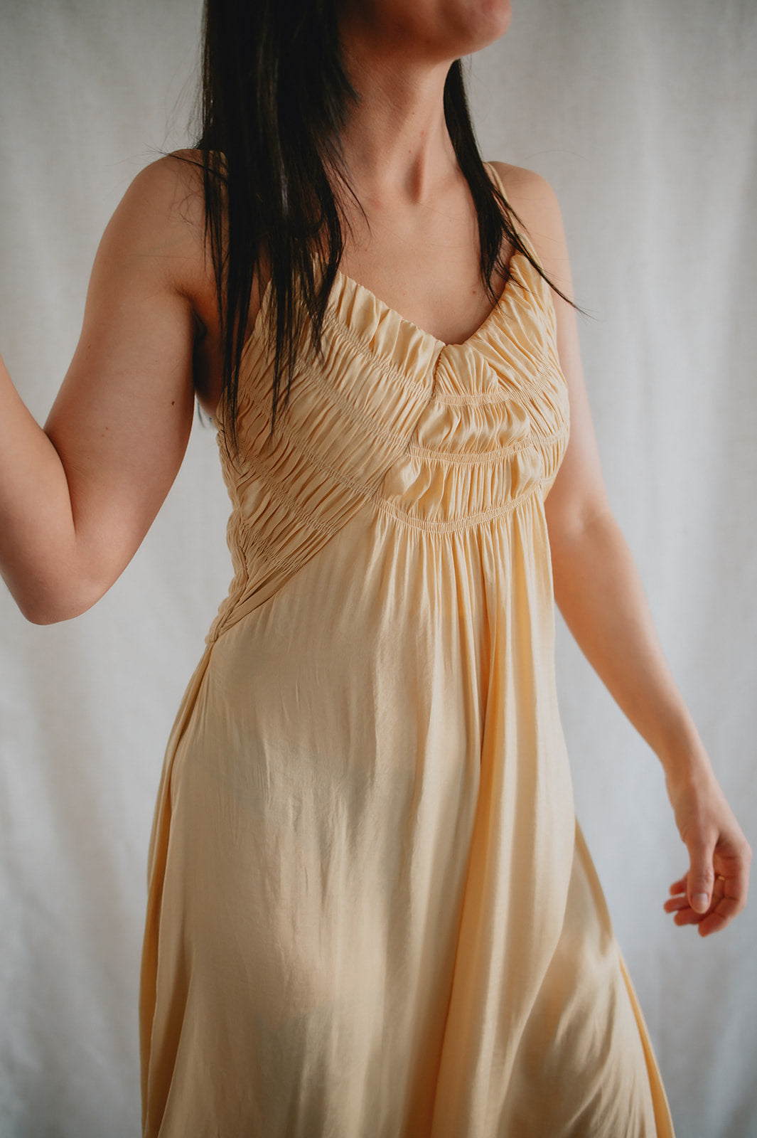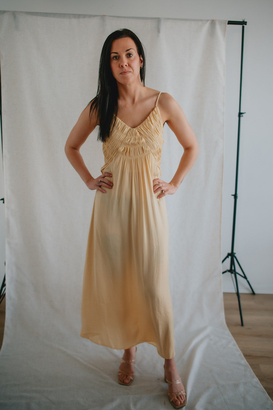This dress has so many gorgeous details. From the smocked chest, to the satiny flow and finish of the material, to the way she can be styled dressy or casual, she's just lovely!