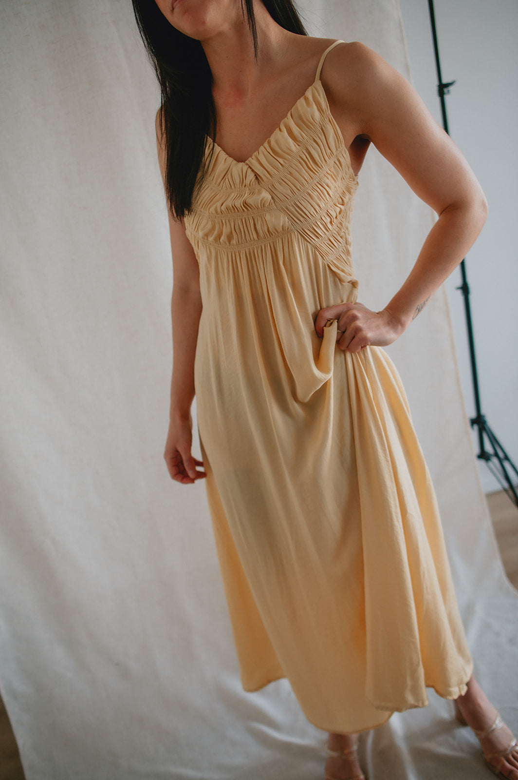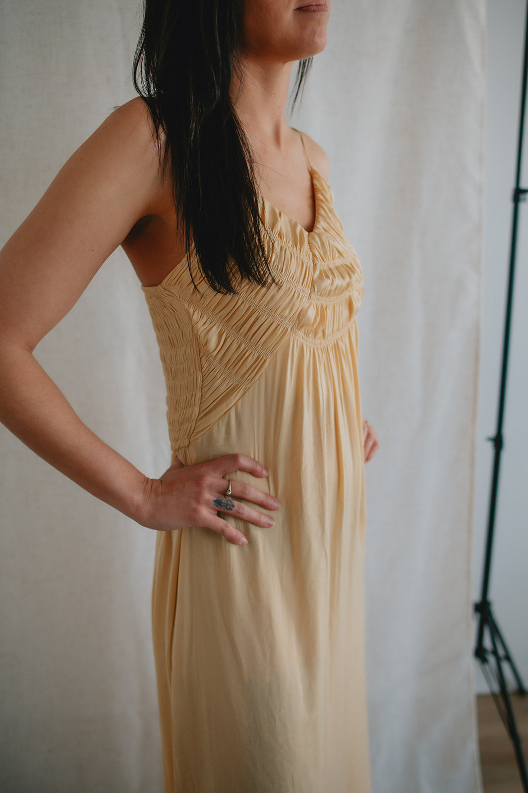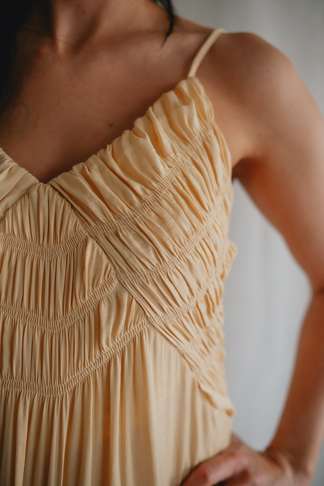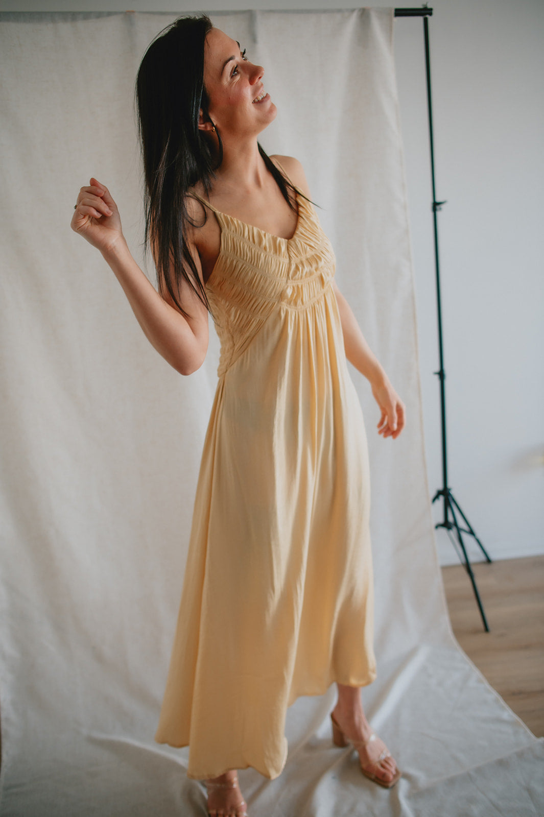 This dress has so many gorgeous details. From the smocked chest, to the satiny flow and finish of the material, to the way she can be styled dressy or casual, she's just lovely!