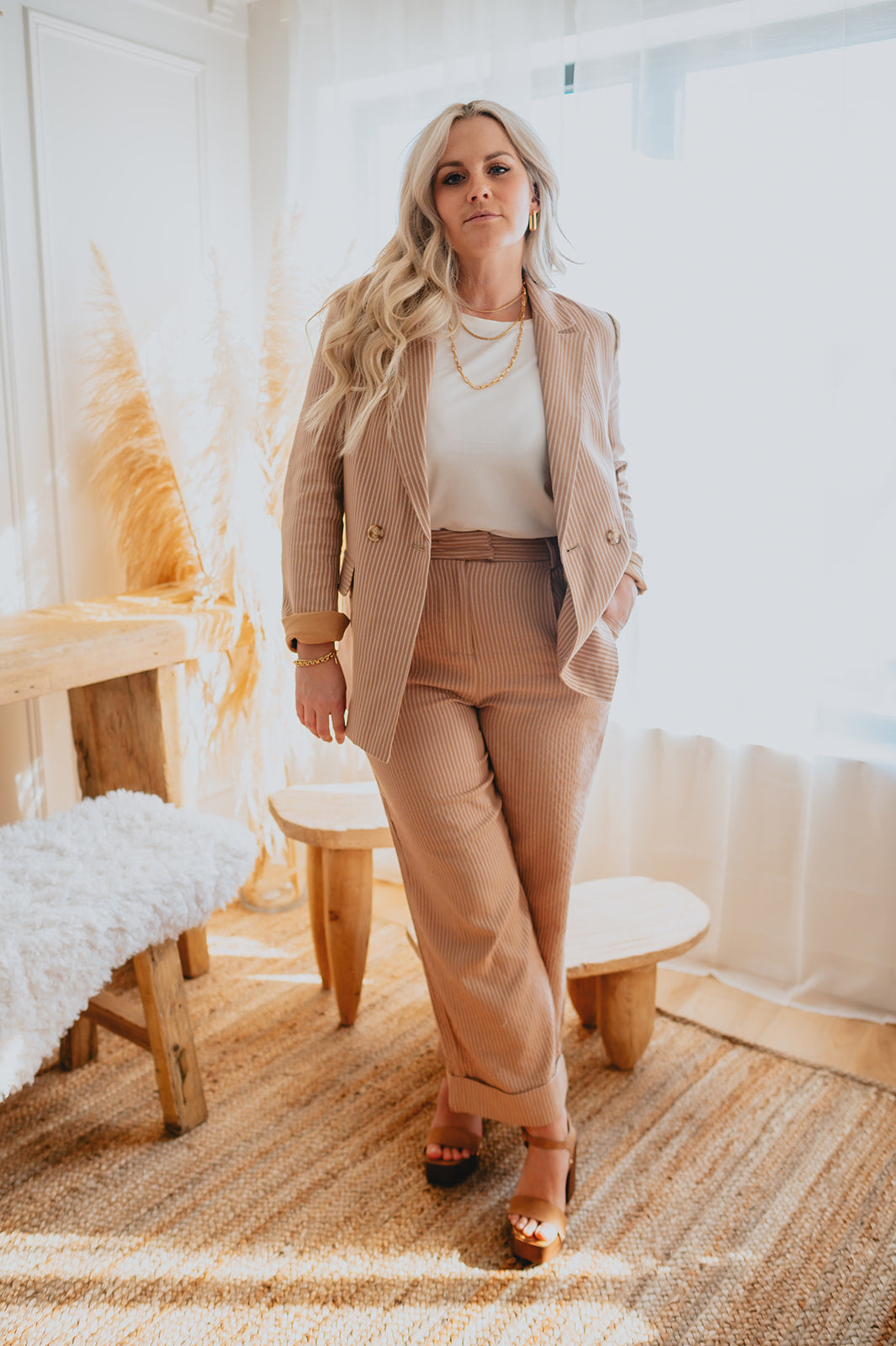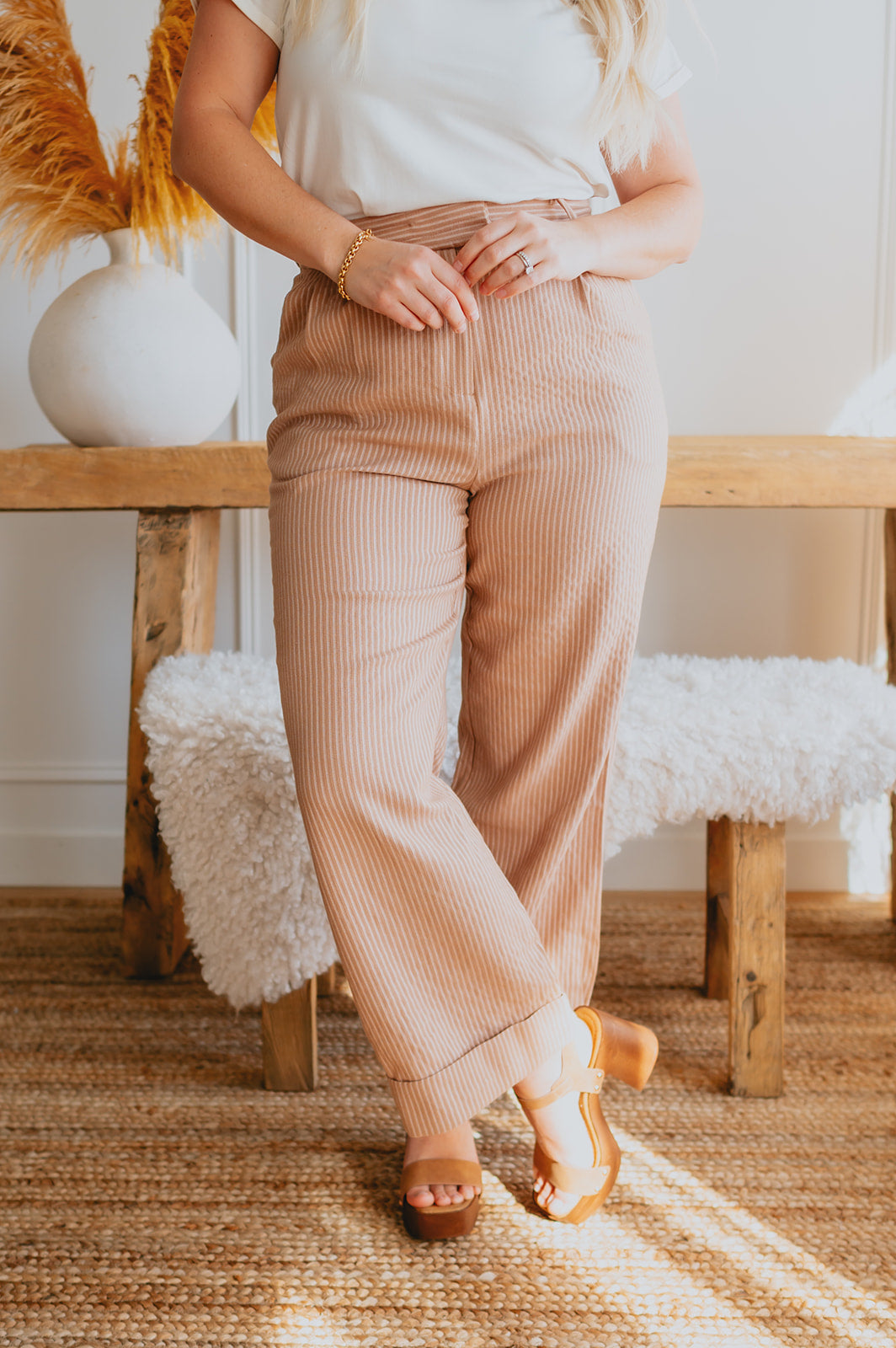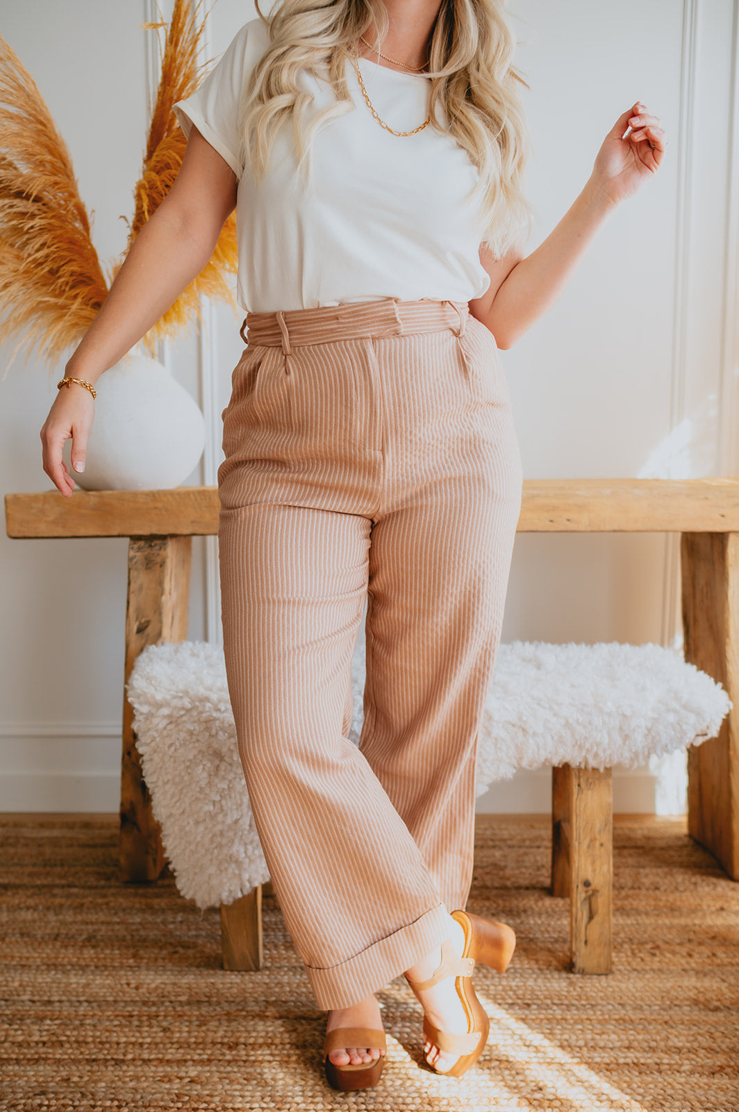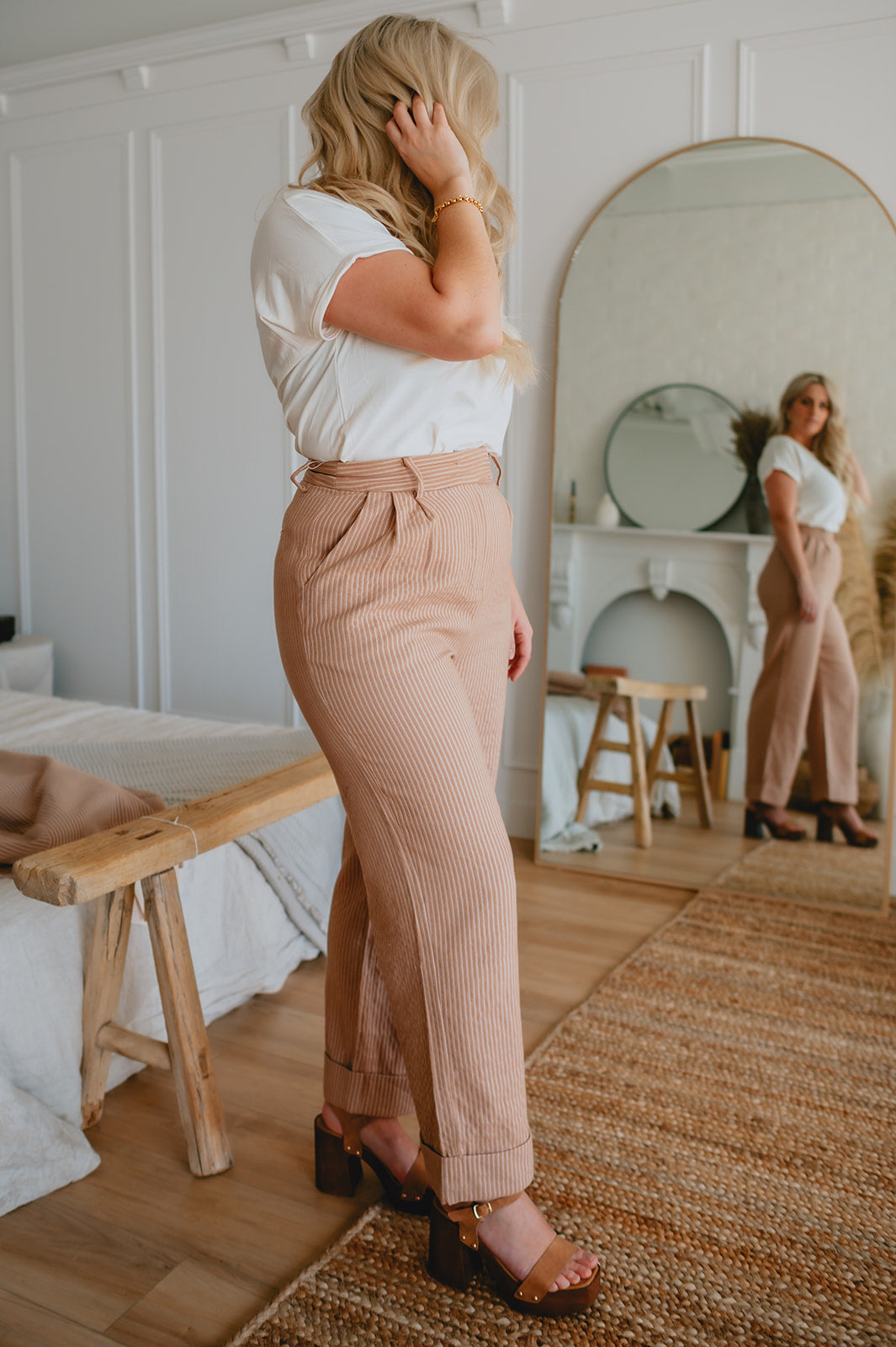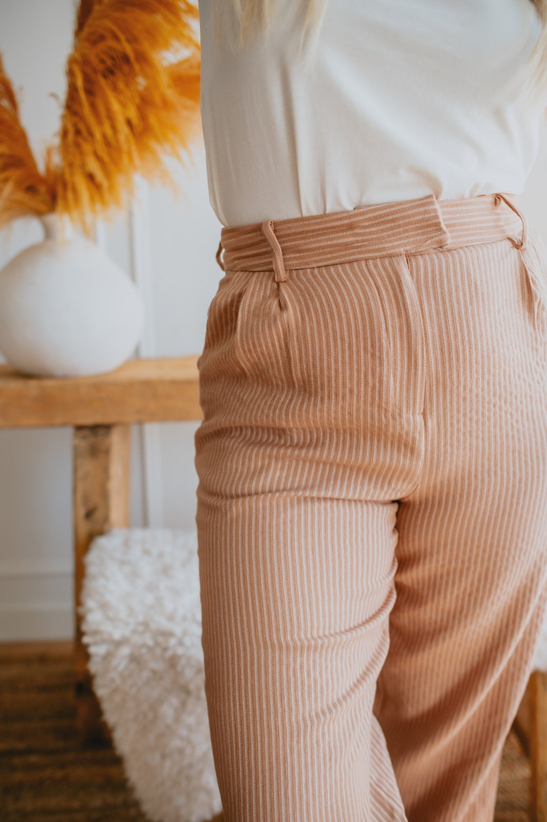Inspired by men's suiting, The Palmier pant features a loose fit and pleats at the waist for extra volume and style. Its neutral colour completes the tailored look with the railway stripe giving them a modern twist. An elegant pant that elongates the figure with elegance.