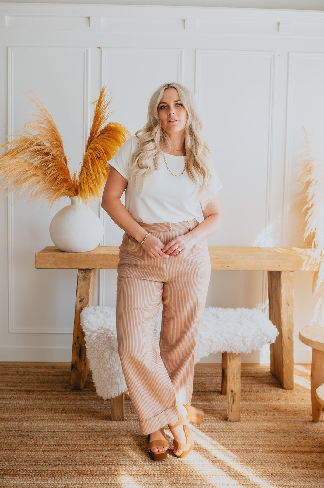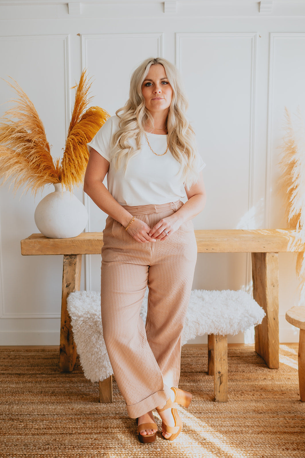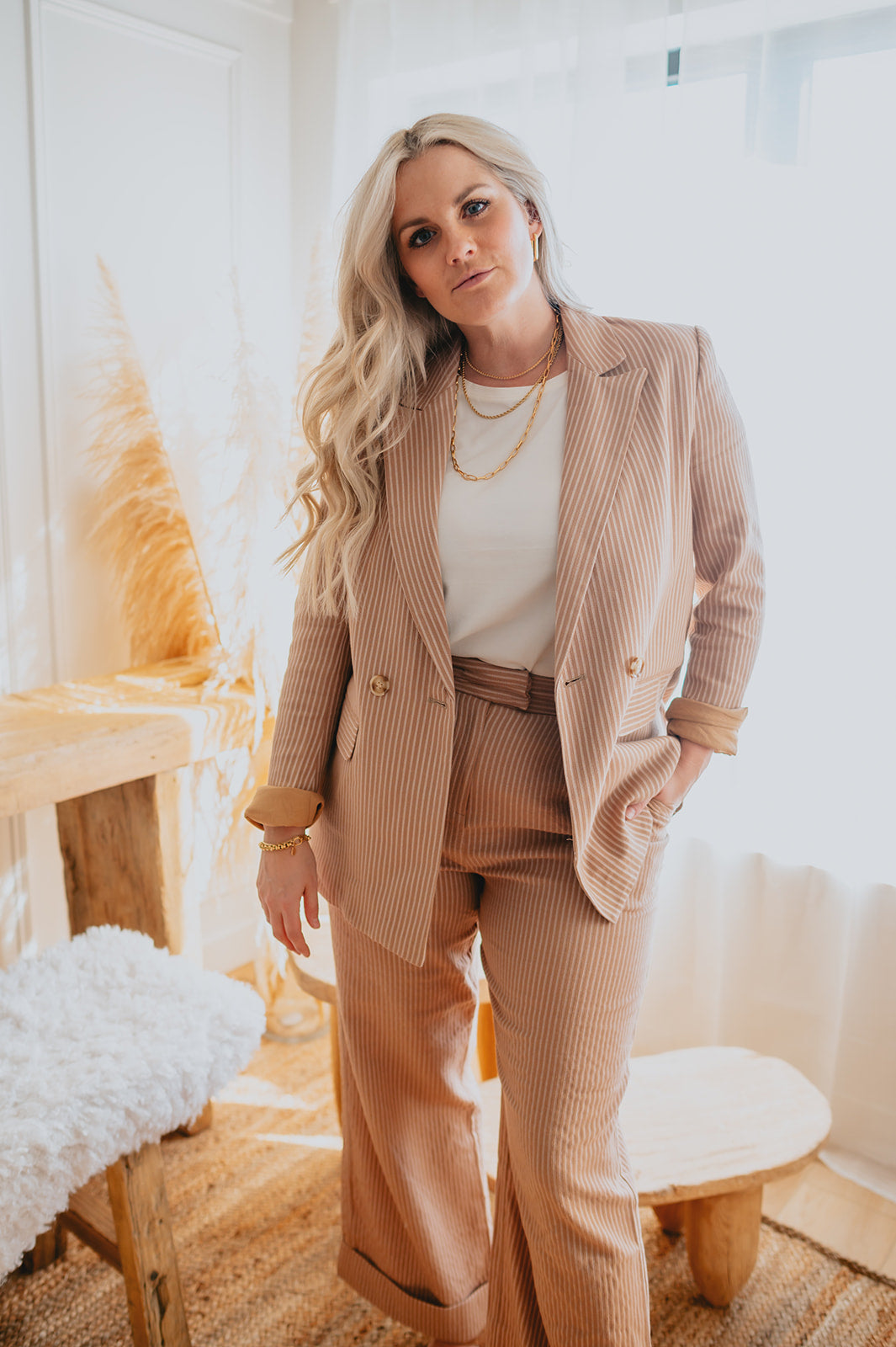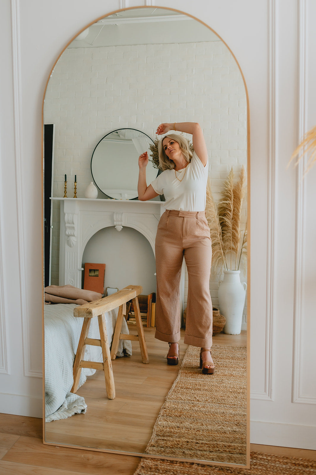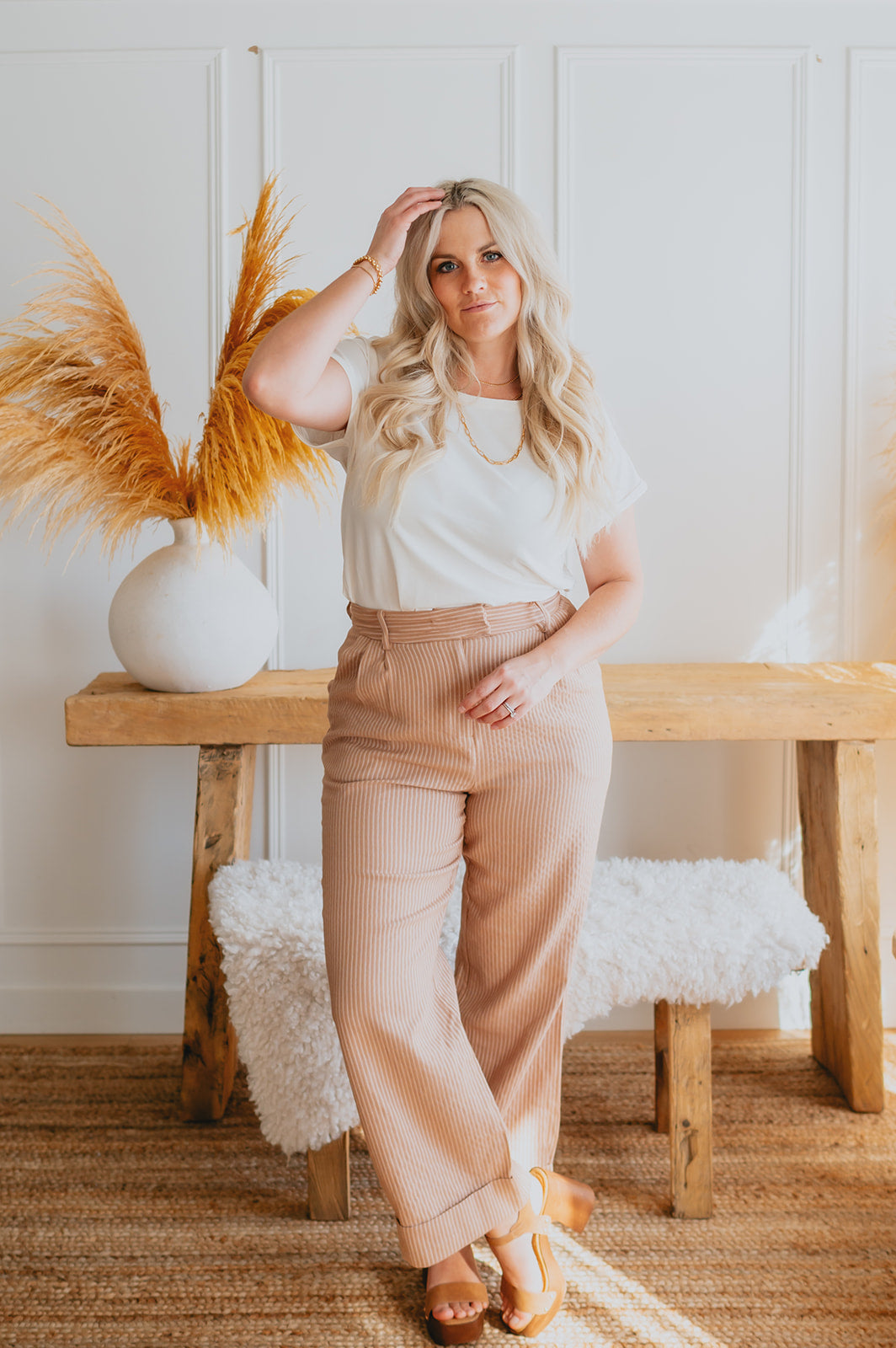 Inspired by men's suiting, The Palmier pant features a loose fit and pleats at the waist for extra volume and style. Its neutral colour completes the tailored look with the railway stripe giving them a modern twist. An elegant pant that elongates the figure with elegance.