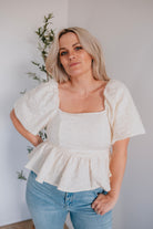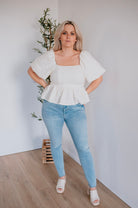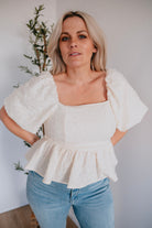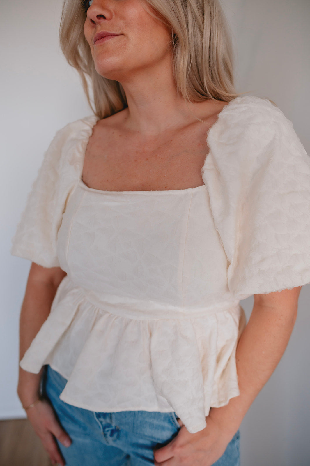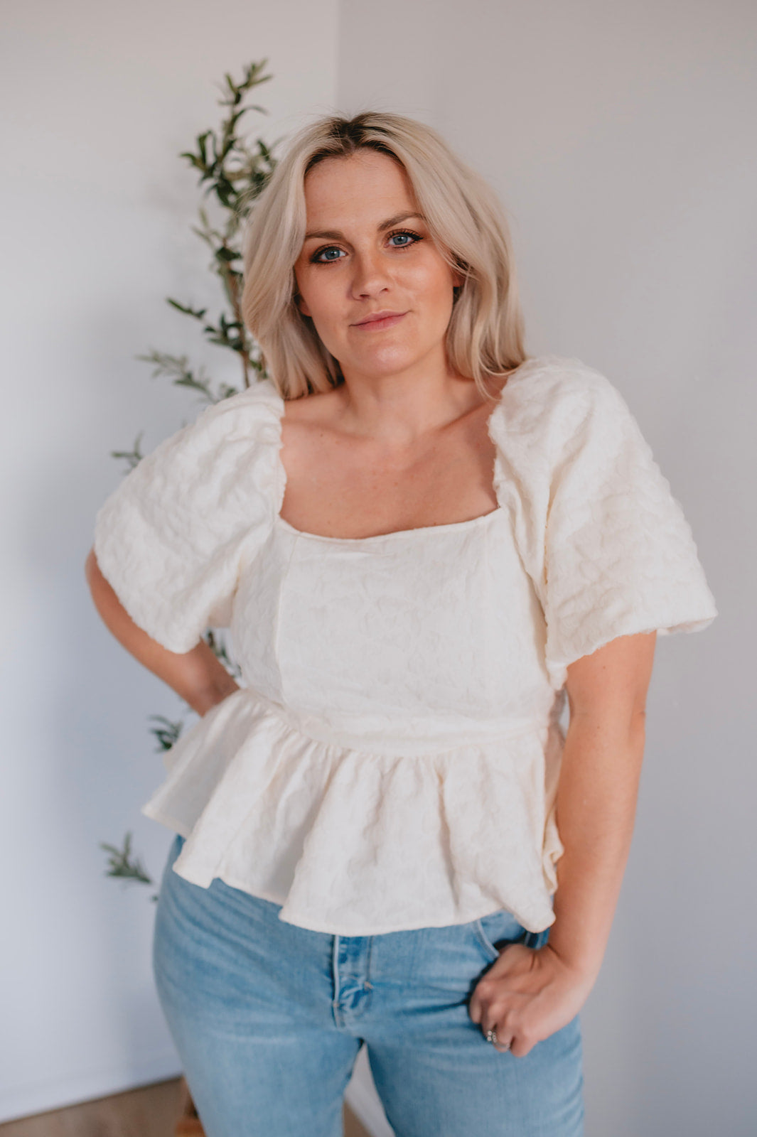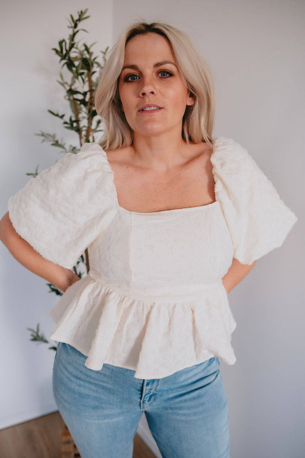 The Bette is a babydoll peplum blouse in a stretch textured jacquard knit fabric. This endearing style features a square neckline, puff short sleeves with elasticated cuff, smocking at back for comfort, hidden zipper closure at centre back, and elasticated shirred shoulders. The perfect skinny jean companion!