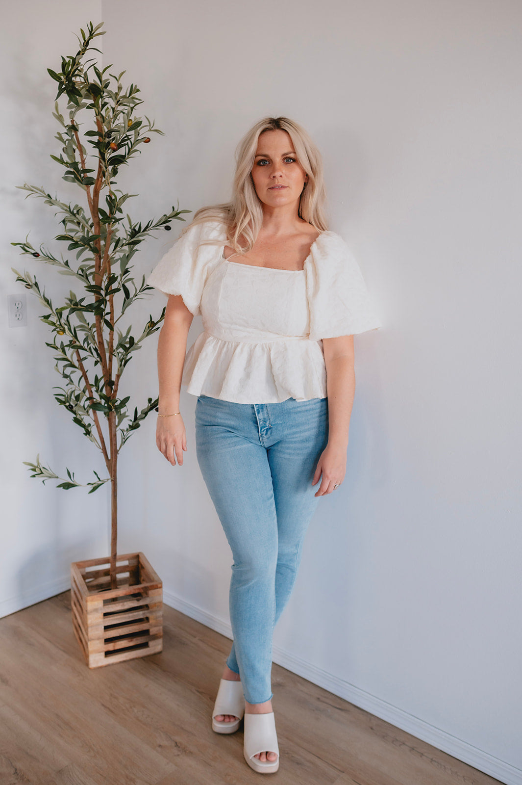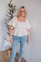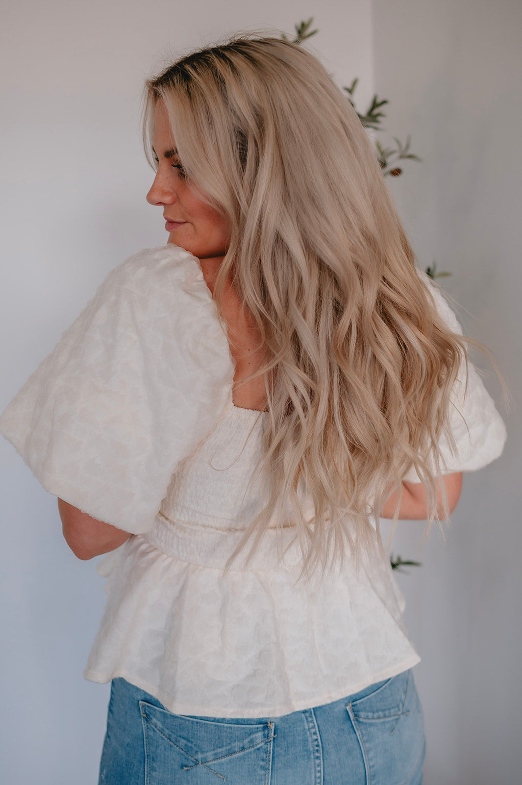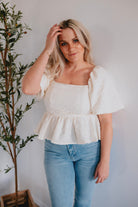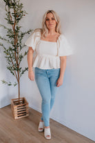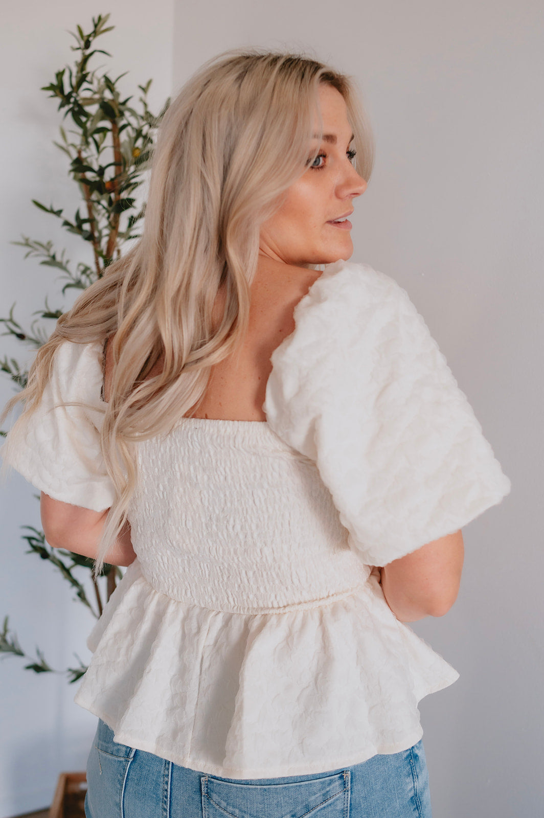 The Bette is a babydoll peplum blouse in a stretch textured jacquard knit fabric. This endearing style features a square neckline, puff short sleeves with elasticated cuff, smocking at back for comfort, hidden zipper closure at centre back, and elasticated shirred shoulders. The perfect skinny jean companion!