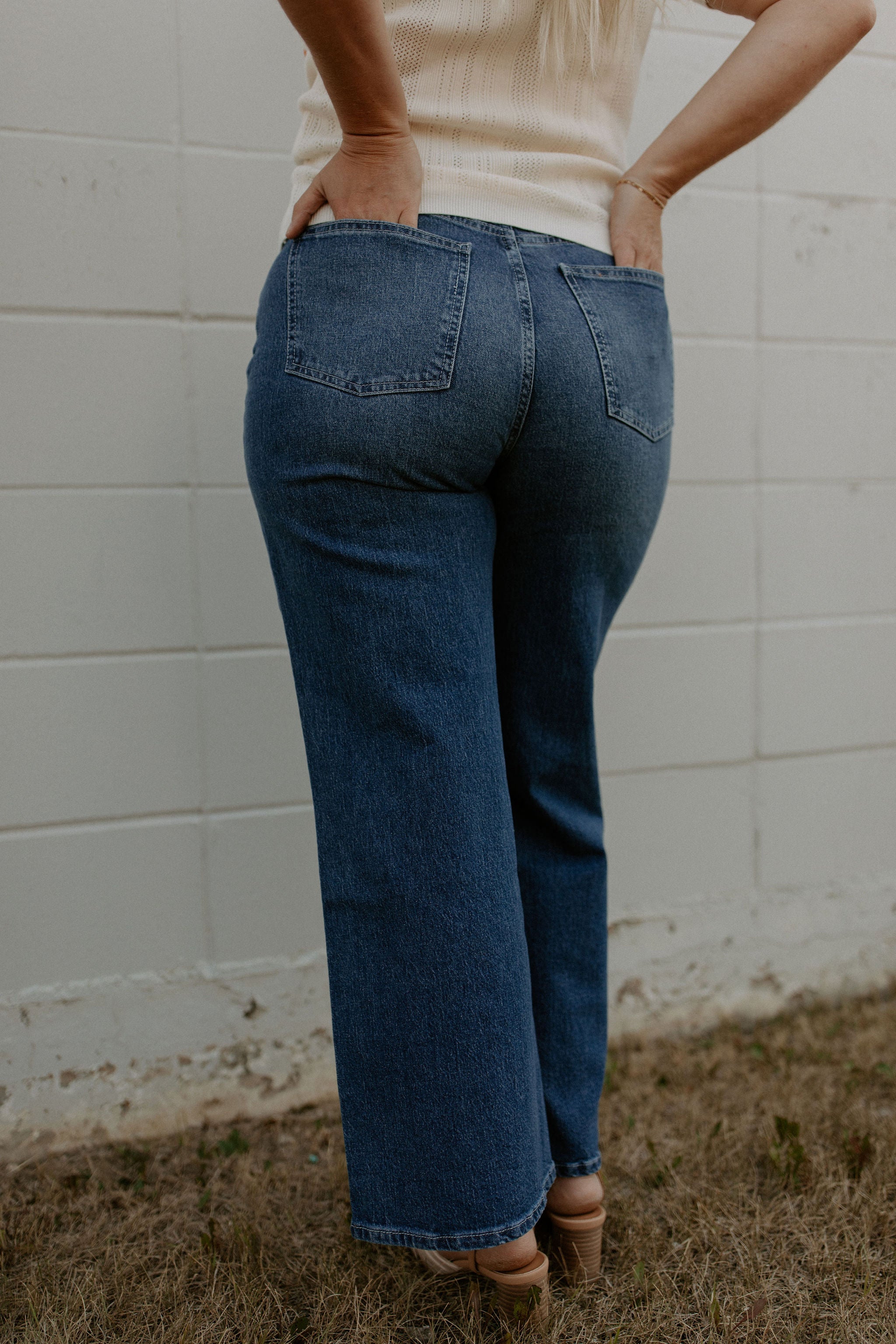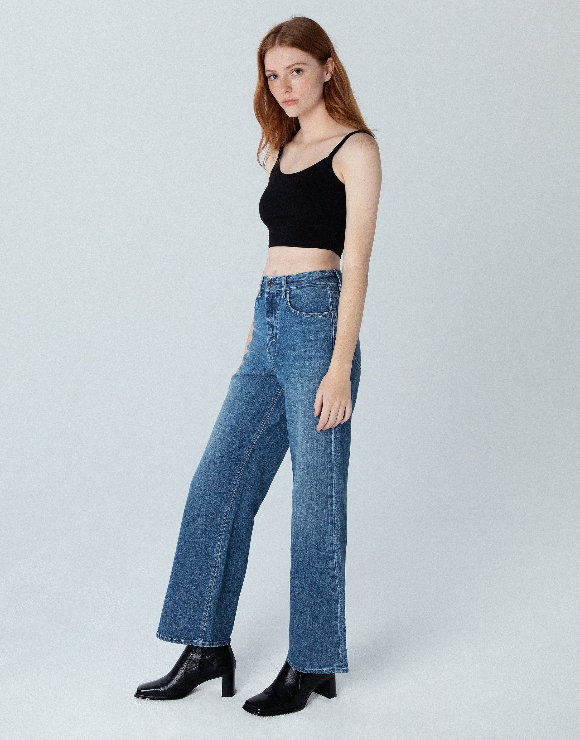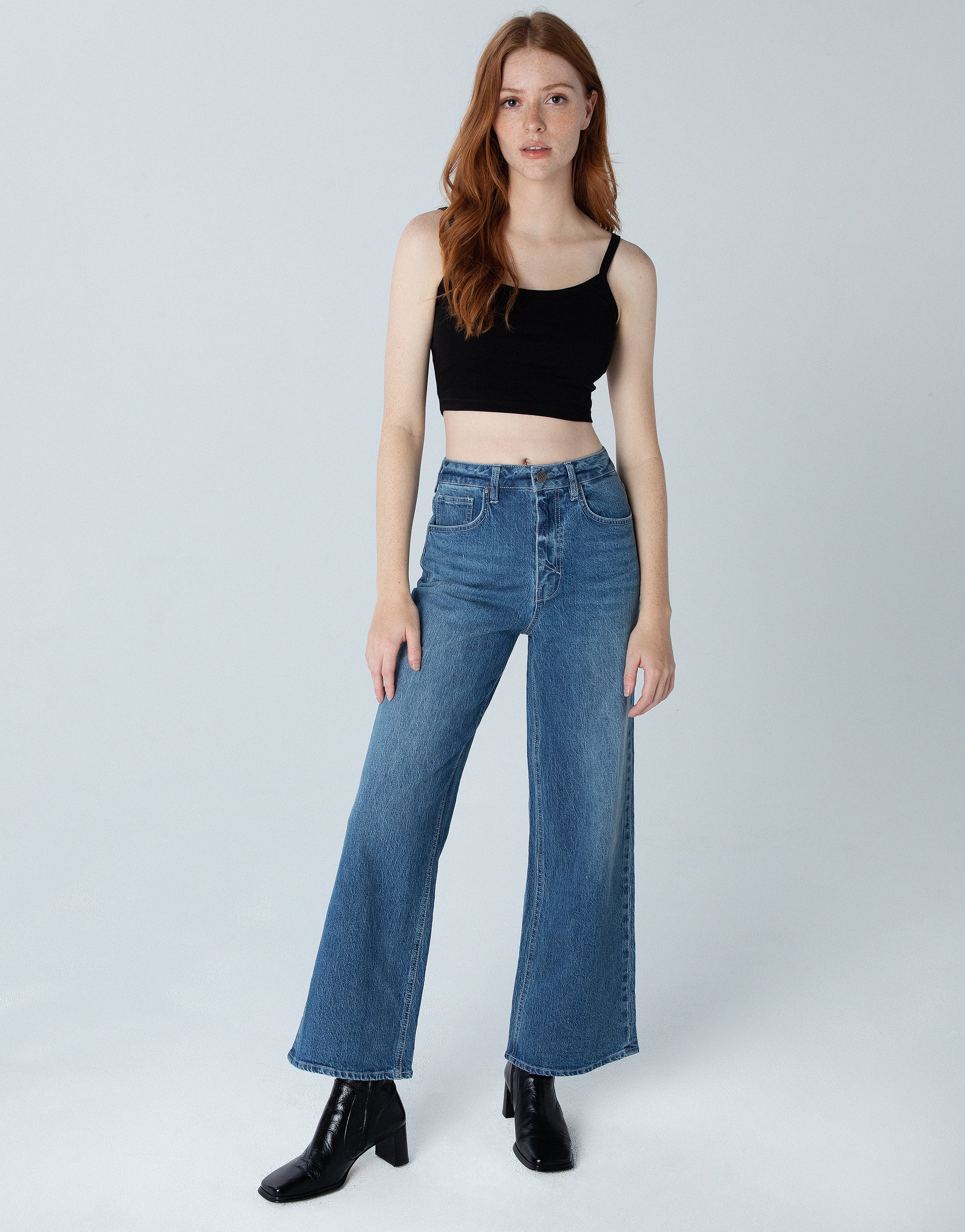 Our super high rise wide leg bell. Este sits at your natural waist and its relaxed at the hip and wide throughout the leg. Featuring 5 pocket styling. Fits true to size.