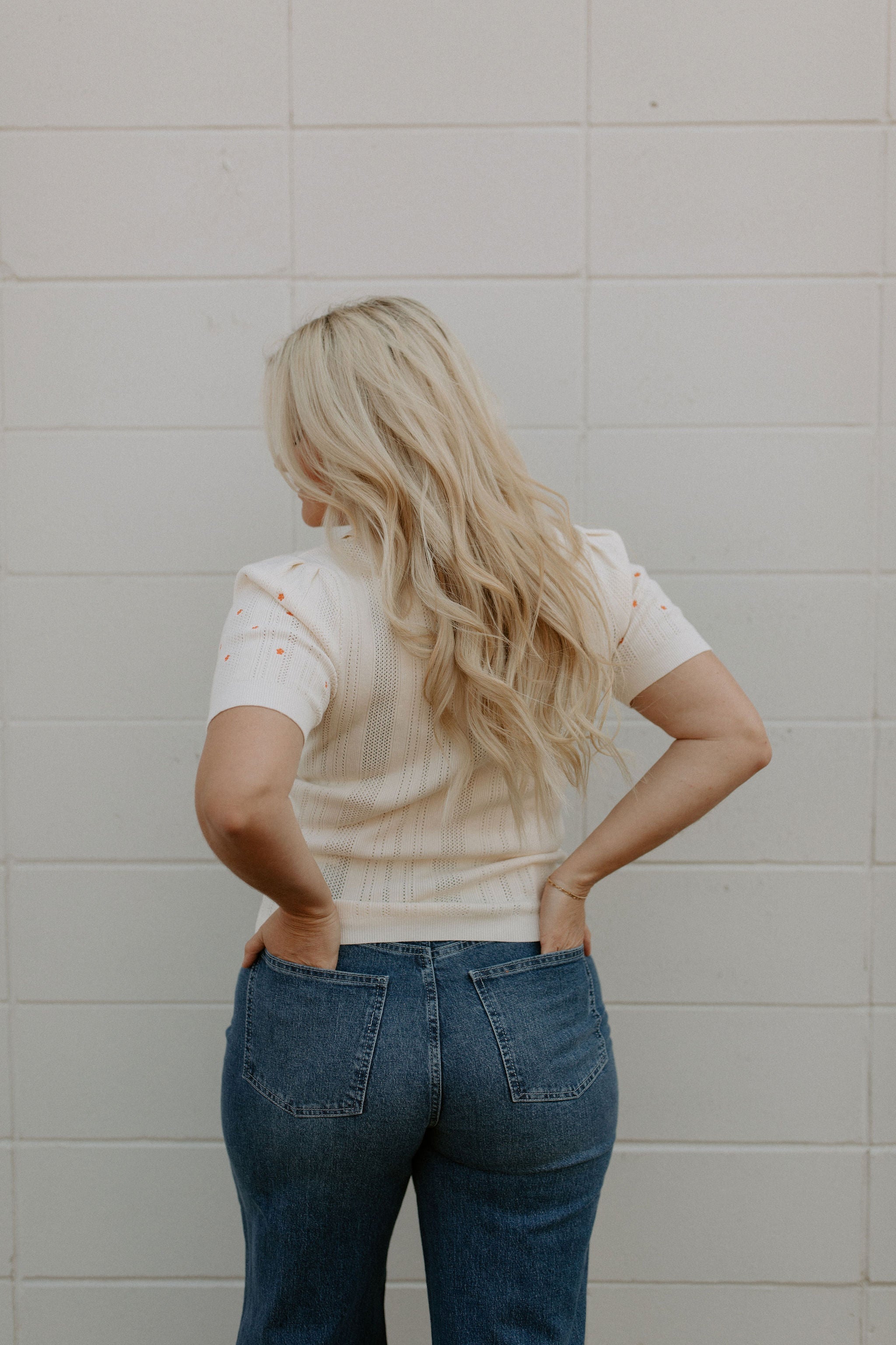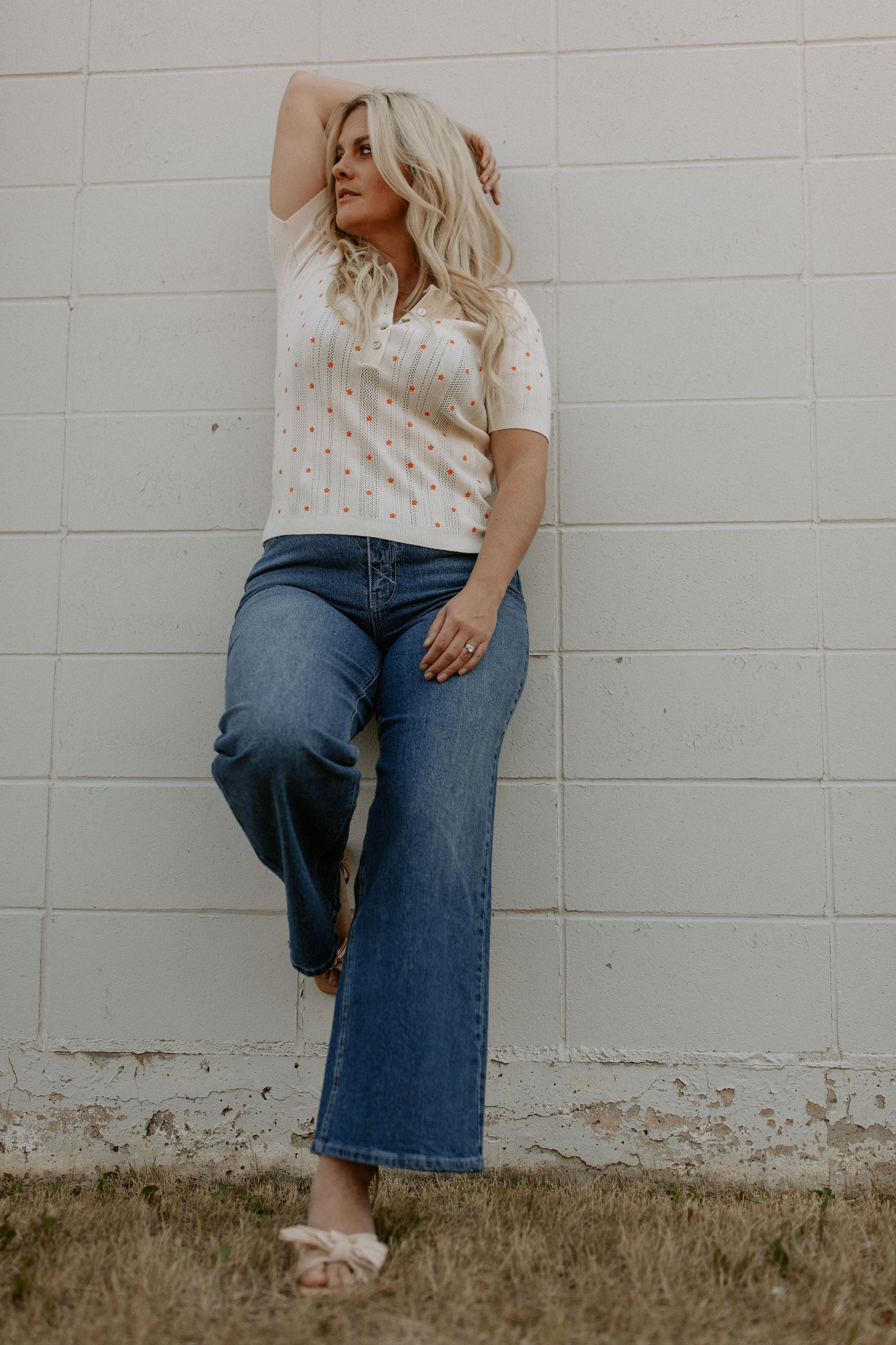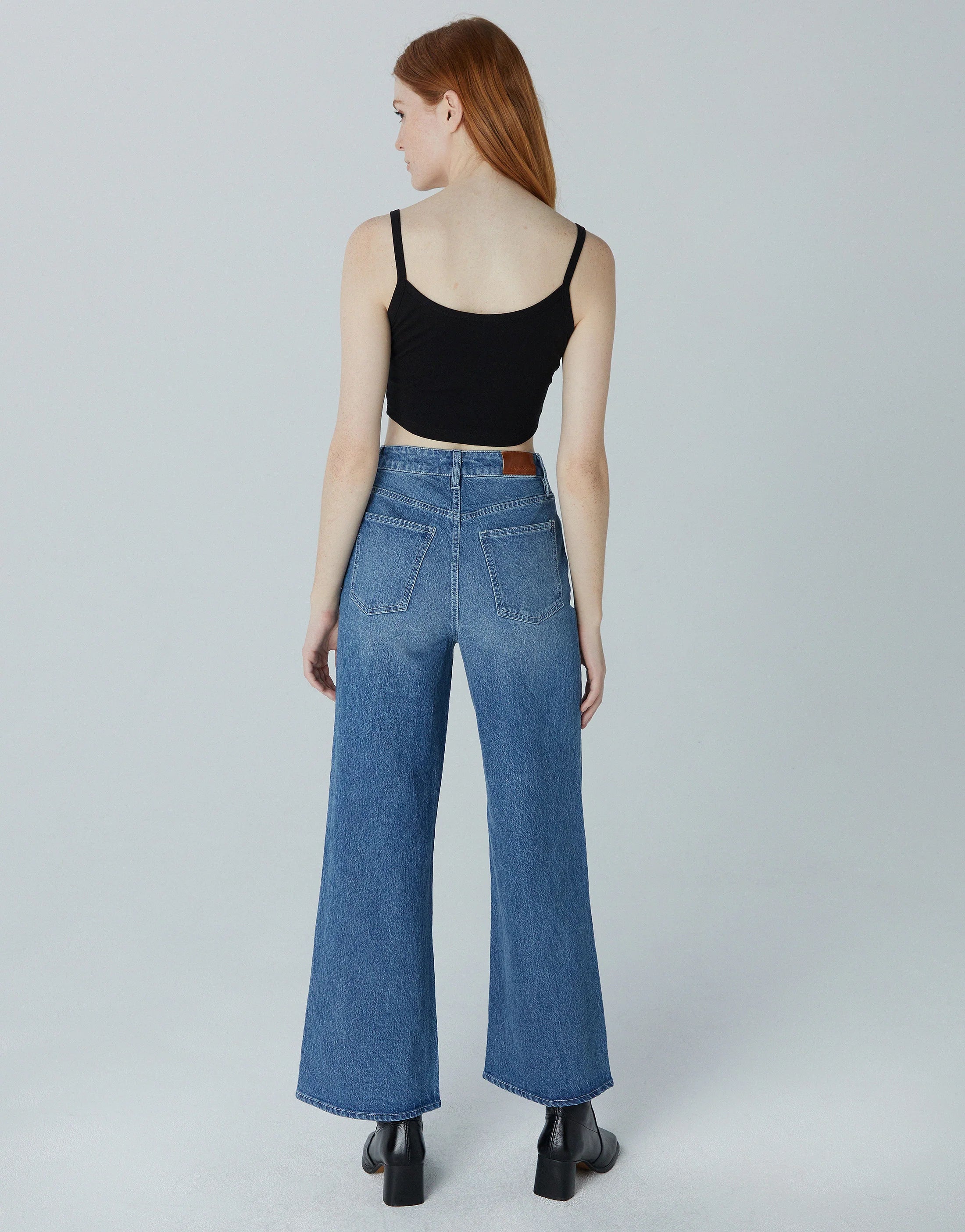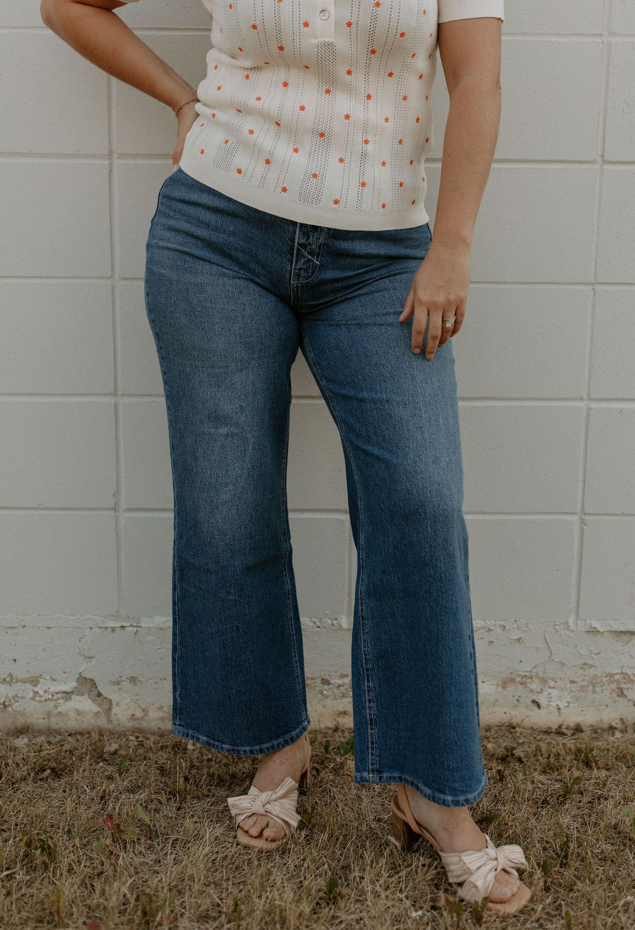 Our super high rise wide leg bell. Este sits at your natural waist and its relaxed at the hip and wide throughout the leg. Featuring 5 pocket styling. Fits true to size.