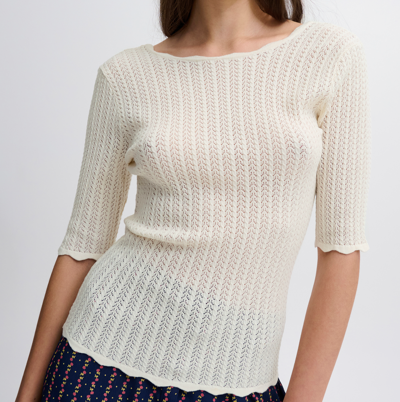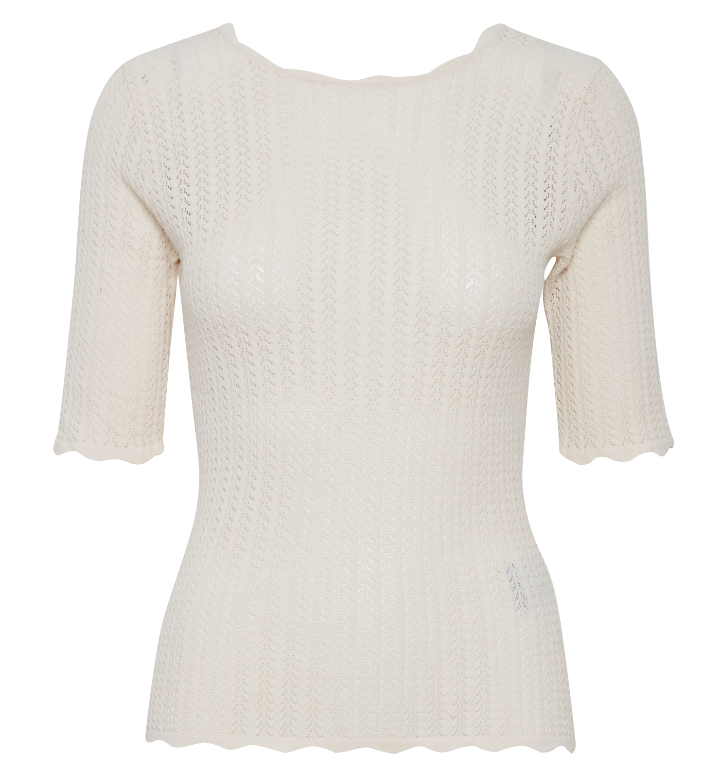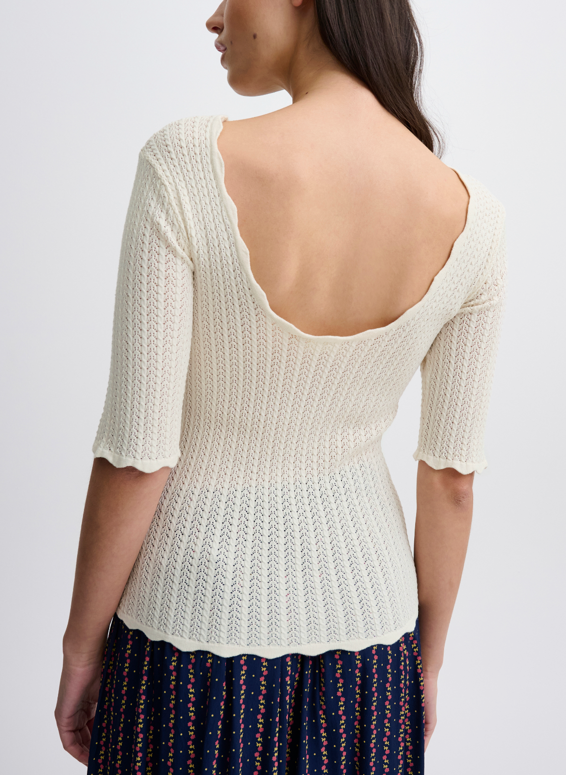 Scalloped edge sleeve pointelle detail scoop back tee. Stunning.