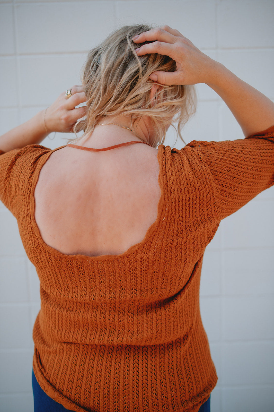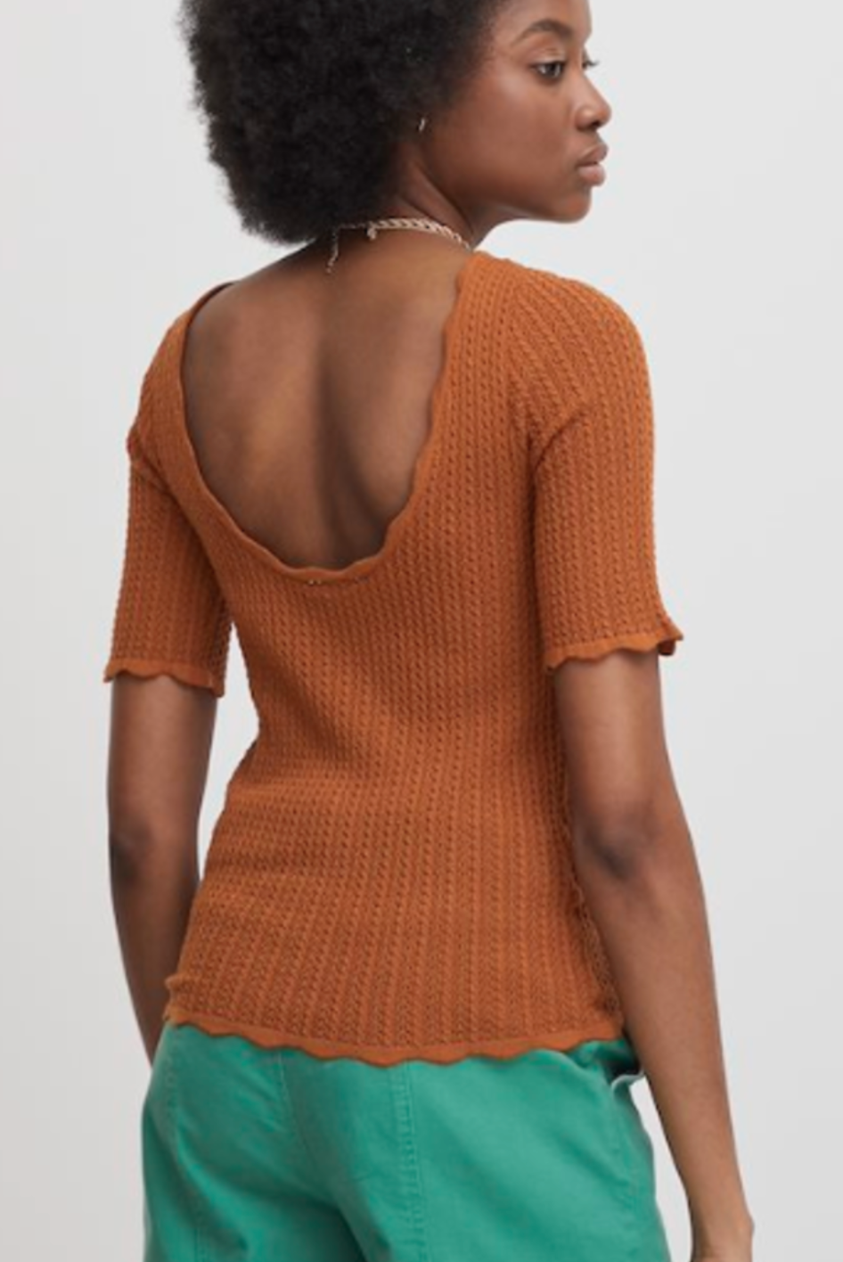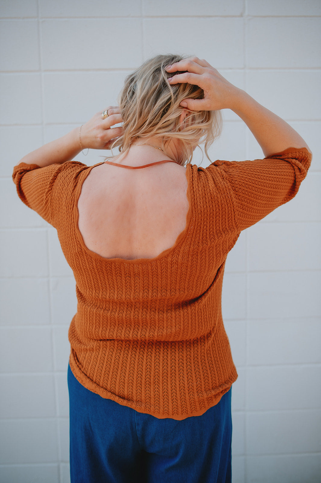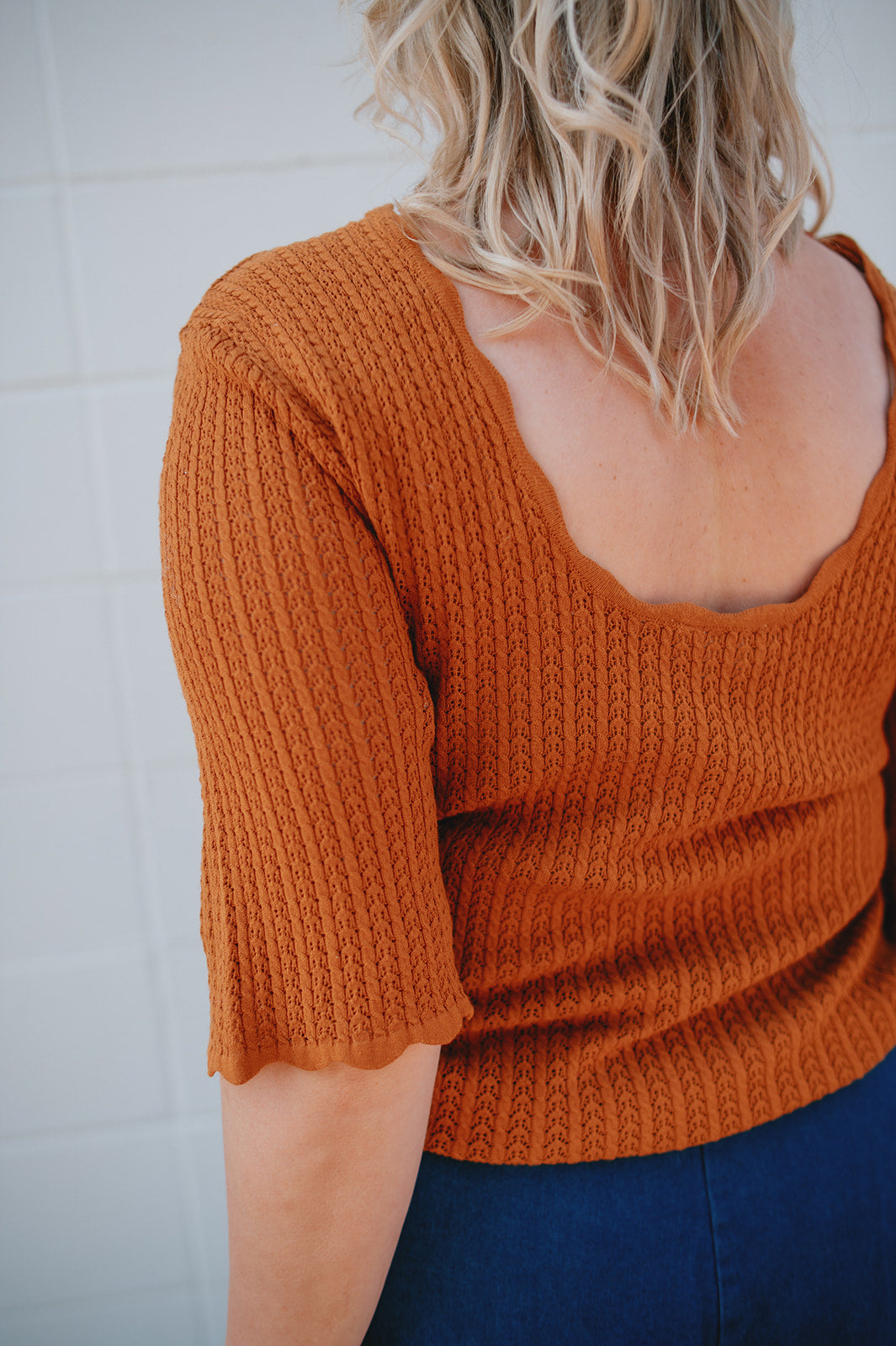 Scalloped edge sleeve pointelle detail scoop back tee. Stunning.