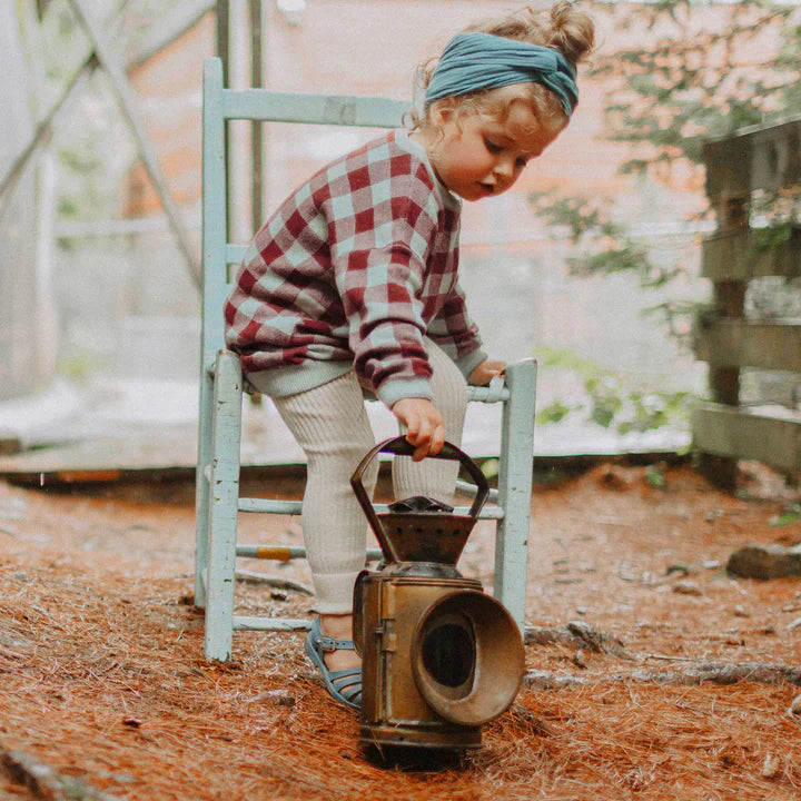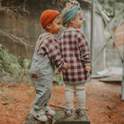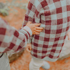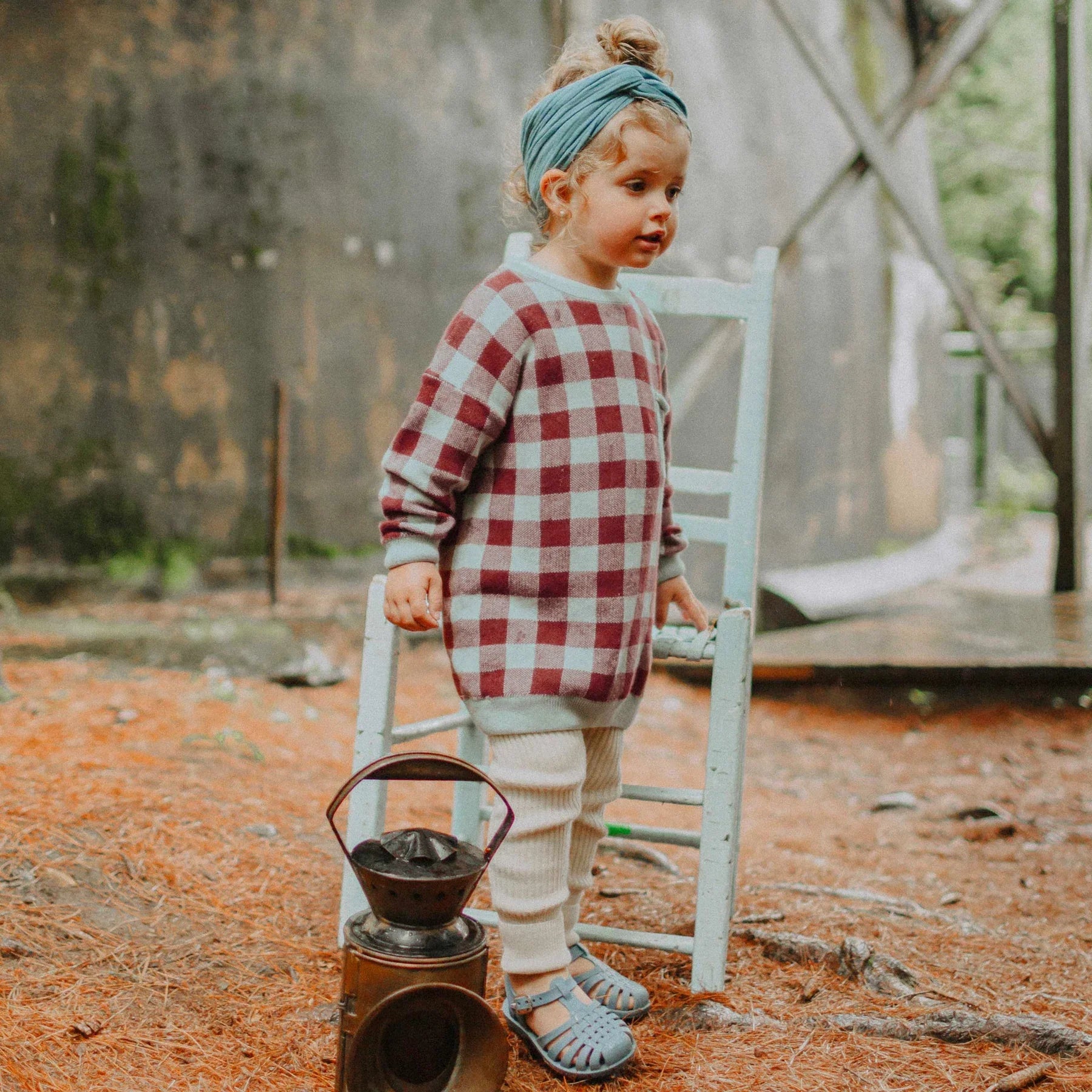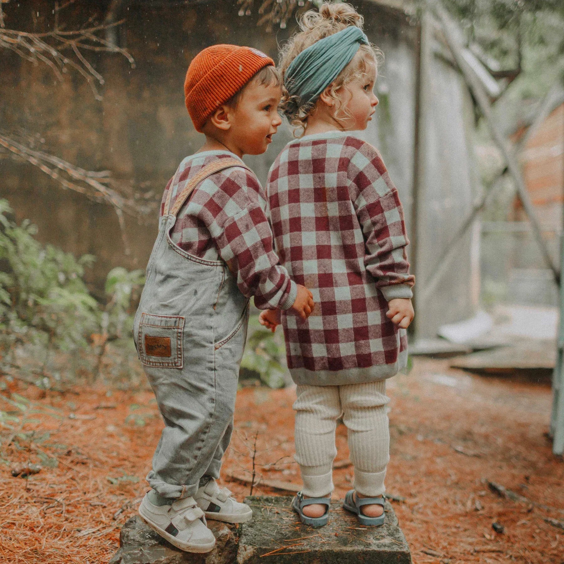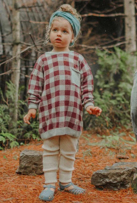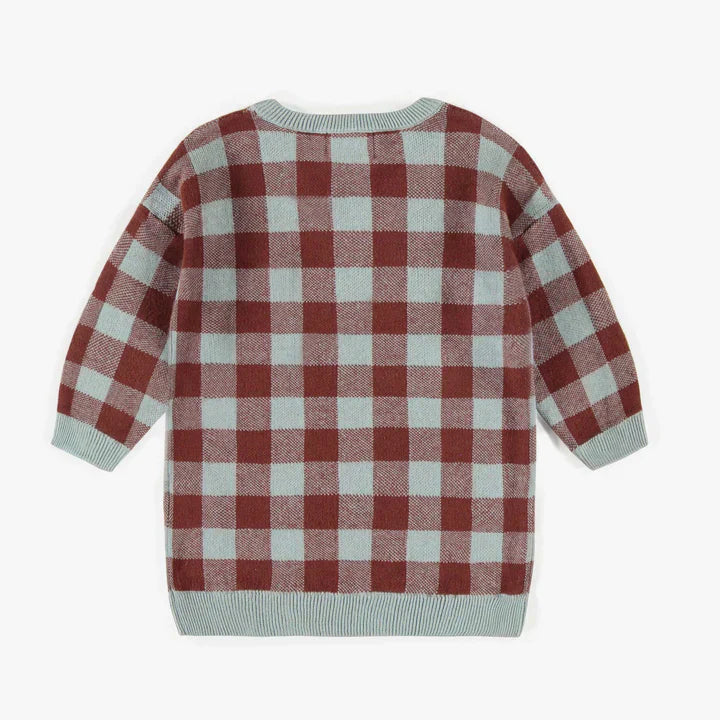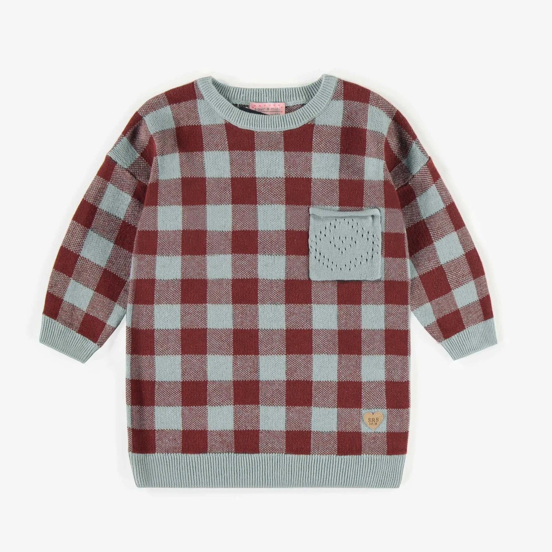 Loose-fitting long-sleeved dress with blue and rust plaid patterns made in a soft knit of linen and cotton.