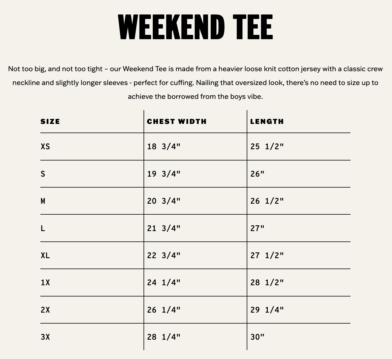 - An intentionally oversized tee, made from a heavier loose knit cotton jersey with a classic crew neckline and slightly longer sleeves - perfect for cuffing. Made to fit you big, there’s no need to size up to achieve your borrowed from the boys look.