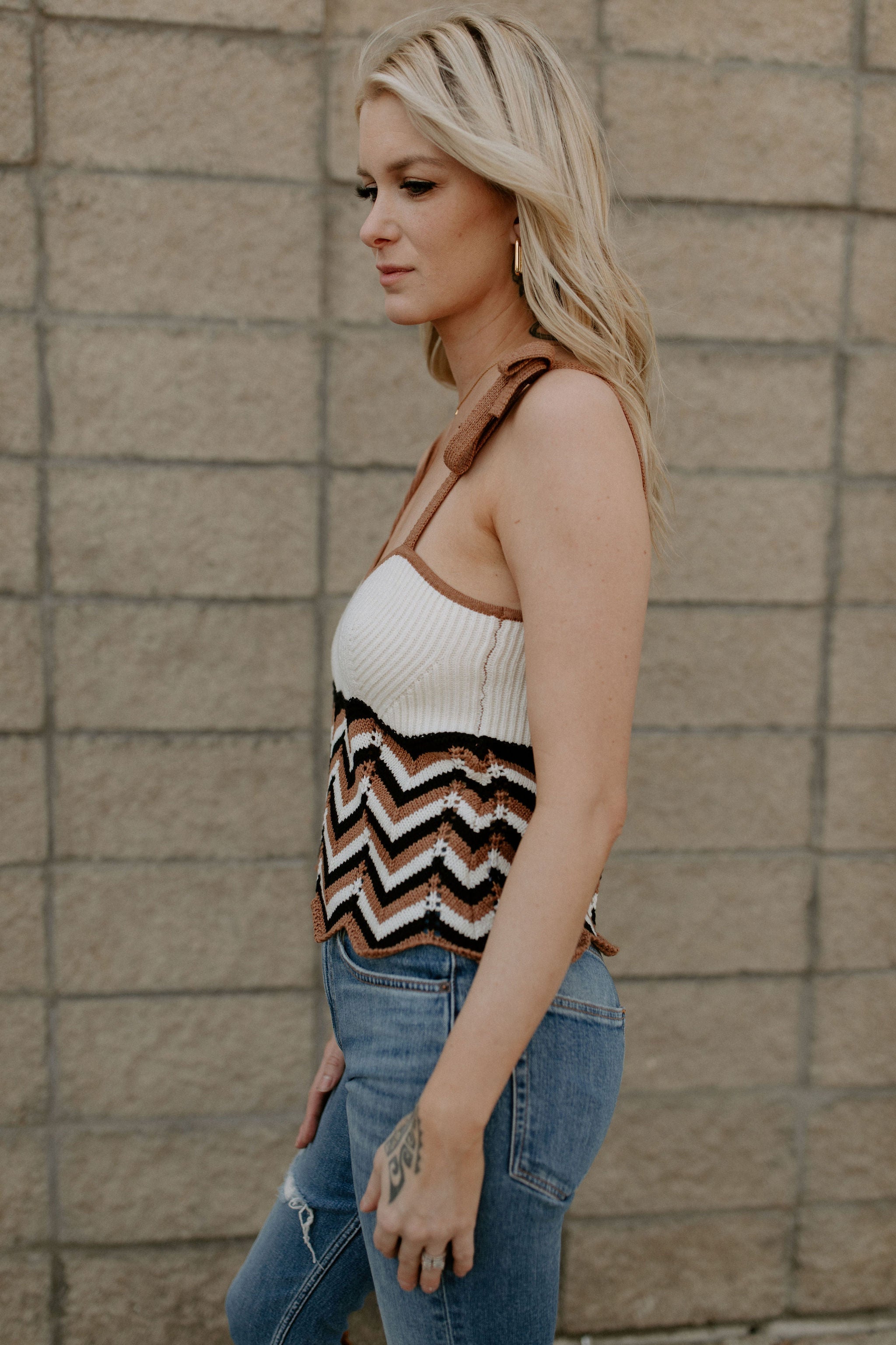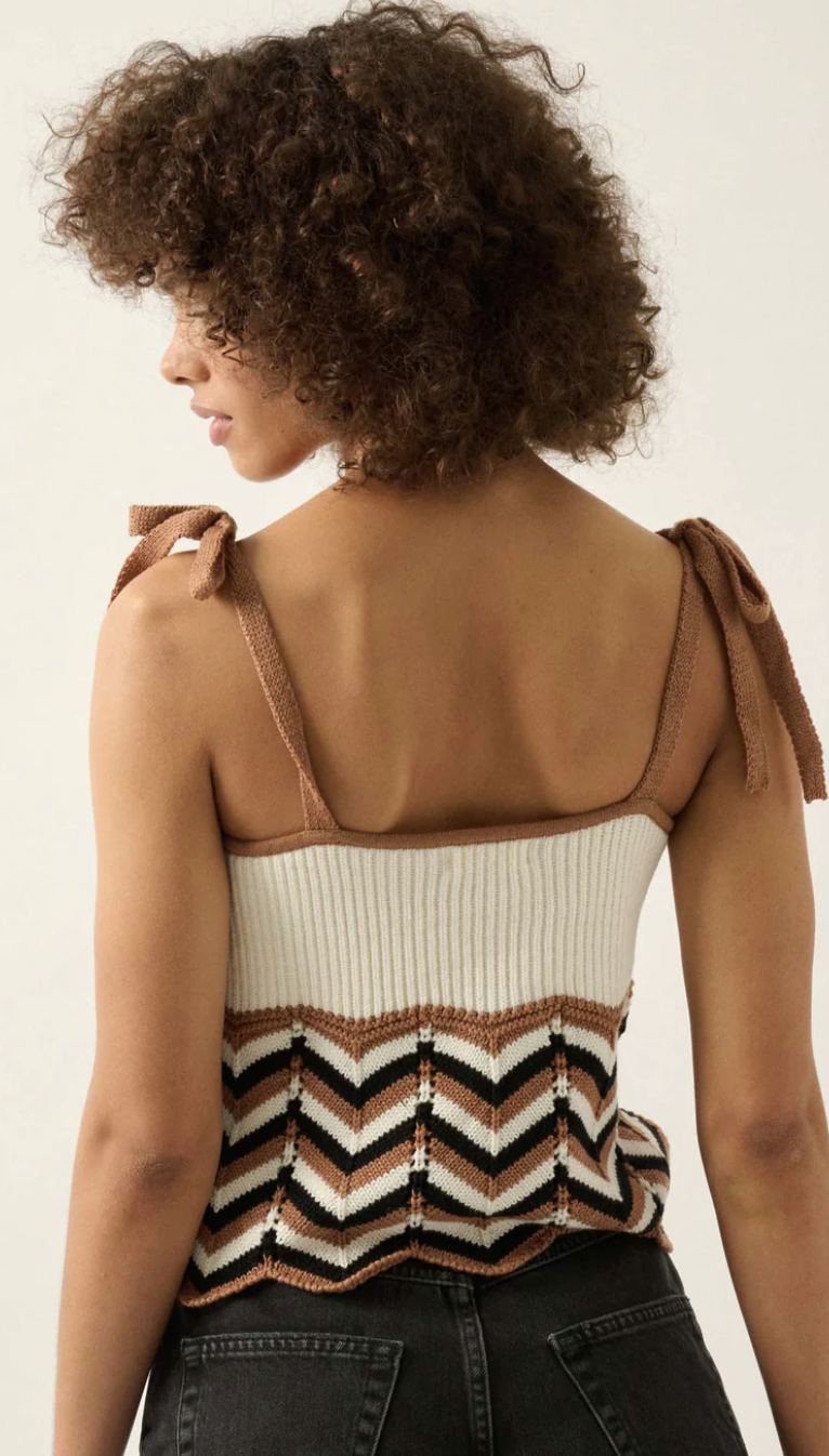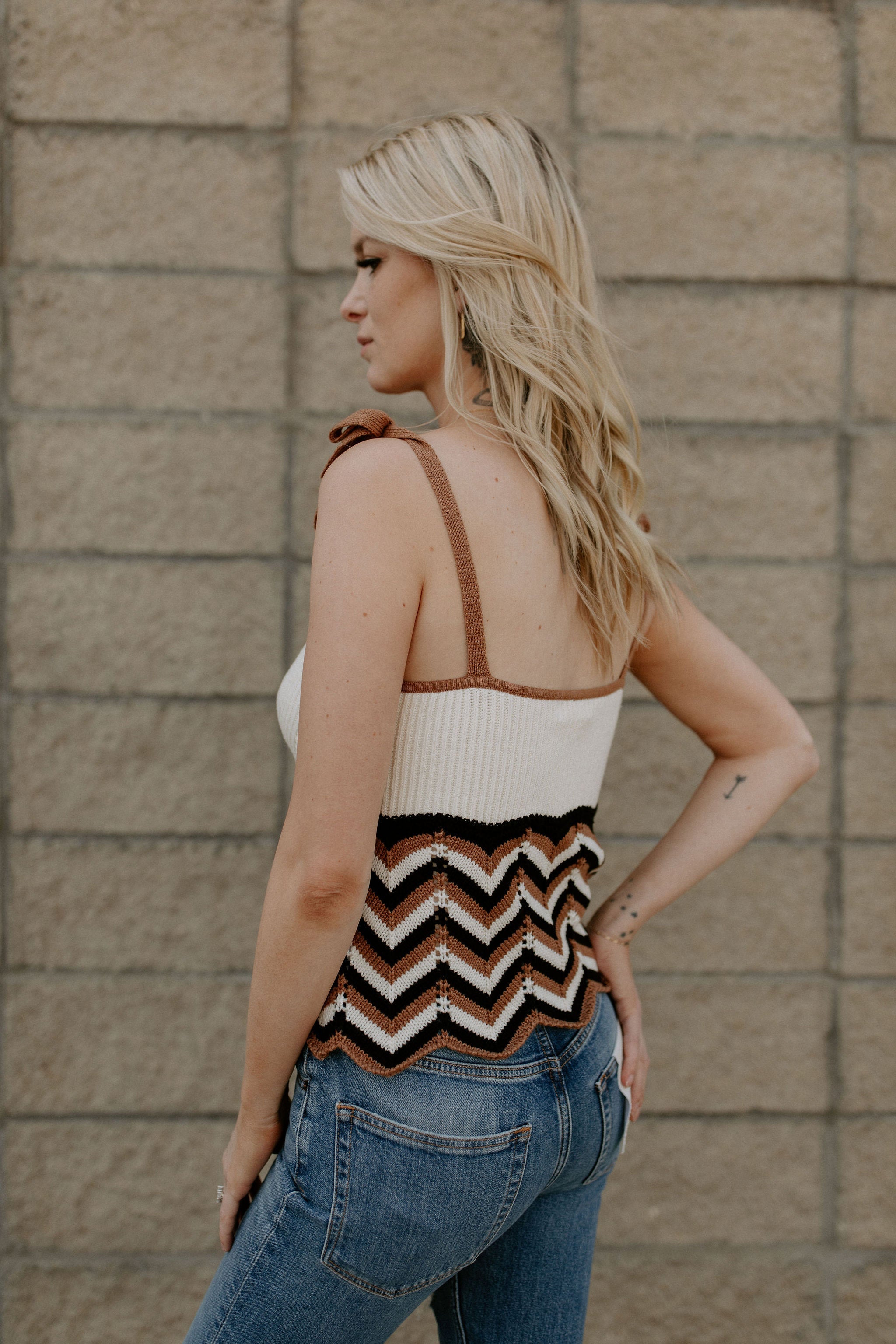 Summer festival ready! A super cute crochet knit tank top for the warm weather that was made to dance in! Adjustable tie straps, with a unique chevron striped pattern throughout. But the best part? That AMAZING zigzag hem!!! Unique and utterly adorable.