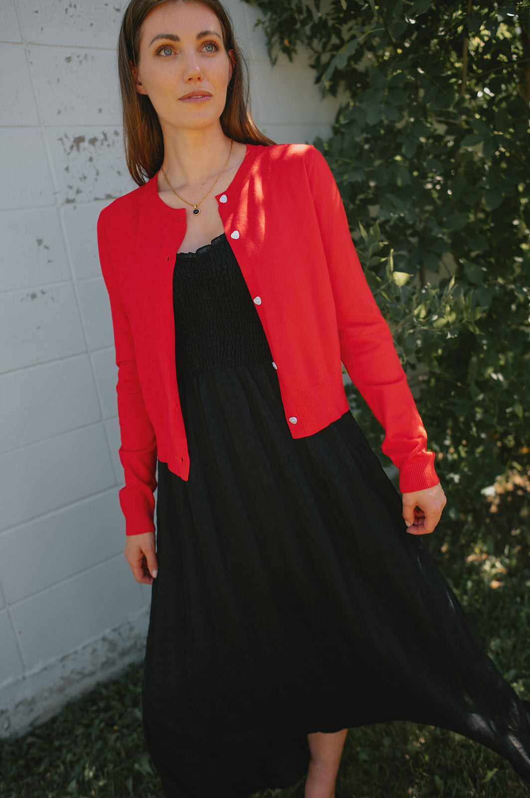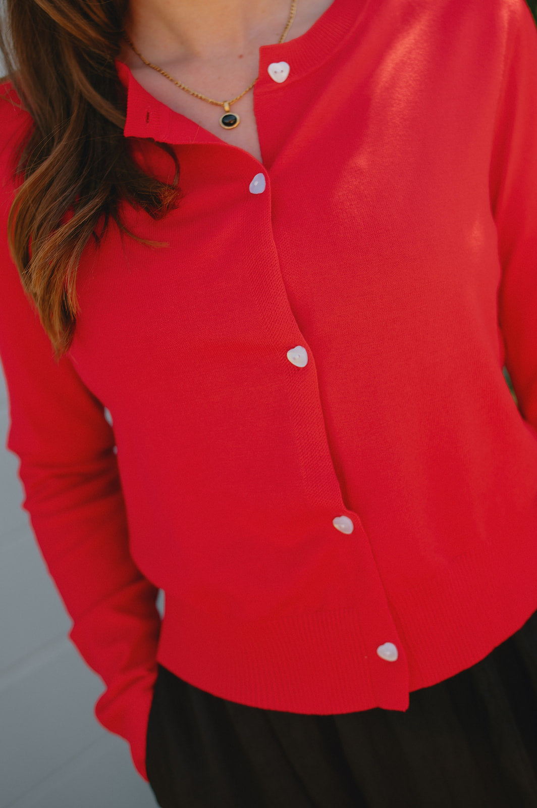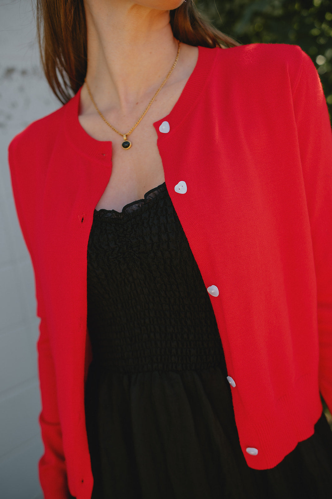 The standout detail? Delicate heart-shaped buttons that add a playful, romantic touch to this classic silhouette. With long sleeves and a flattering, slightly fitted cut, it’s perfect for layering over camisoles, tees, or dresses all year round.