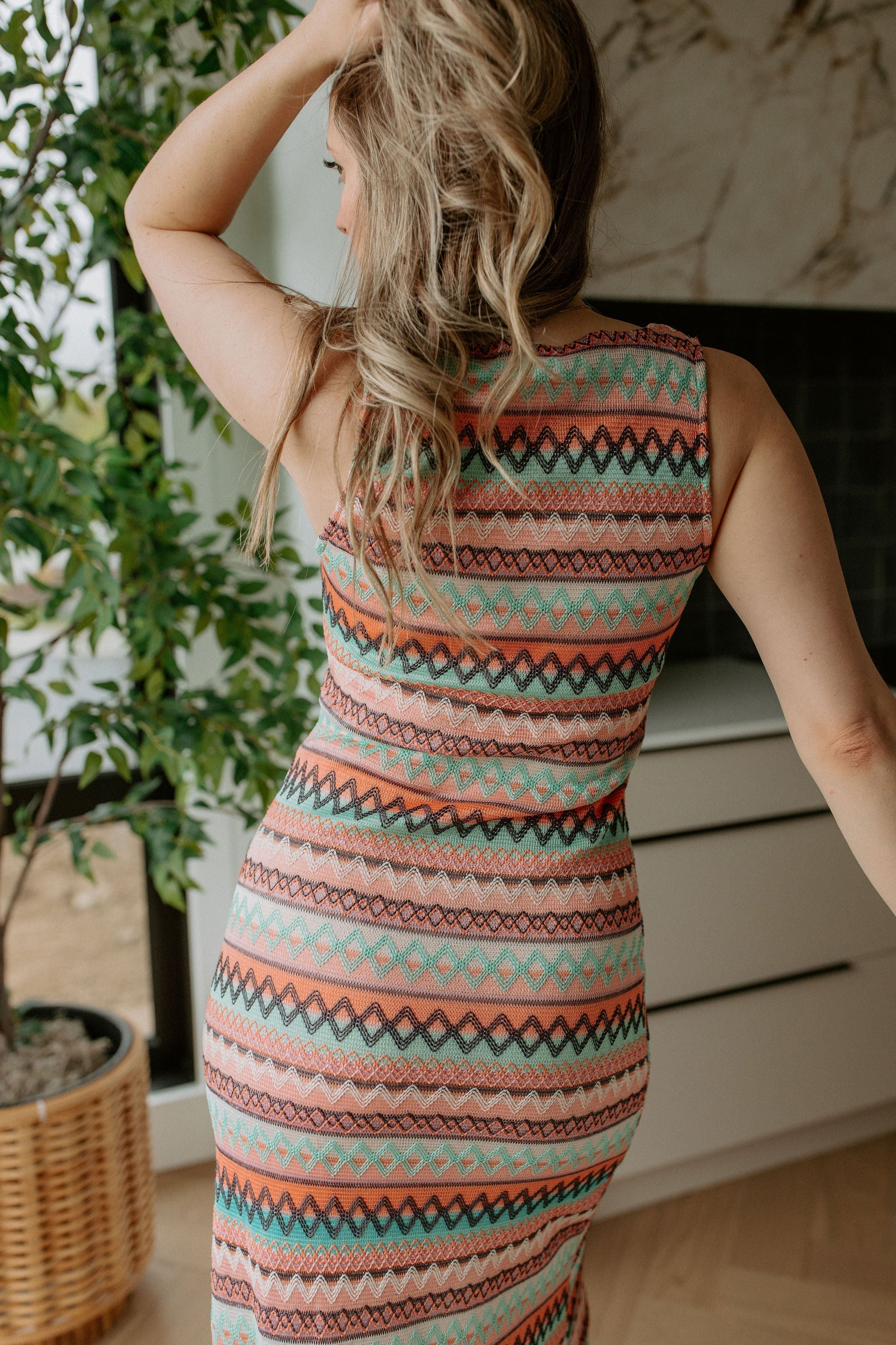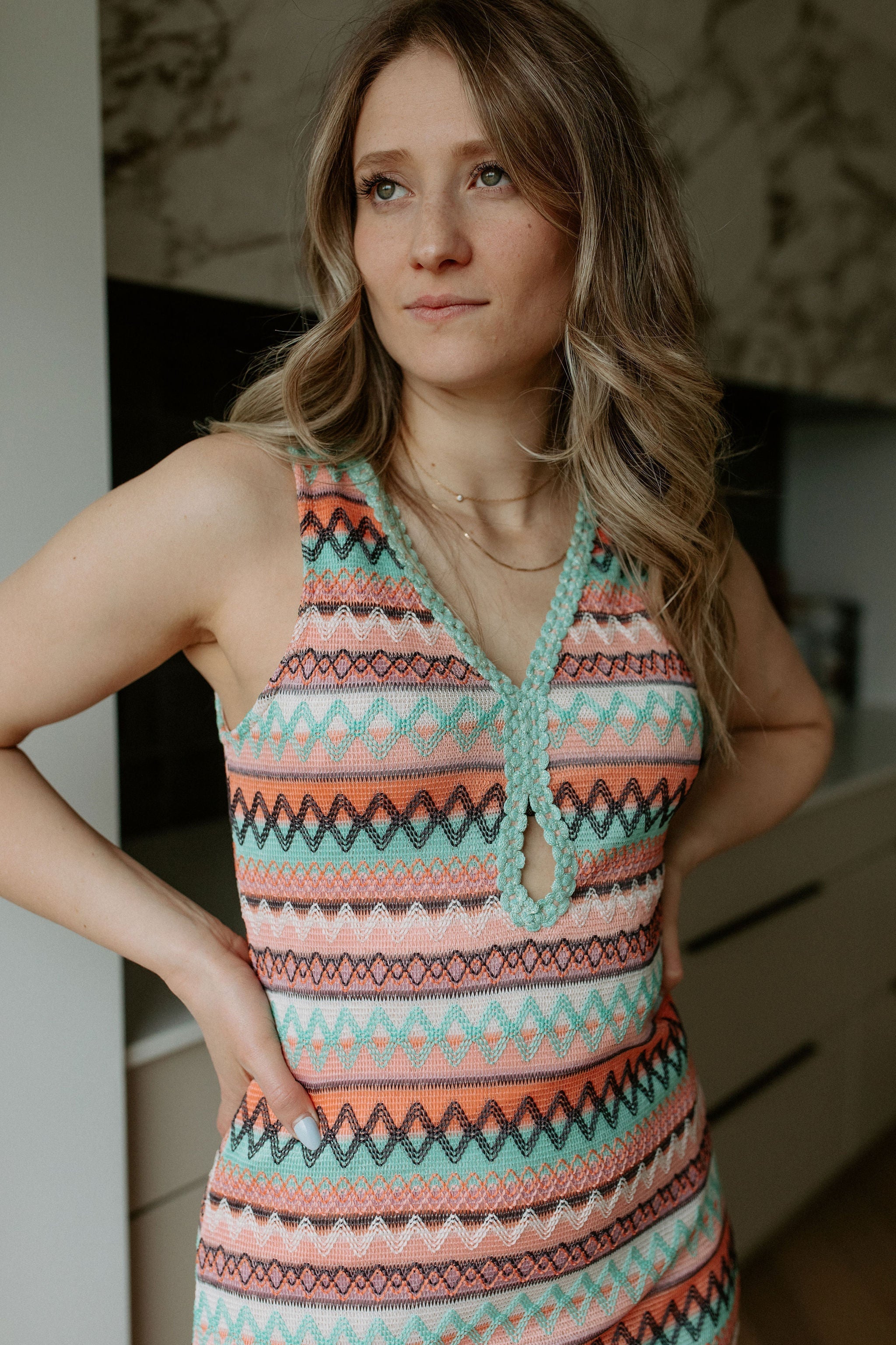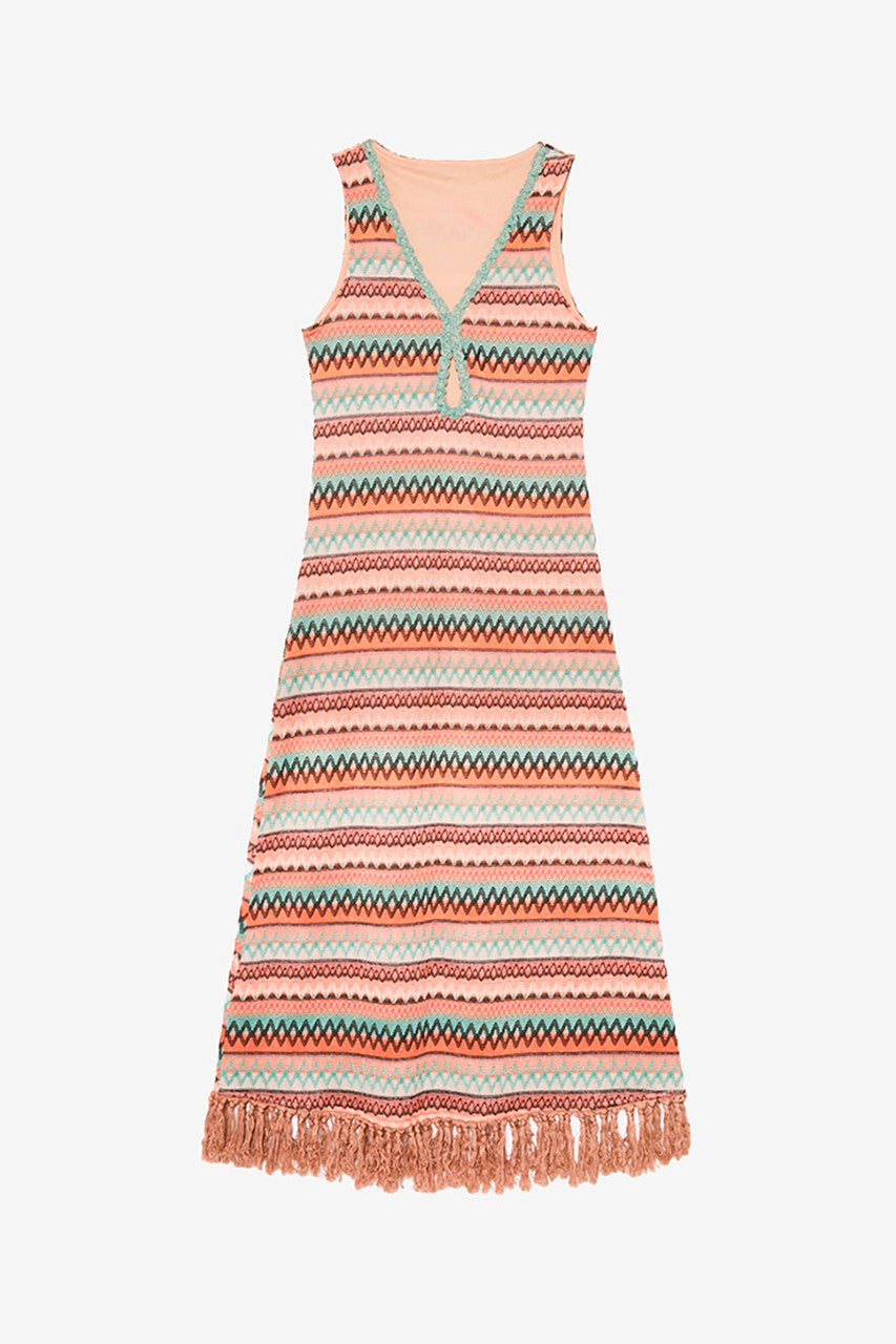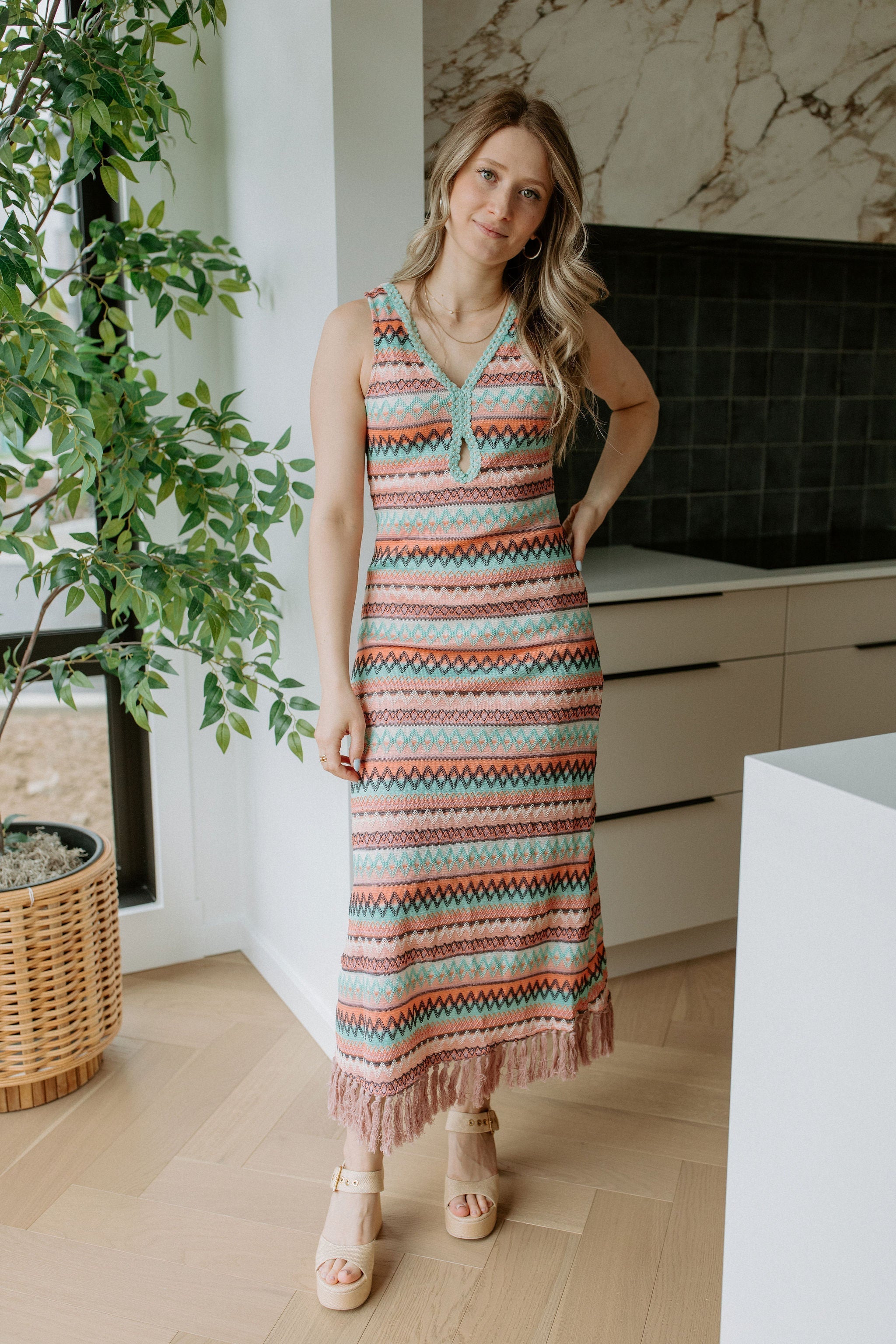 The Samay Textured Fringe Maxi Dress is a long striped dress featuring a braided design at the neckline and a fringed hem. With a knit texture on the outer layer and a lined interior, it combines comfort with unique style.