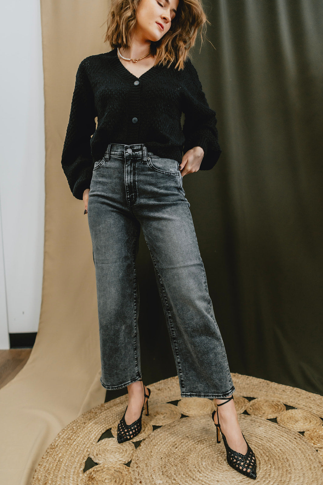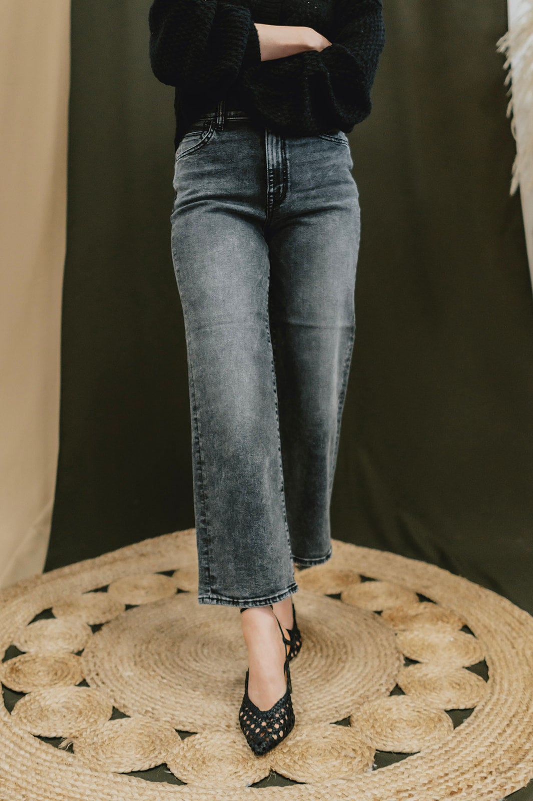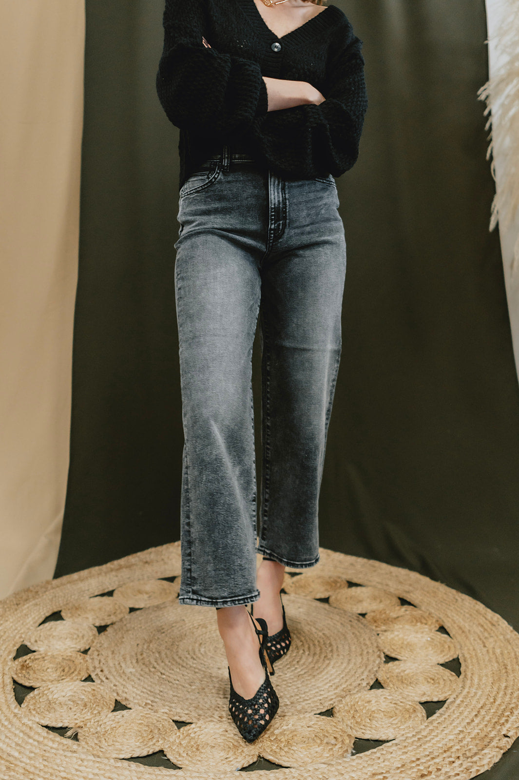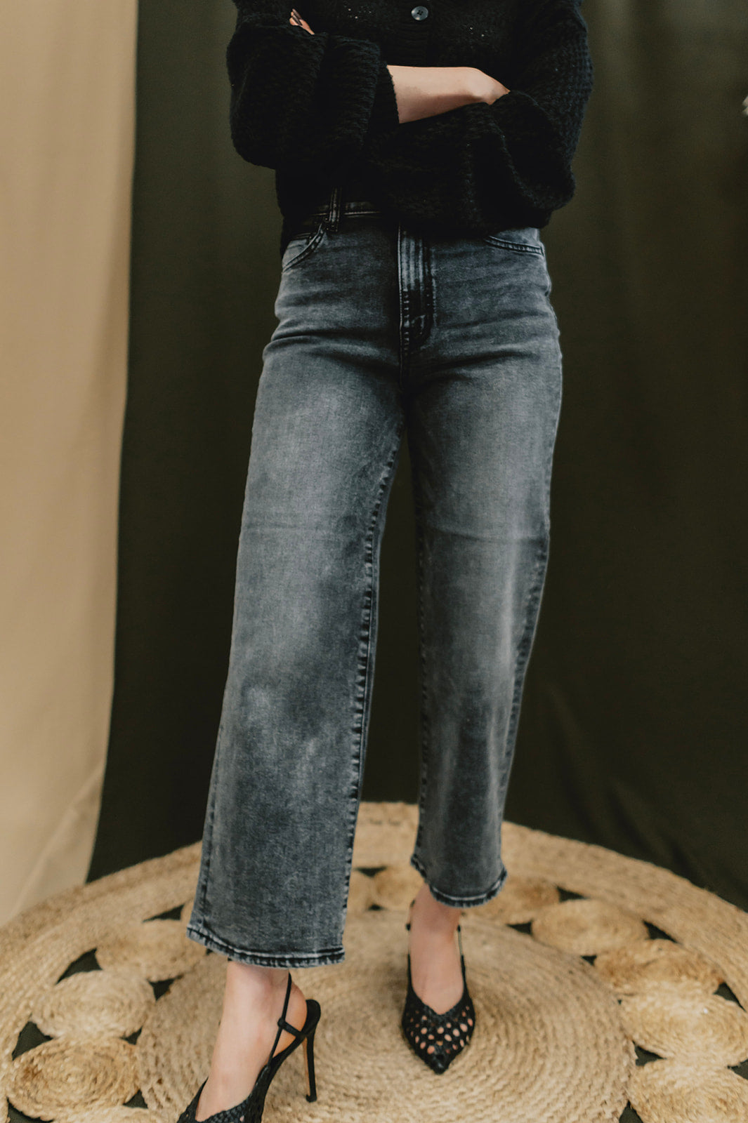 Hints of black peek through the faded grey wash of these stretchy, cropped wide-leg jeans to bring a retro edge to your look.
