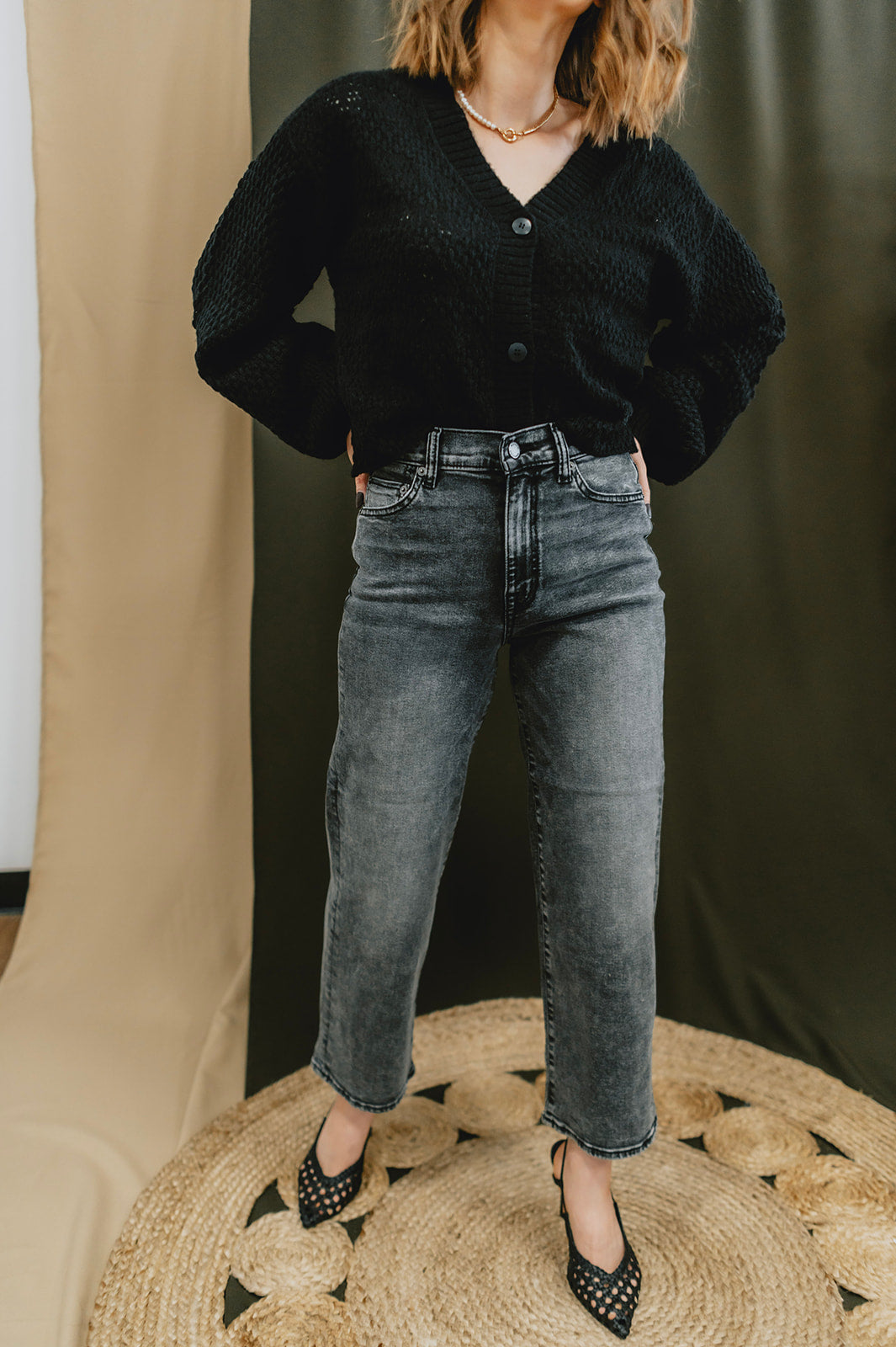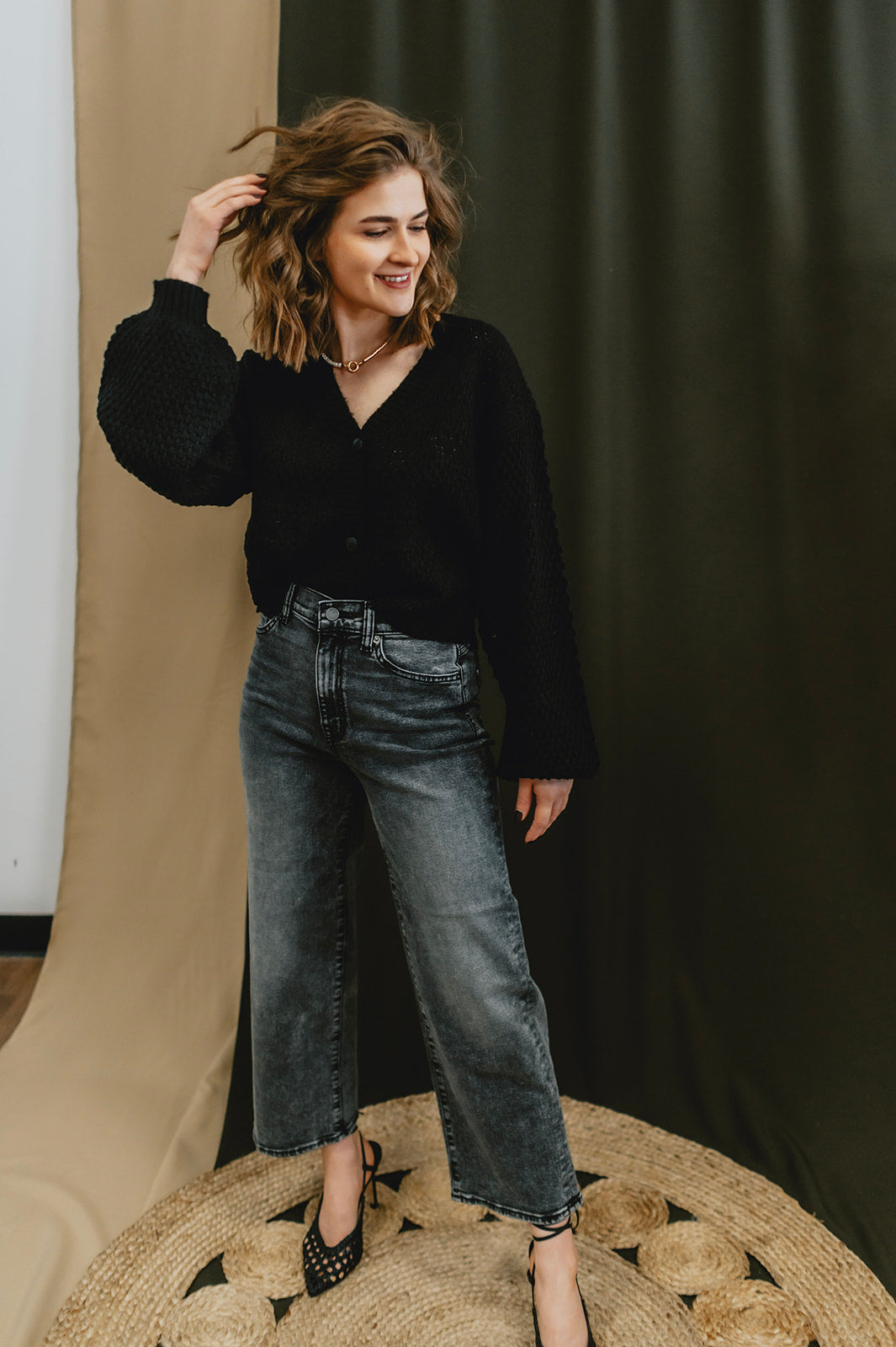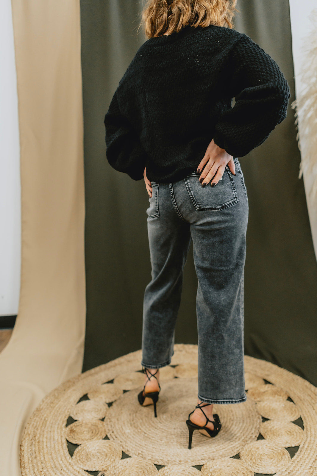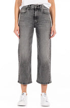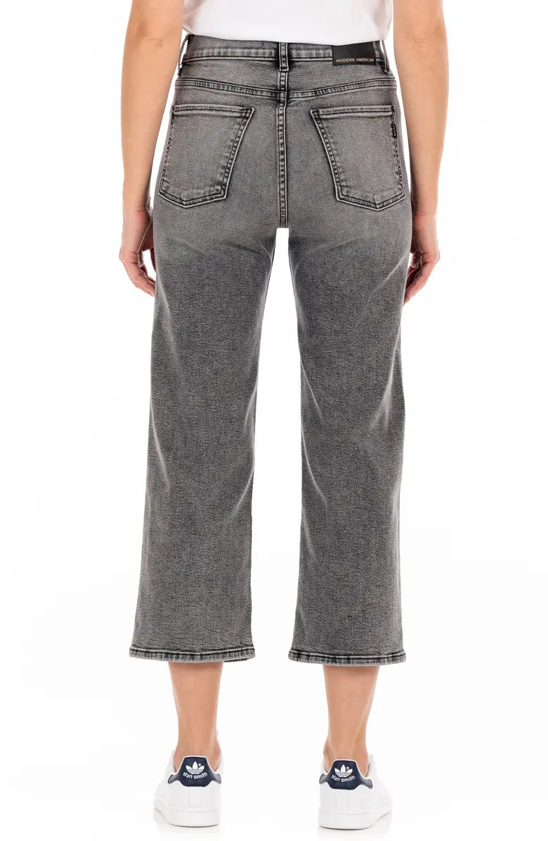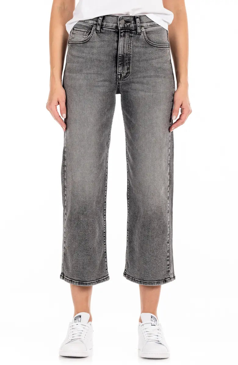 Hints of black peek through the faded grey wash of these stretchy, cropped wide-leg jeans to bring a retro edge to your look.