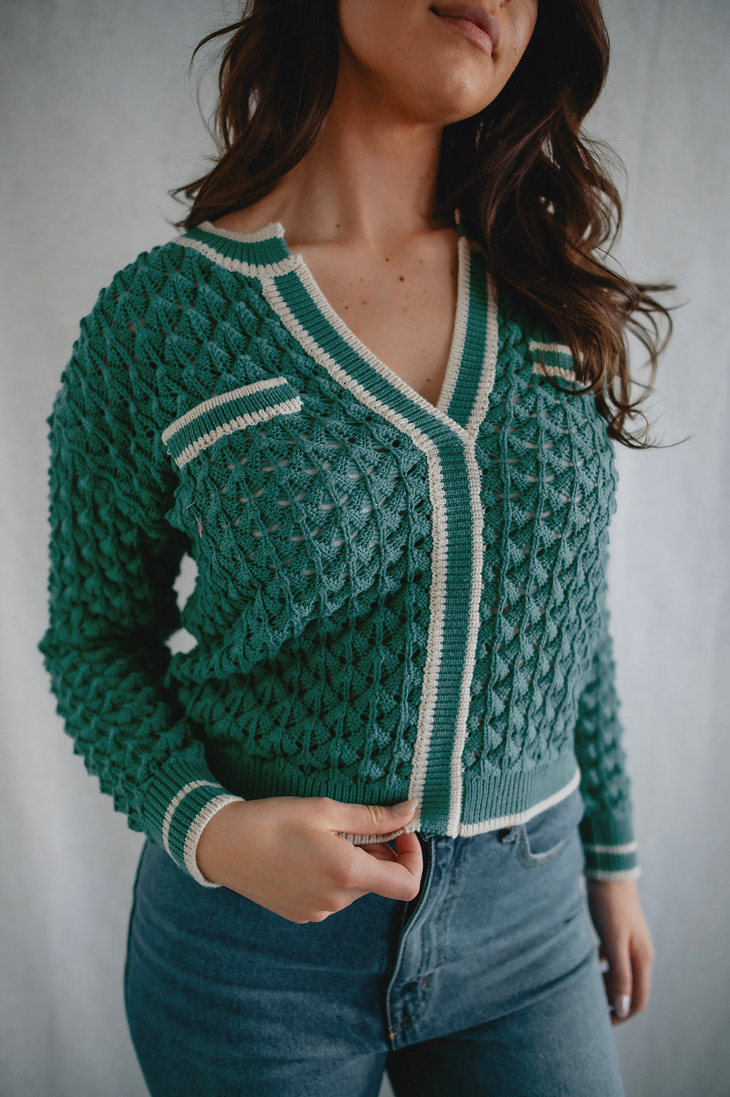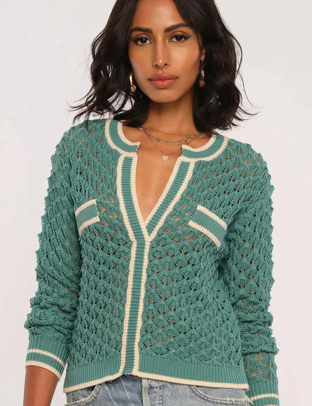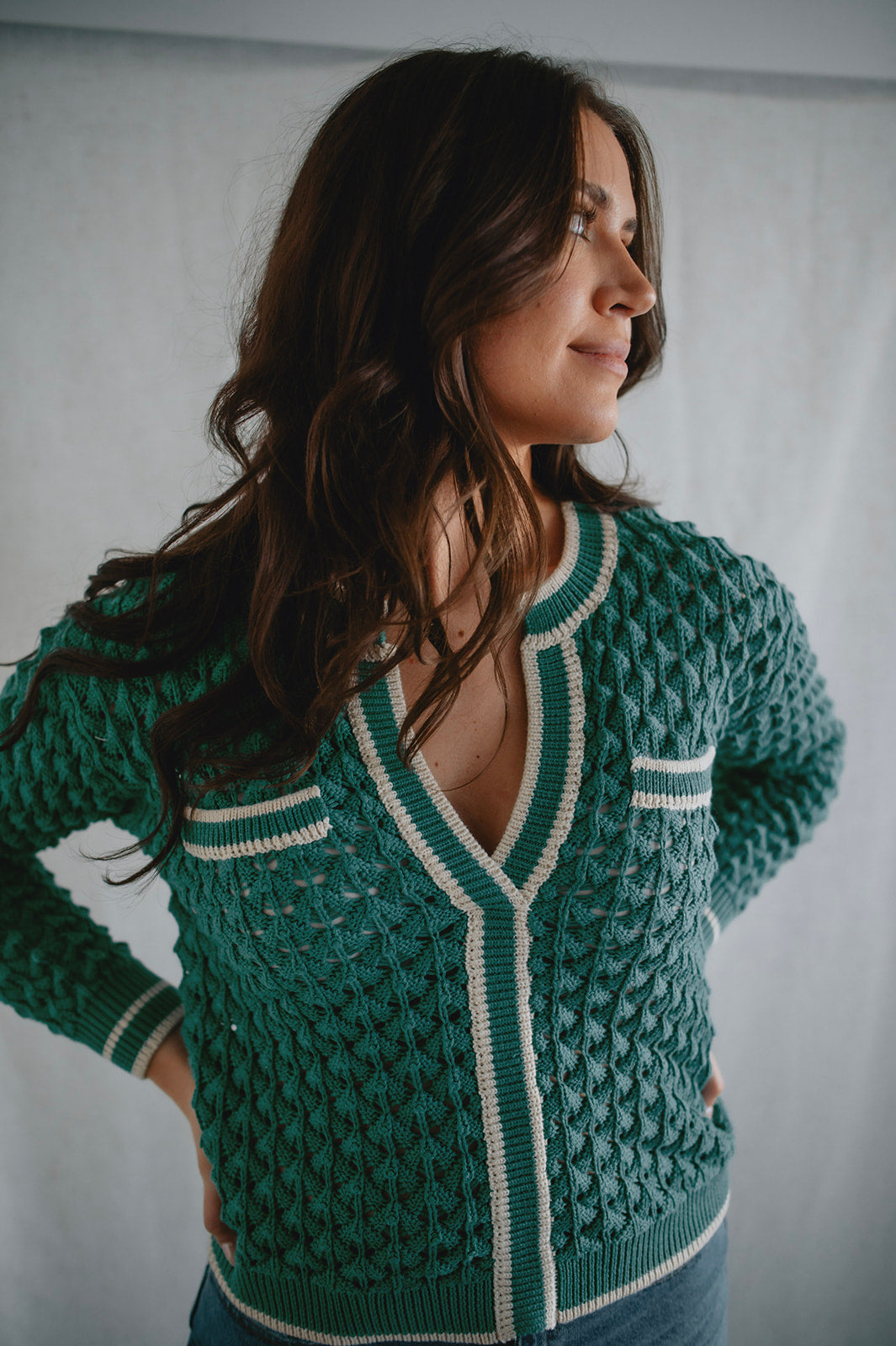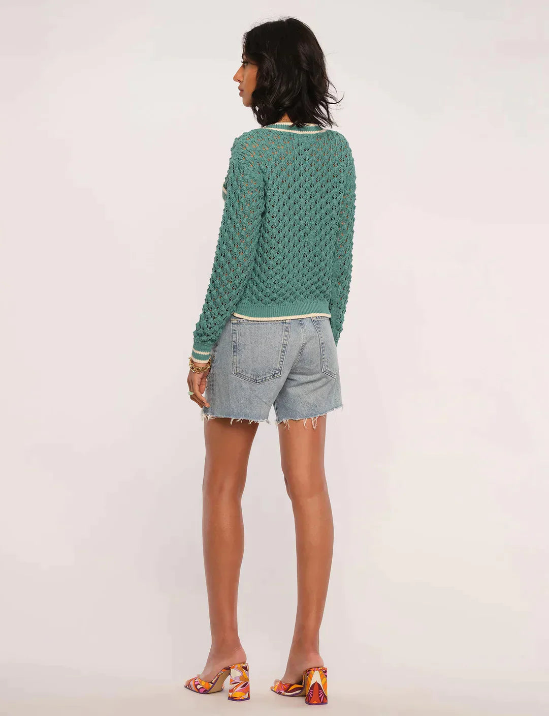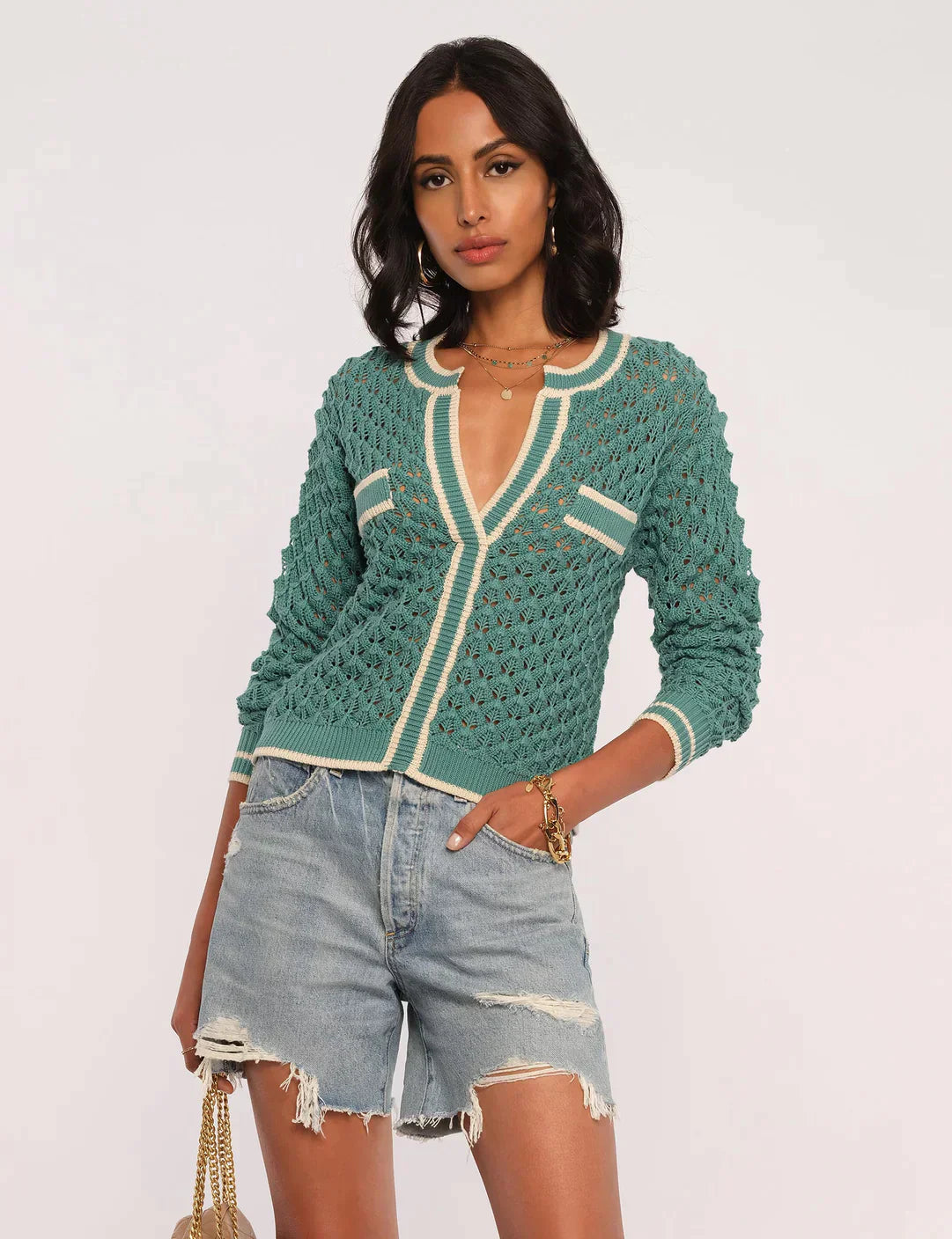 The Sybil Sweater has a relaxed fit with airy light pointelle stitch detailing. It has a sporty striped ribbed hem and a vintage-inspired v-neck detail. Pair it with your favourite cut-offs and sandals.