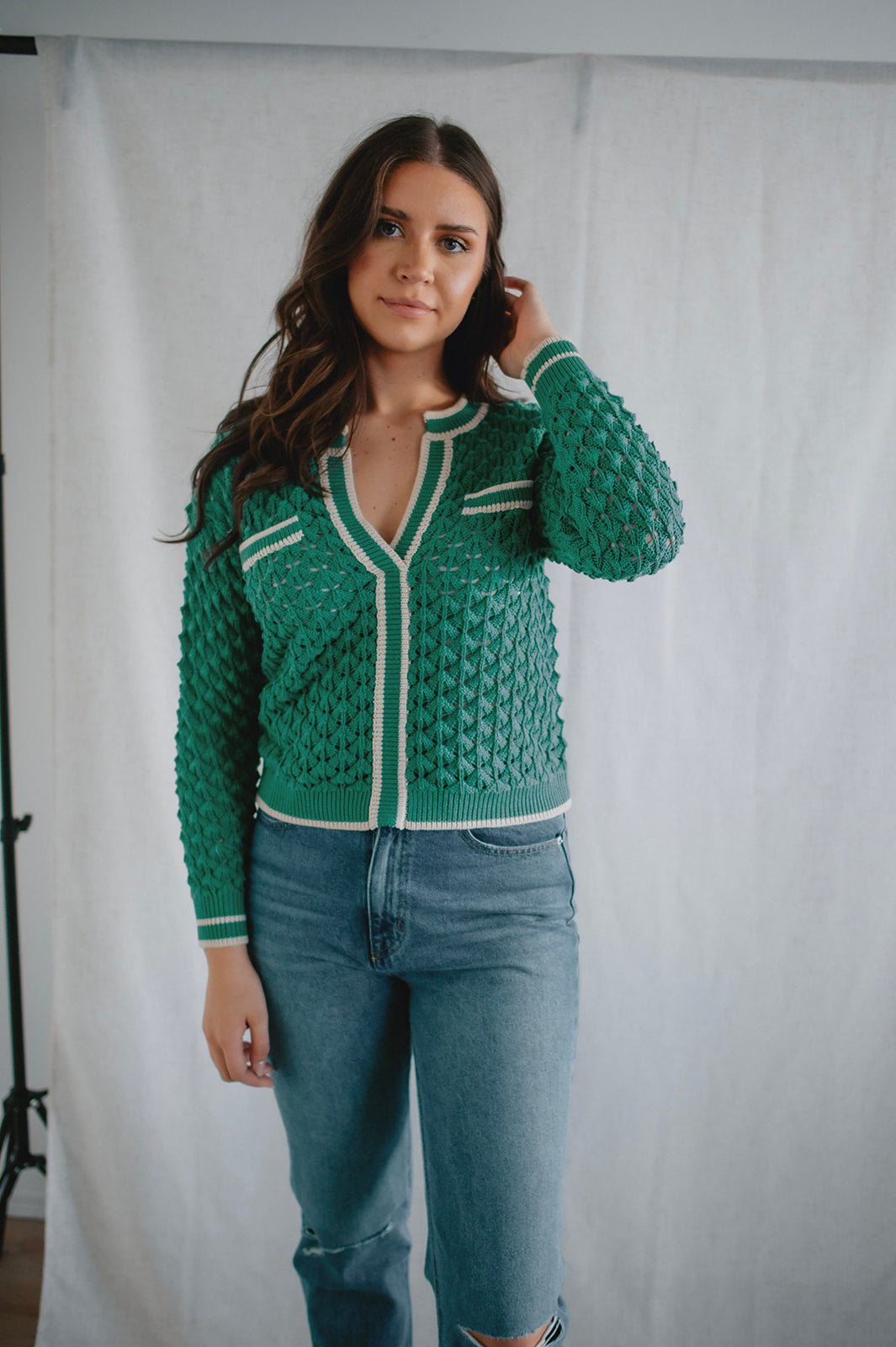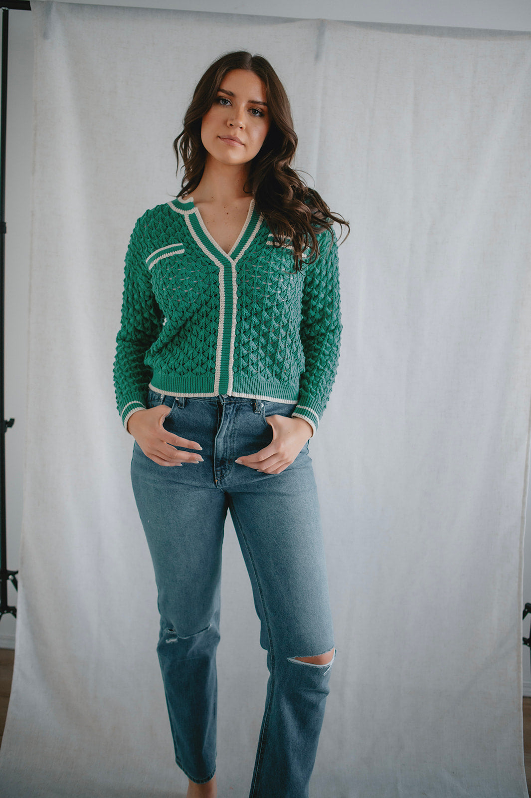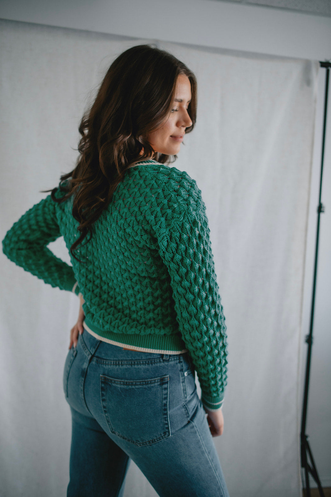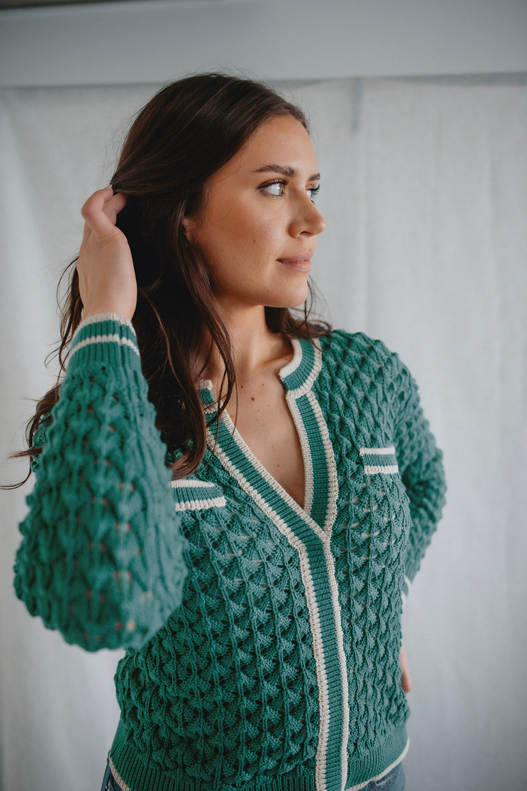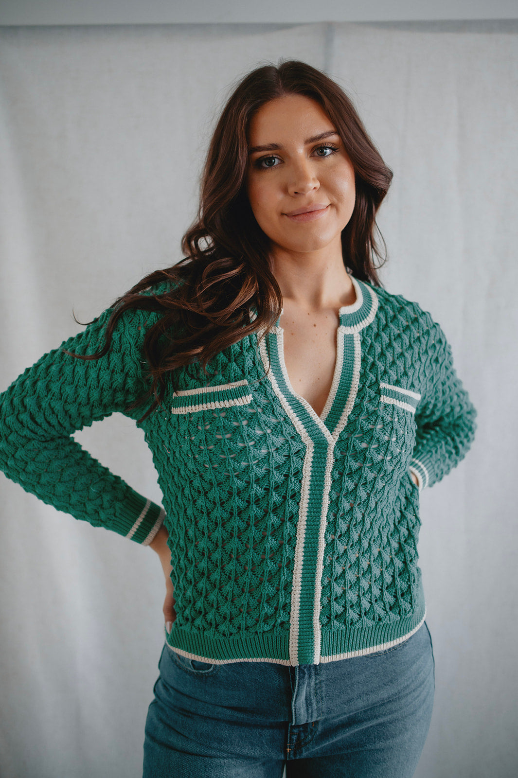 The Sybil Sweater has a relaxed fit with airy light pointelle stitch detailing. It has a sporty striped ribbed hem and a vintage-inspired v-neck detail. Pair it with your favourite cut-offs and sandals.