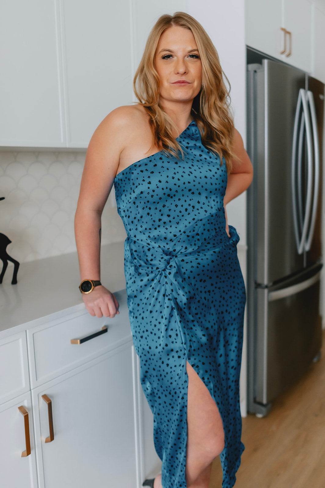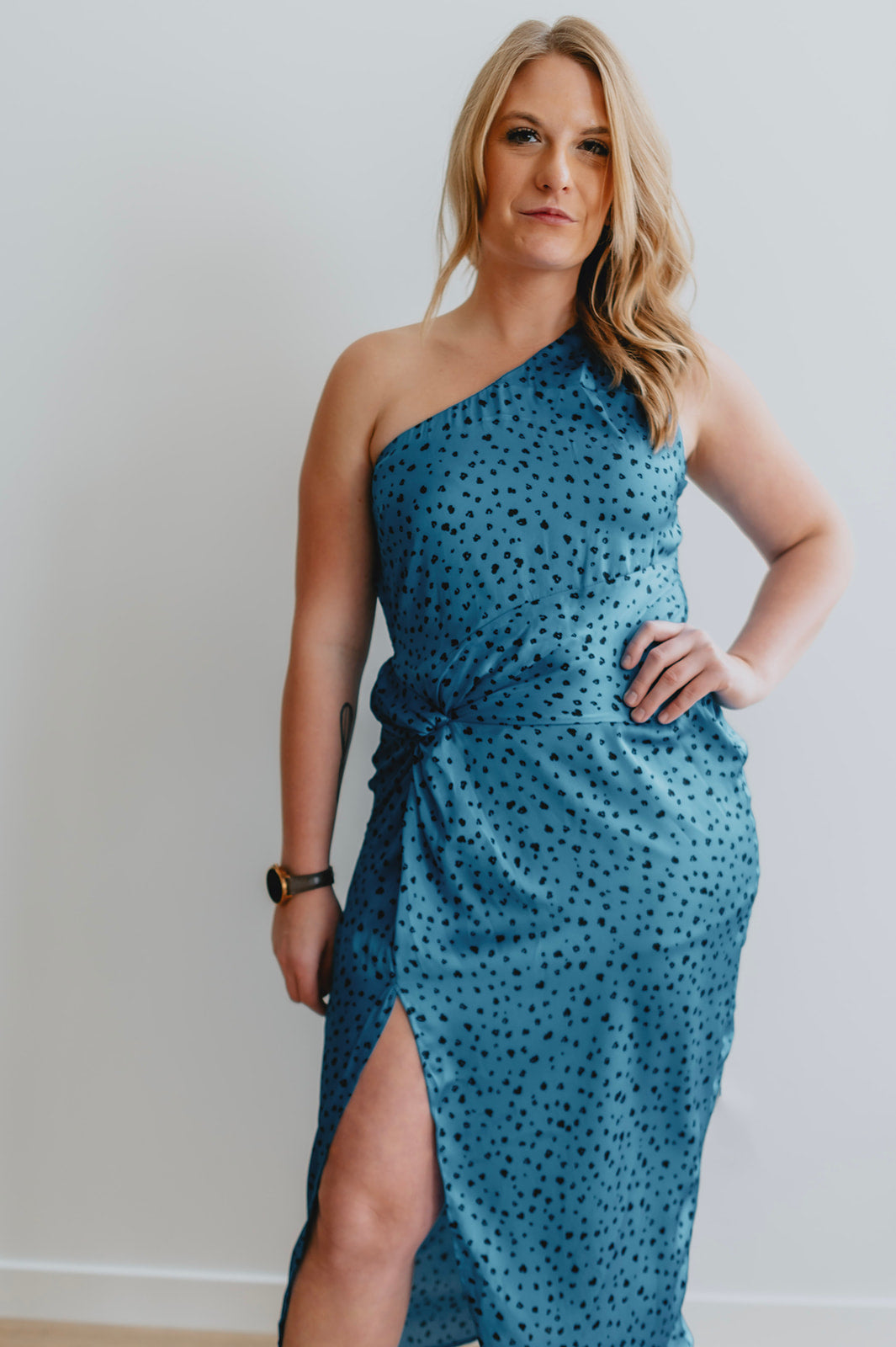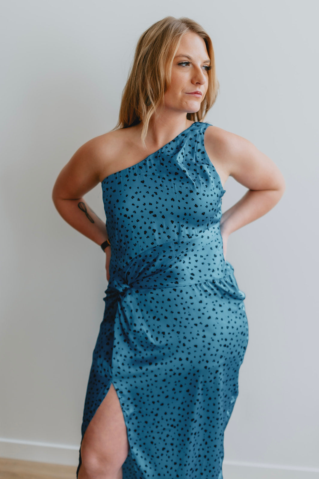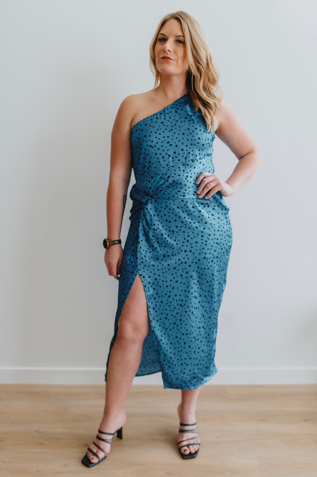 The Robin Dress is cut from our silky printed satin and is effortlessly sexy. It has a off-the-shoulder neckline and a side slit to show off your skin. The wrap bodice is perfect for accentuating your figure.