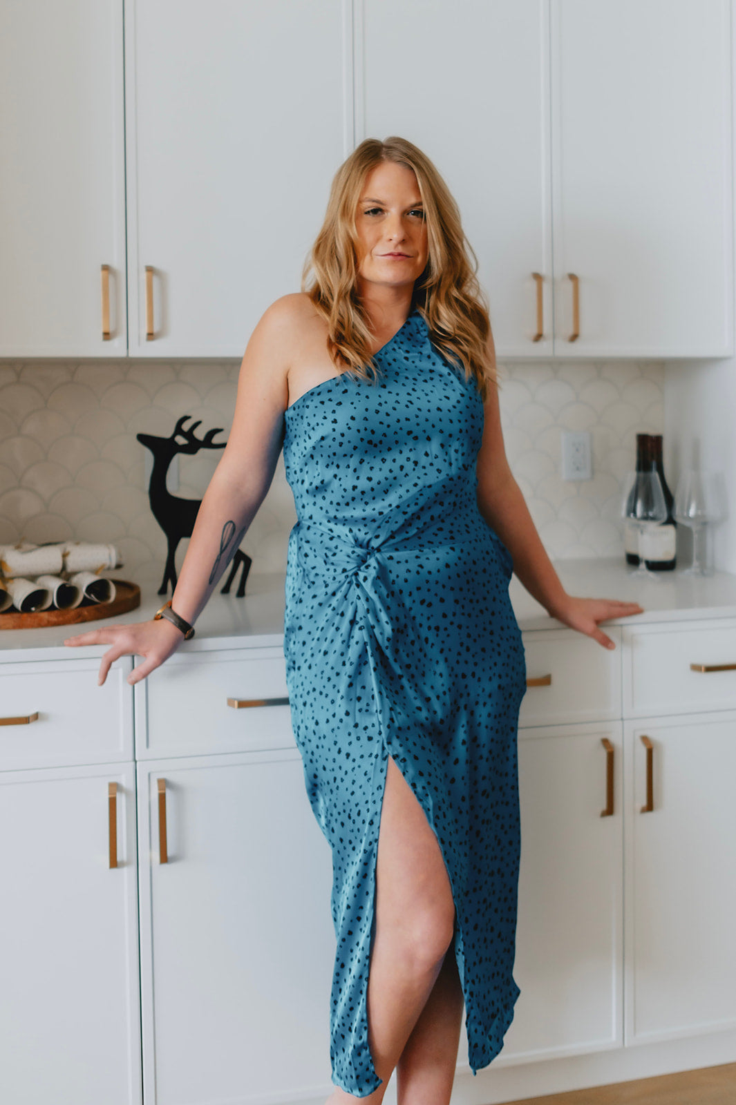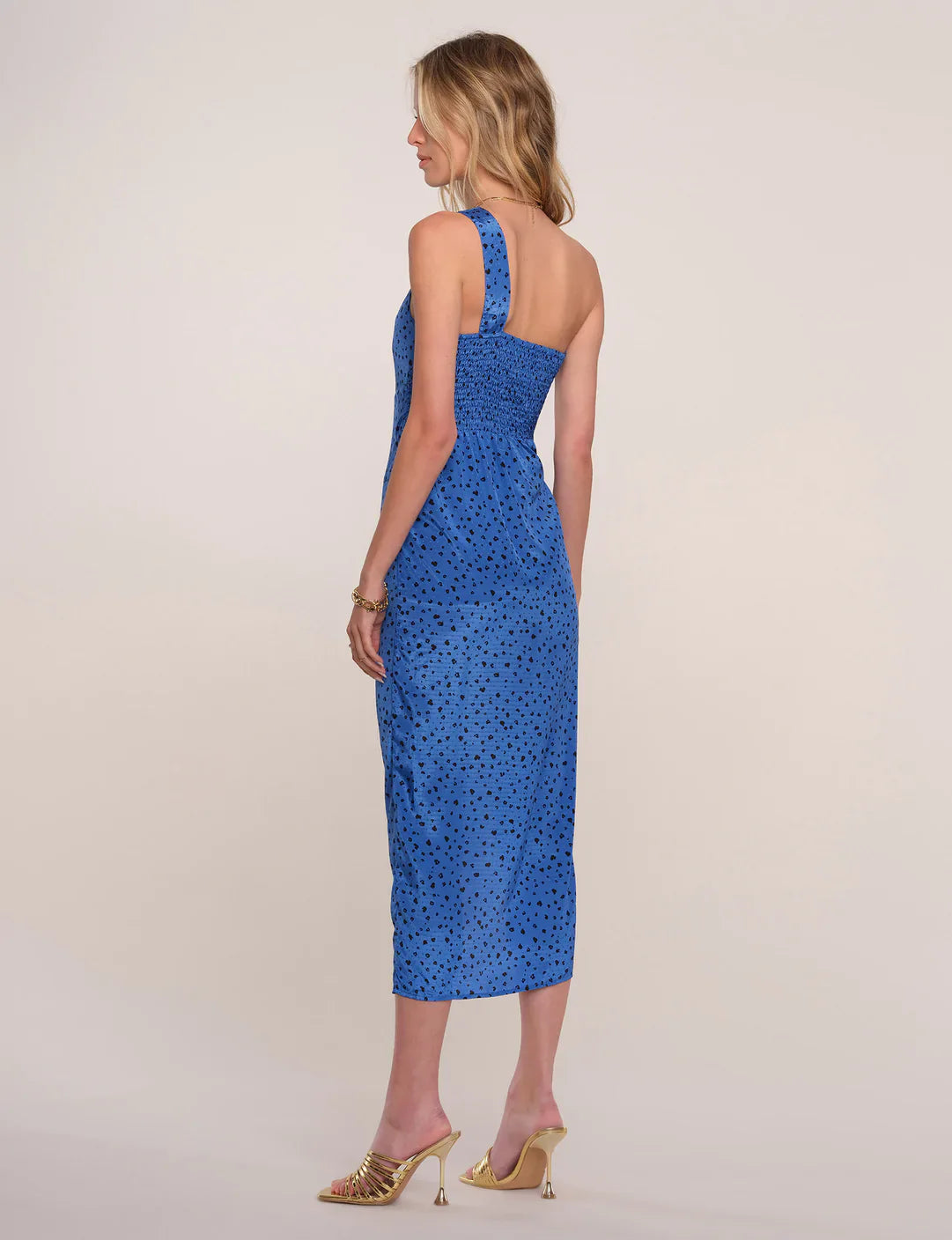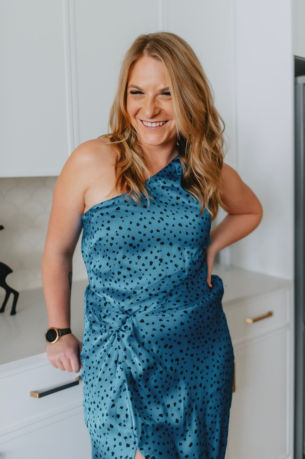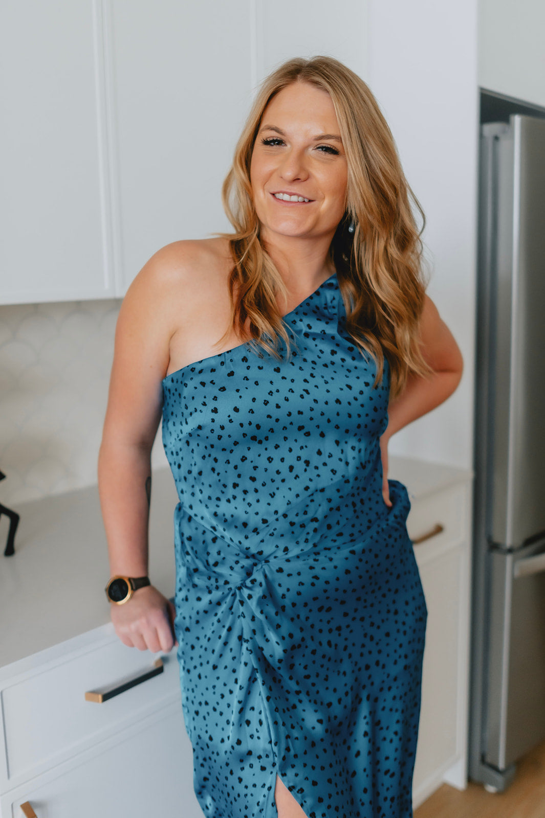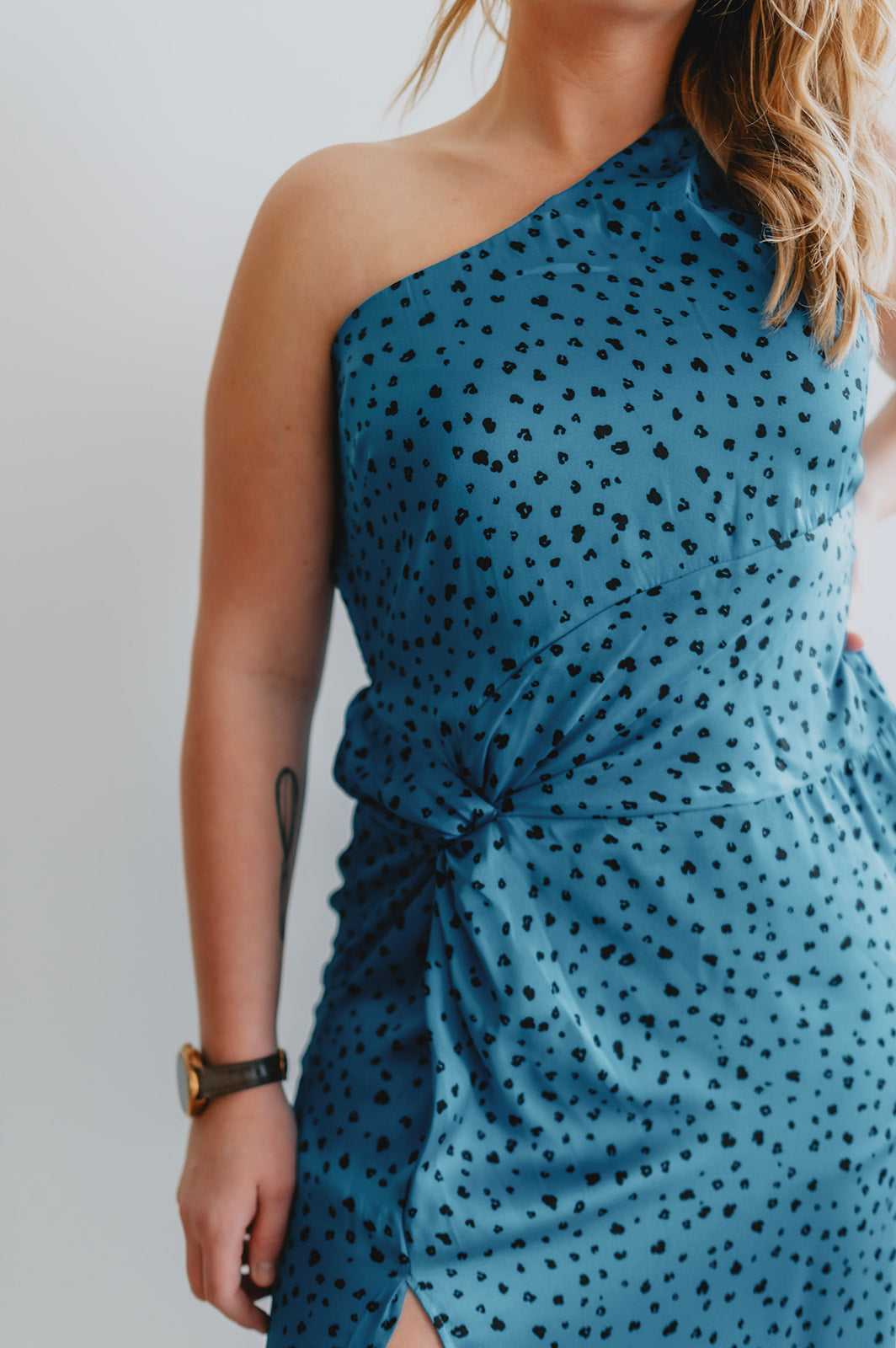 The Robin Dress is cut from our silky printed satin and is effortlessly sexy. It has a off-the-shoulder neckline and a side slit to show off your skin. The wrap bodice is perfect for accentuating your figure.