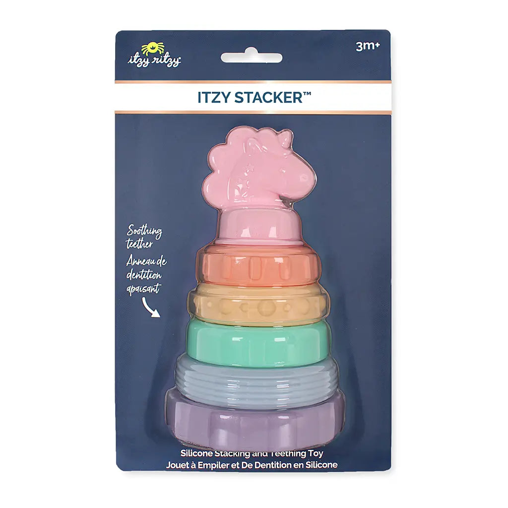 Stack and Soothe! Elevated to perfection, our Itzy Stacker™ silicone stacking and teething toy offers sensory exploration with multiple textures for baby to engage & enjoy!