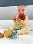 Watch as baby learns fine motor and problem-solving skills with consciously crafted pieces that easily nestle together & instantly soothes with soft textures to massage sore gums. The sky’s the limit – stack away, babe!