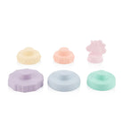 - 6 Silicone stacking rings with fun character topper helps improve fine motor skills.
