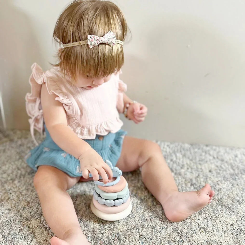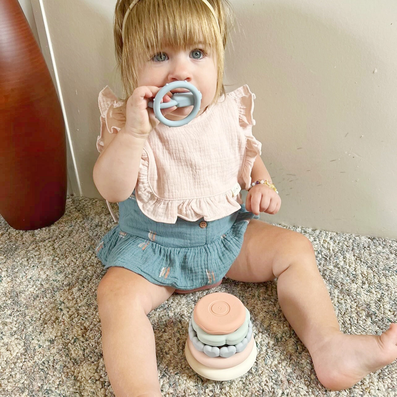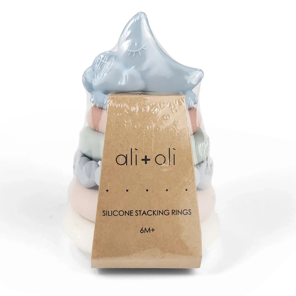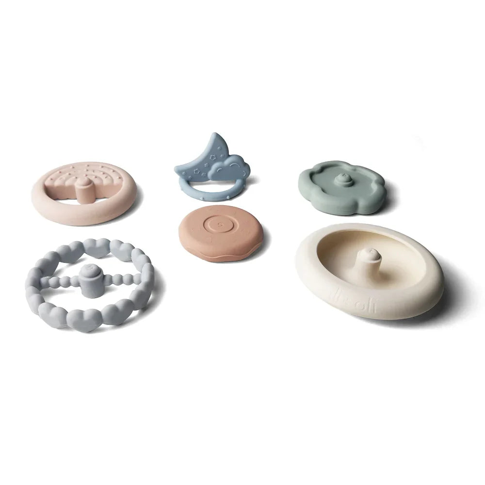 Our soft silicone Stacking tower is the perfect multi-functional toy for your baby's development. Designed from 100% silicone it’s lightweight, can be stacked in multiple ways, and is great for practising coordination and motor skills. Each ring has a different shape and texture helping develop the graph skill in babies and the topper is a cute moon and cloud figure. Each set includes 5 soft silicone rings with shapes and a cute moon/cloud or sun topper (6pc total).