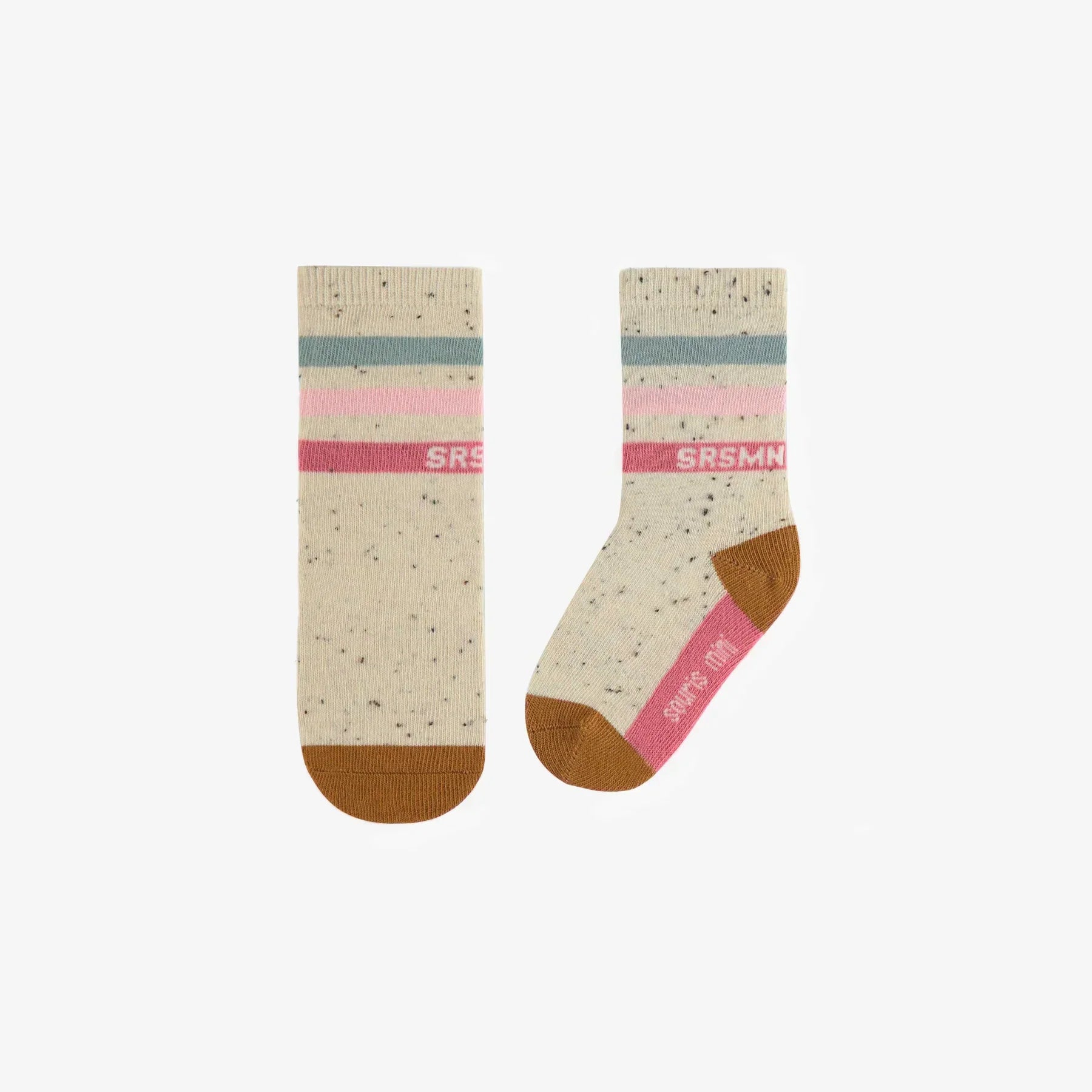 Cream socks for baby sporty-style with three colourful blue and pink stripes at the top made in a comfortable stretch fabric. Calf height. You will appreciate the reinforcements at the heels and toes that give our socks a better durability.