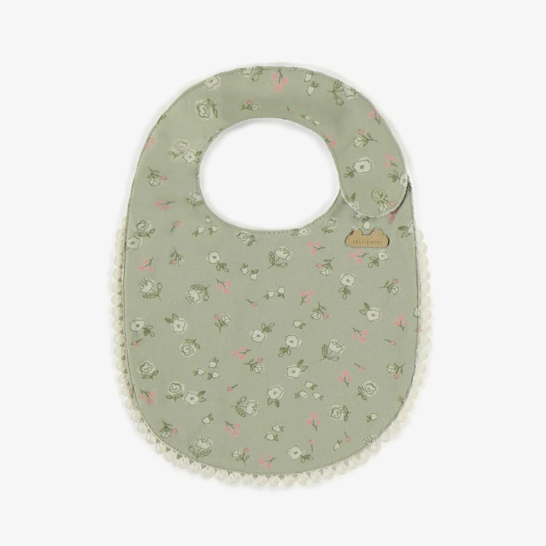 Light green bib with an all over print of mini pink flowers made in a soft organic cotton extensible and lined with an absorbent material.