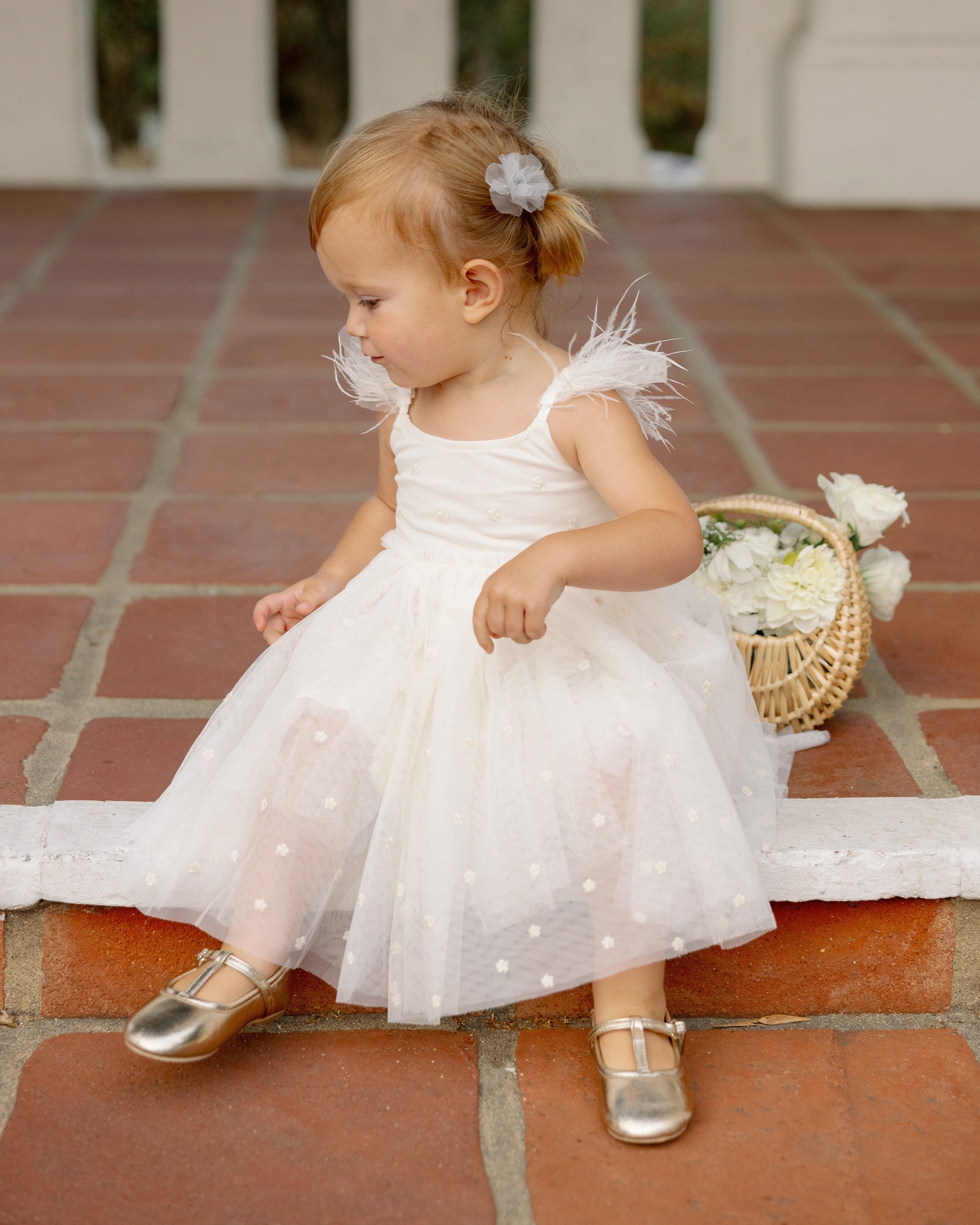 Whimsical and playful, our Poppy Dress features a full tulle skirt, tiny floral embroidery, and beautiful feathered sleeves. Designed with a smocked back bodice, a soft jersey liner, and adjustable straps. Featuring our 'ivory' hue - this neutral hue is perfect for every occasion.