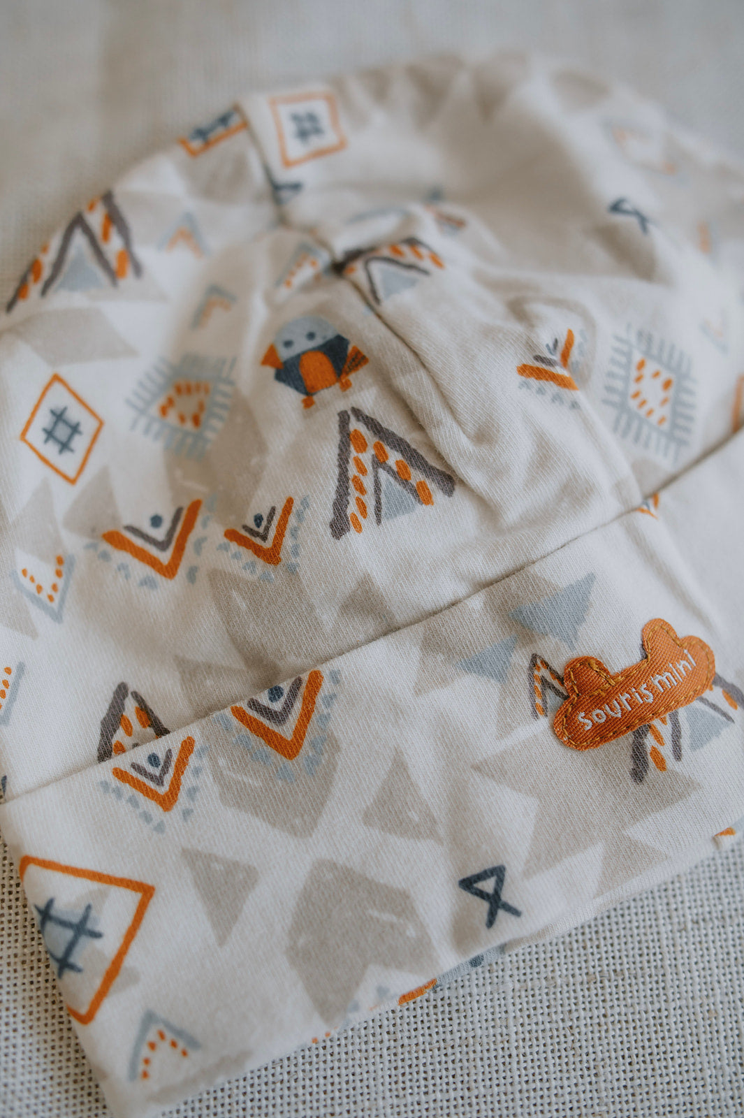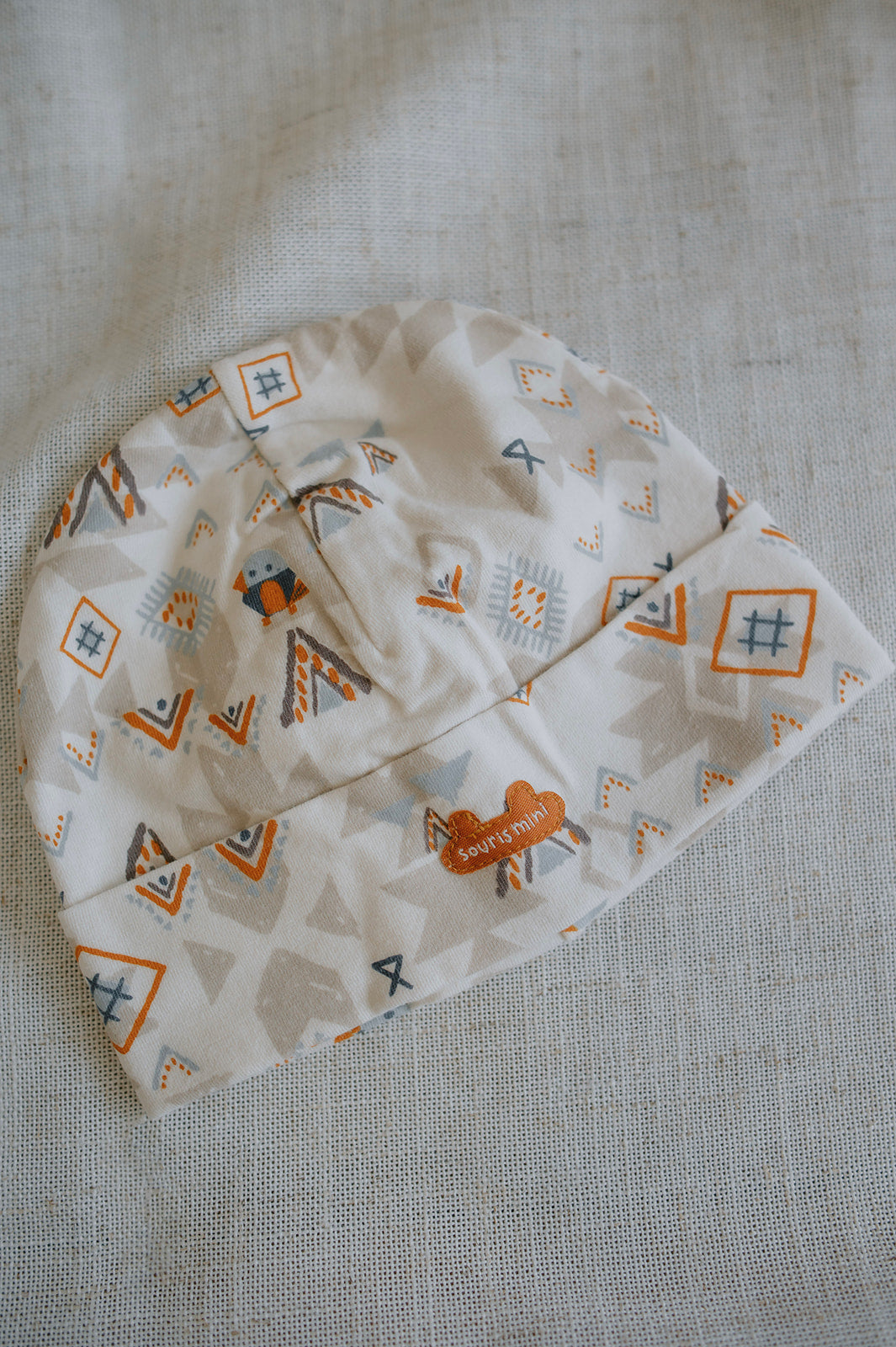 Cream patterned hat with birds and mountains with touches of blue and orange in stretchy organic cotton jersey, ideal to keep his head warm.