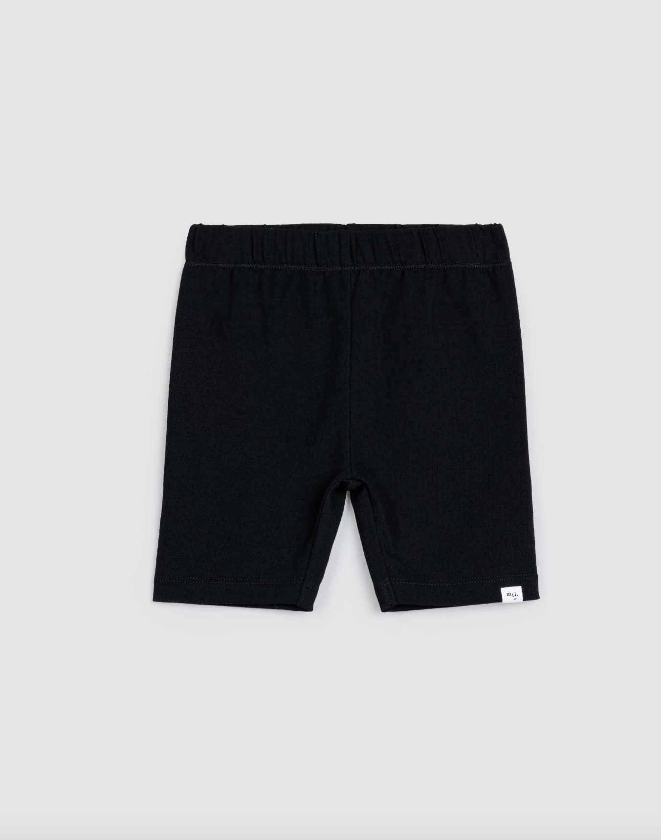 These plain black cycle shorts work with just about any outfit! Layer under dresses or wear with tops and sweatshirts for a casual outfit choice. Made from organic cotton jersey, the shorts have plenty of stretch to ensure she can run, dance and play. The gently elasticated waistband makes pulling the shorts up or down to get dressed quick and simple.