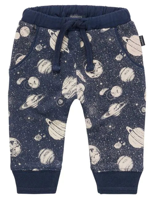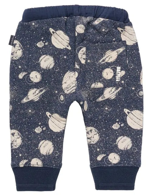 The Noppies Baby Janoshalma trouser joggers feature an all-over print with a spacy twist. The elasticated waist includes a tie ribbon, which has been made in such a way that it can’t be pulled out whilst tightening. The wide elasticated ribbed cuffs will stop the legs from creeping up. The stretch in the soft cotton has resulted in a great deal of comfort.