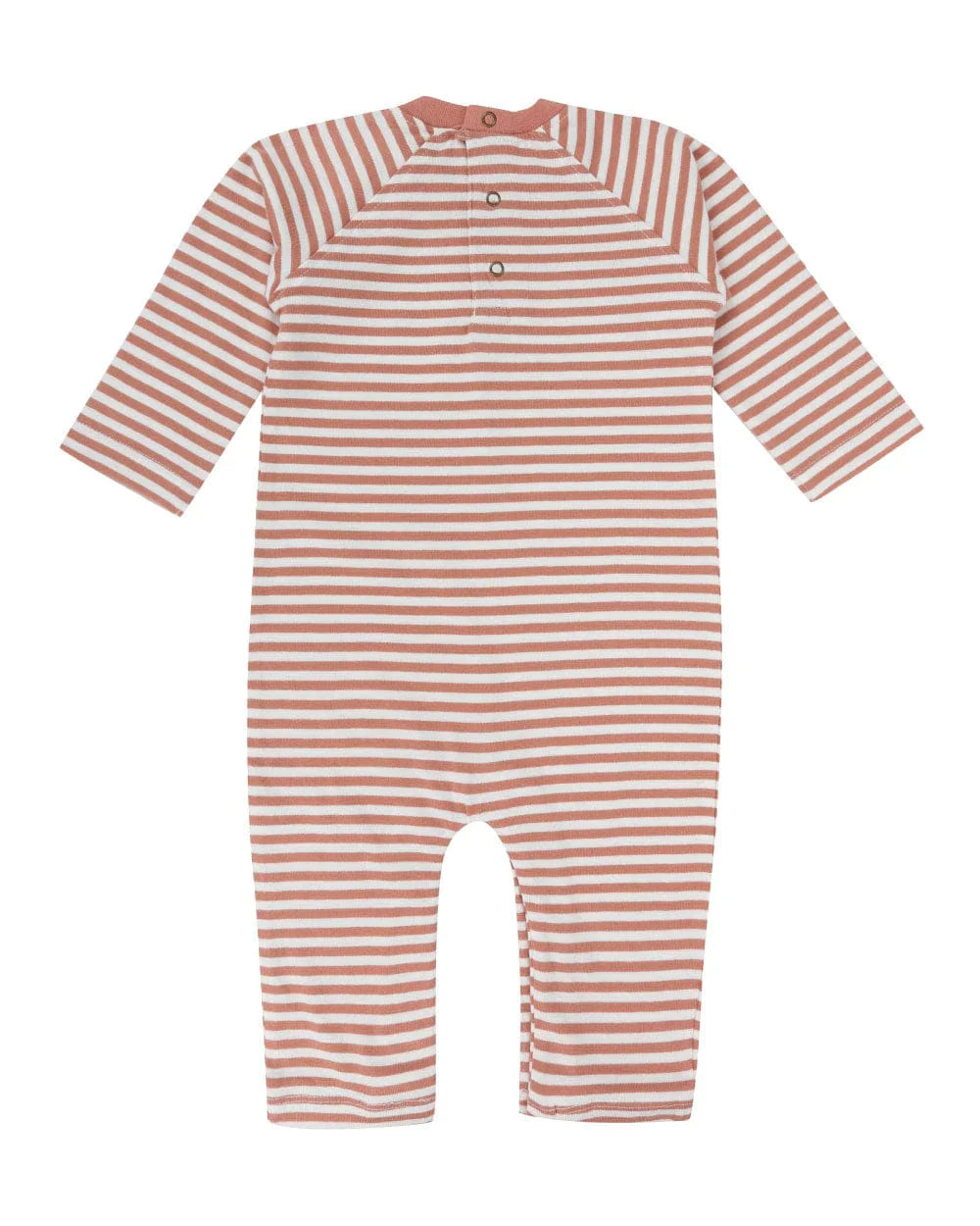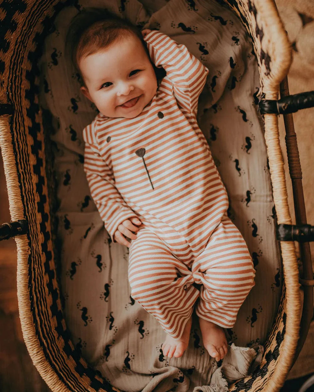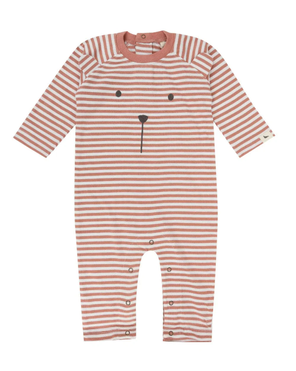 This jersey terracotta stripe character playsuit is made from organic cotton and is suited for all seasons. This playsuit is soft and gentle on delicate skins and to the environment too. Poppers to the back of the neck and legs make for easy dressing. Little ones will love the 3-D ears too!