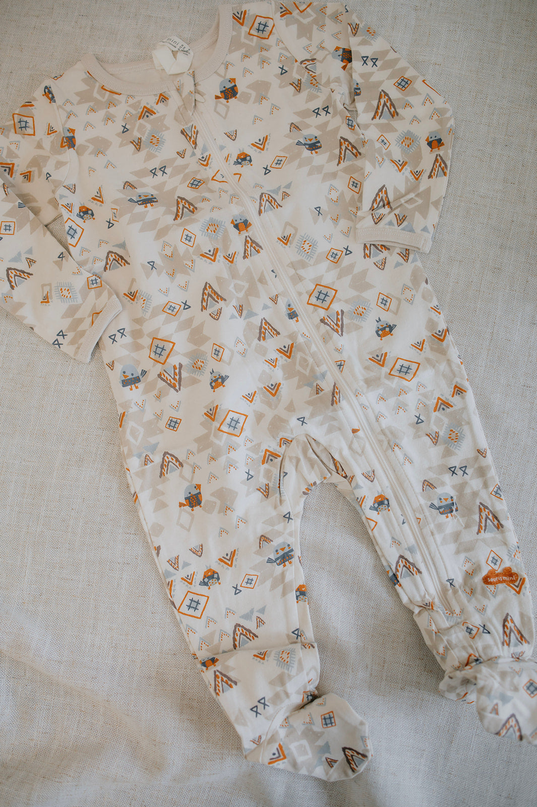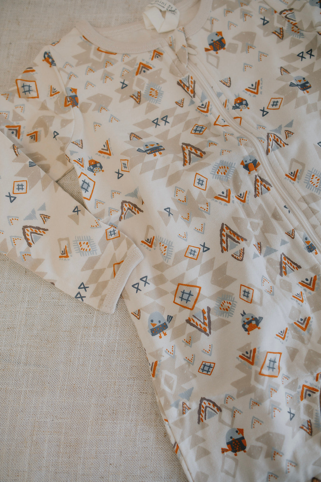 Long-sleeved, round-neck, full front zipper pajama with an all over print of birds and mountains in soft stretch organic cotton jersey.