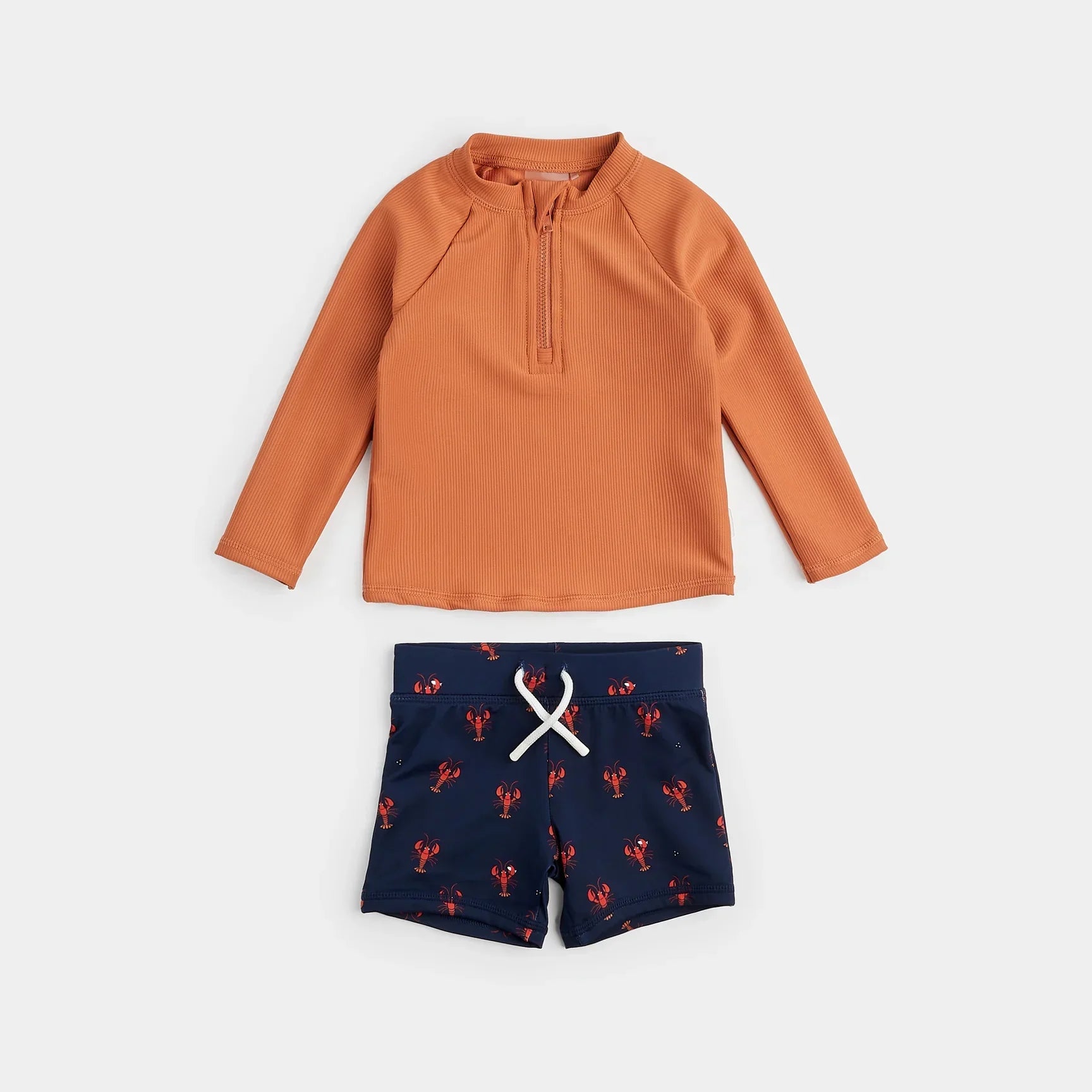 The set features a subtly textured long sleeved rash guard with a zip down the front and navy shorts with our playful lobster print. The trunks have an elasticated waistband with drawstring tie for a secure fit while still being easy to pull up and down for quick changing. Made from soft recycled materials, the set is protective of their skin while being kind to the planet.