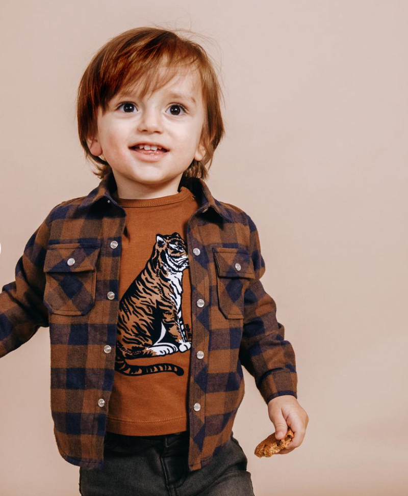 Nice jersey long sleeved tee in a soft organic cotton with a cool print on front. Push button closure on shoulder.