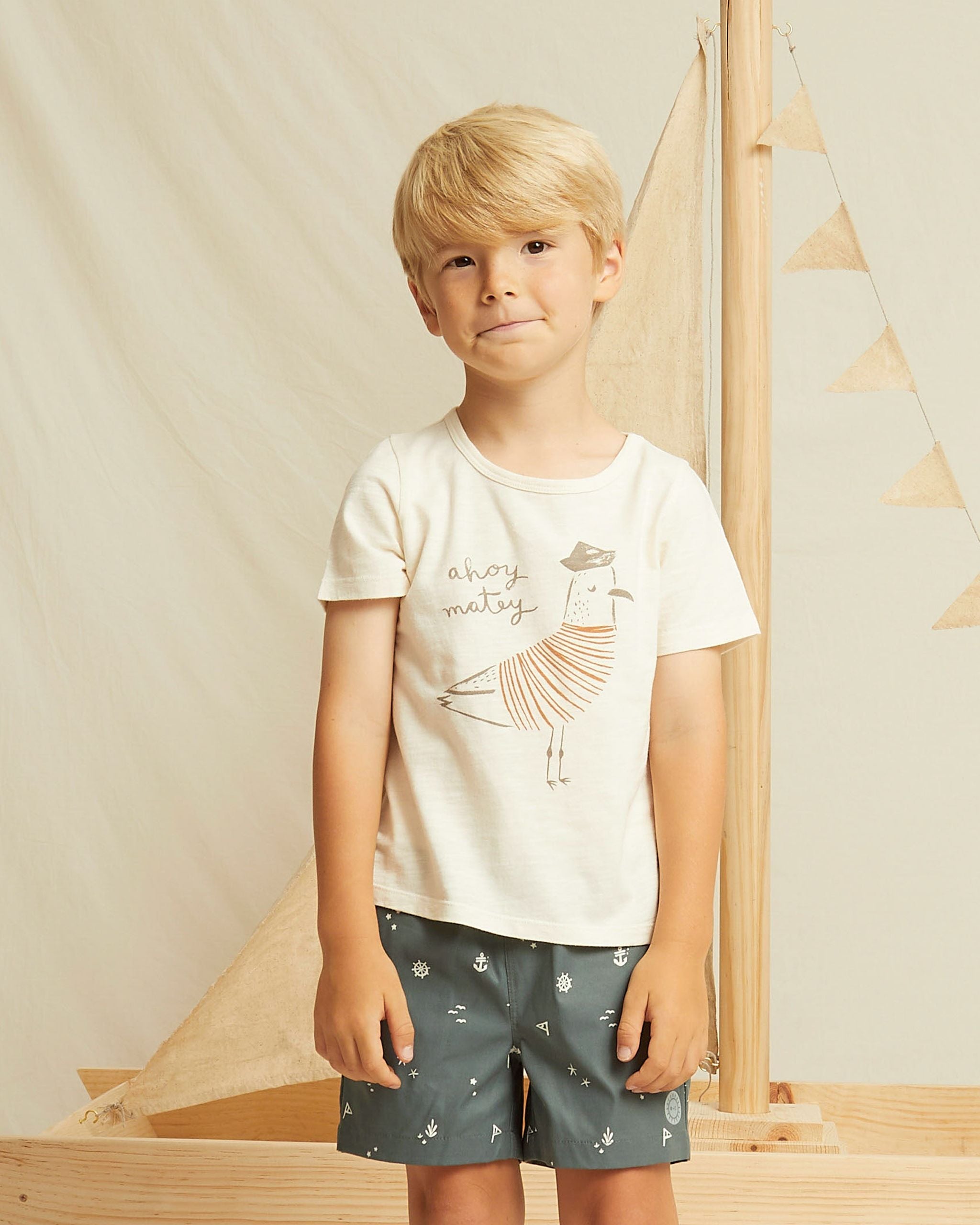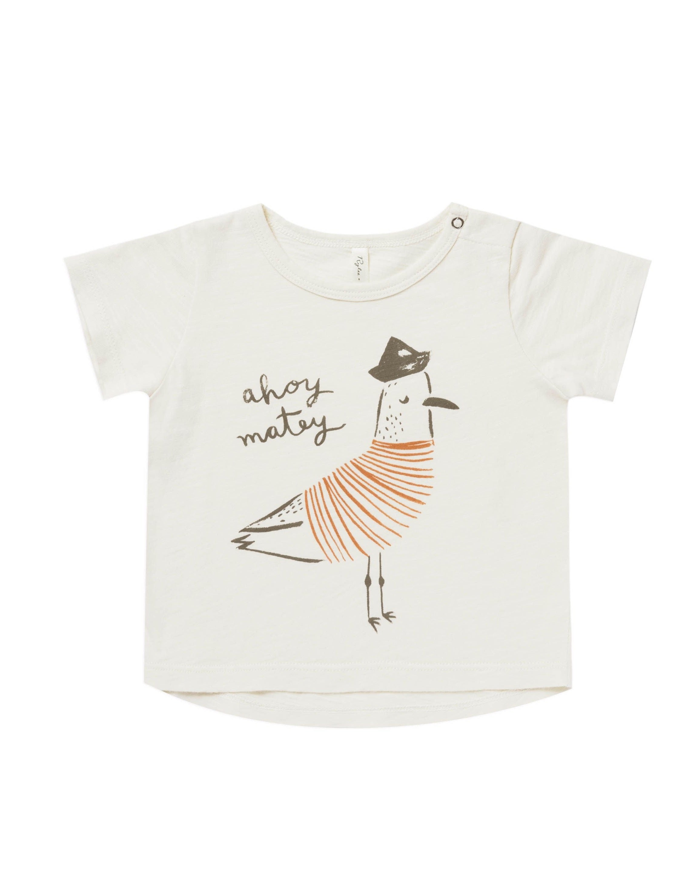Relaxed fit basic tee made from the softest cotton jersey. Baby sizes 0-3m thru 18-24m have snaps at the shoulder for easy changing. Featuring our 'Ahoy Matey' graphic on an ivory tee.