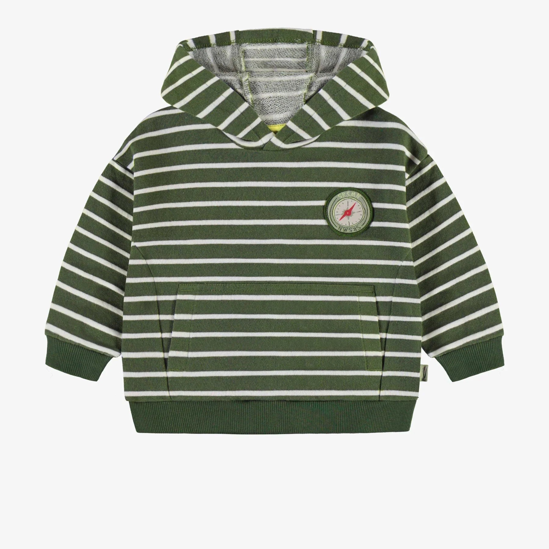 Green hoodie with fine horizontal white stripes with a large kangaroo pocket on the front and a cross collar made of French terry.