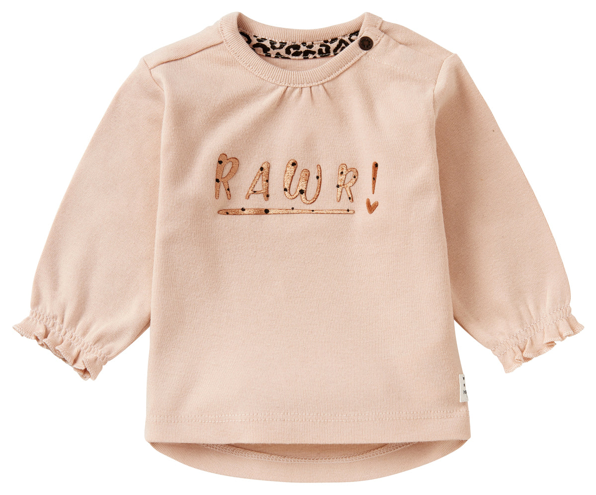 Combines soft pink with a warm rusty colour and panther print. The shirt features a round neckline with a handy press stud, long sleeves with elasticated cuffs and a 'RAWR!' on the chest. Perfect for your cool little chick.