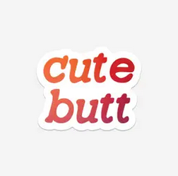 Sticker reads "cute butt" in black or orange gradient on a white background. Smaller size means these are easily applied to phone cases or water bottles.