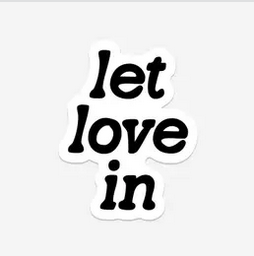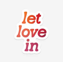 Sticker reads "let love in" in black or orange gradient on a white background. Smaller size means these are easily applied to phone cases or water bottles.