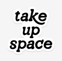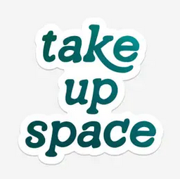 Sticker reads "take up space" in black or emerald green gradient on a white background. Smaller size means these are easily applied to phone cases or water bottles.