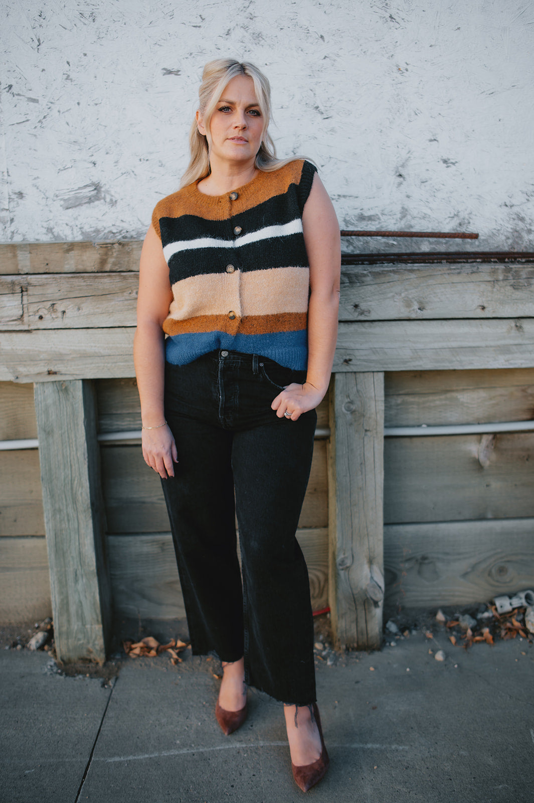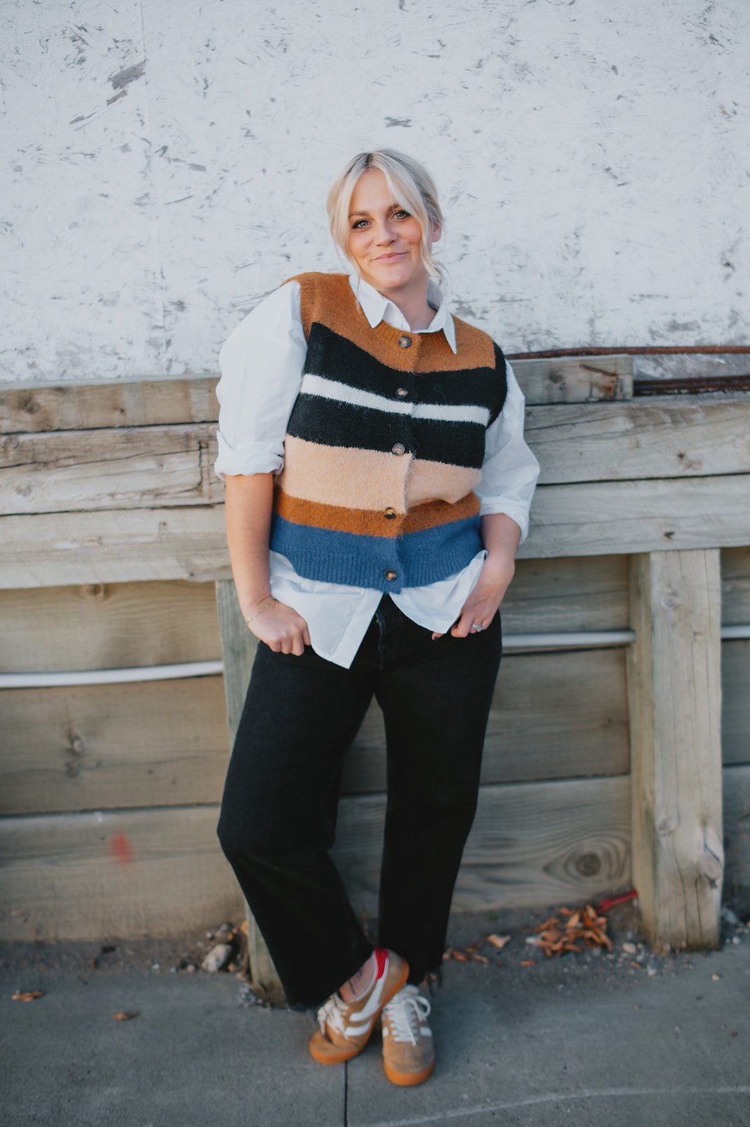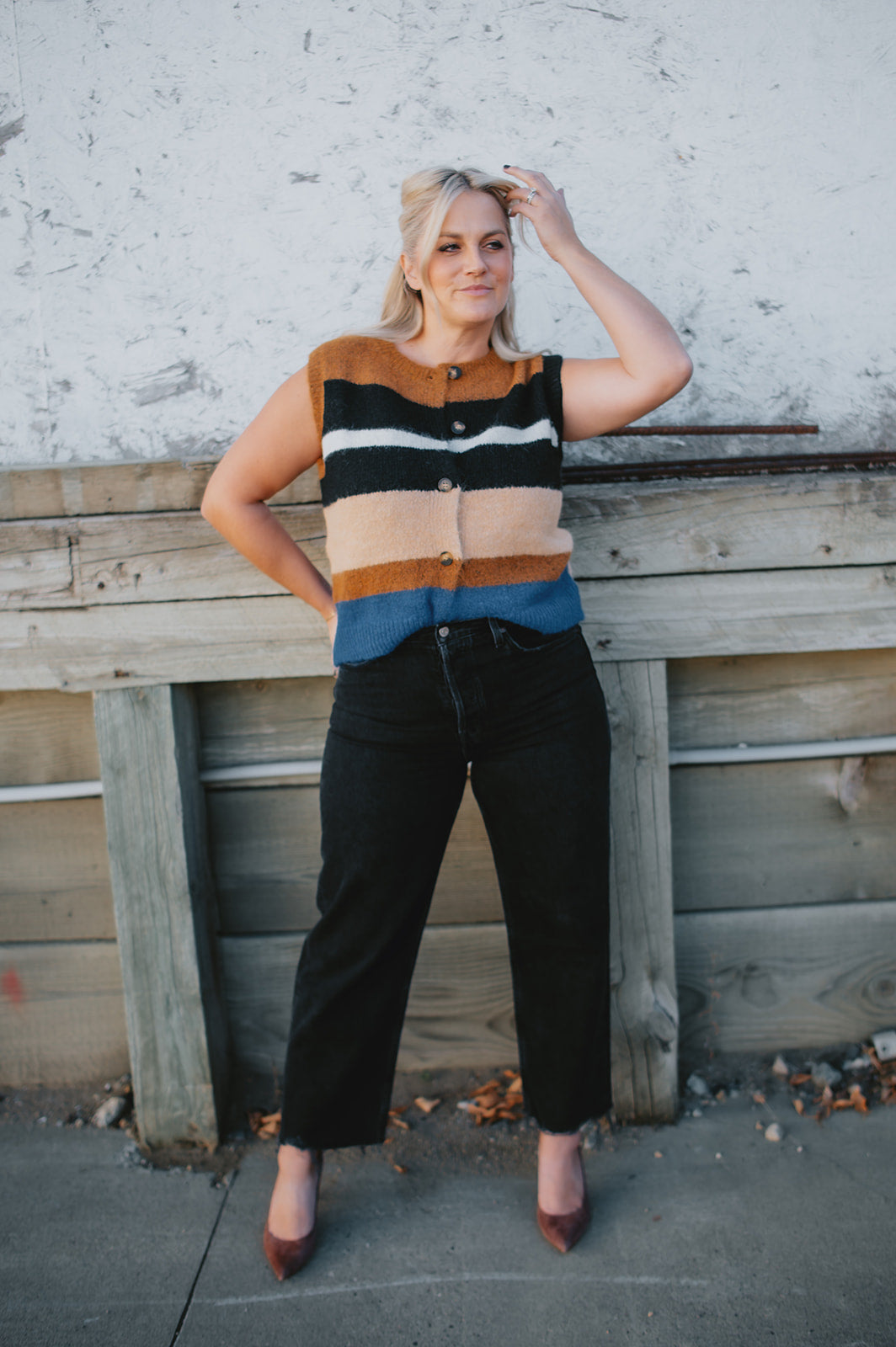 Cozy up in bold style with this soft pullover sweater vest, designed with striking multicolor stripes. The fuzzy knit texture adds warmth, while the relaxed fit and button-down front offer a laid-back, vintage-inspired feel. Whether layered over a shirt or worn on its own, this vest delivers both comfort and standout personality.