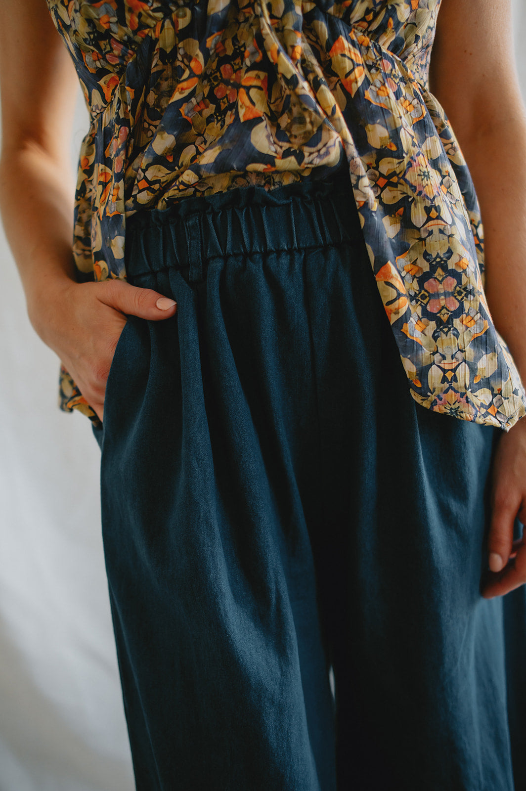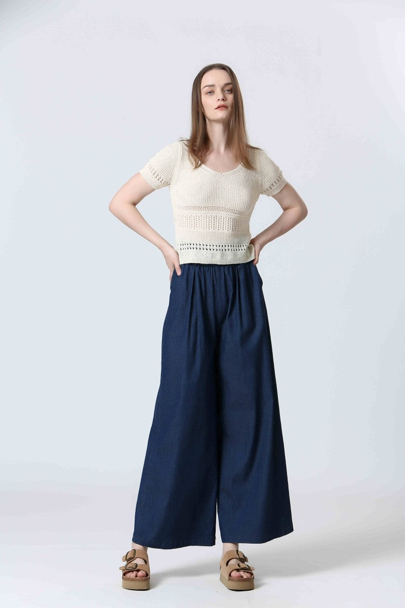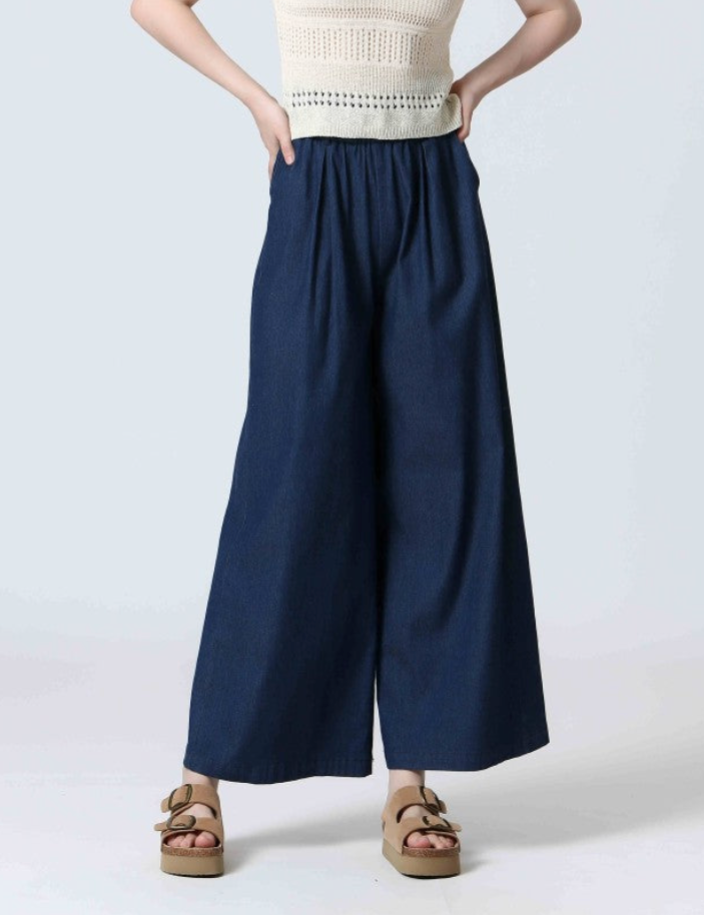 The Thelma Wide Leg Pants are the perfect blend of comfort and structure. Designed in a soft, stretchy cotton-terylene blend with a hint of elastane, they feature a pull-on elastic waistband with belt loops, subtle ruffle detailing, and a relaxed wide-leg silhouette. The dark denim wash adds a polished finish, while side pockets keep them practical. Effortless and easy to style—these are your new go-to pants.