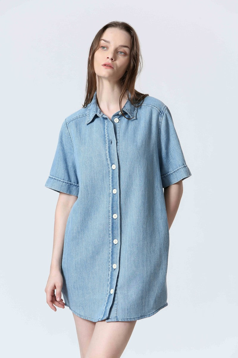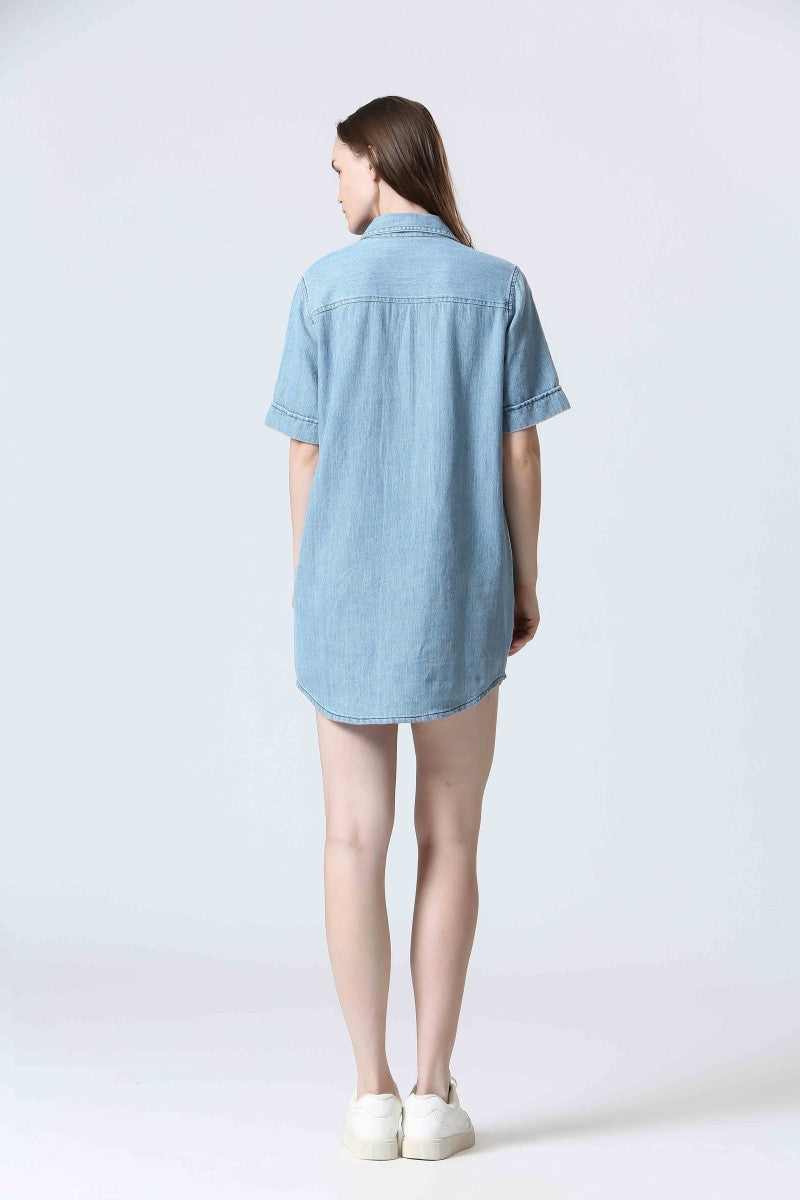 Western charm meets modern ease in The Wyatt Denim Mini Dress. Made from 100% cotton, this collared mini features a button-up front, short sleeves, and a relaxed, boxy fit for effortless everyday wear. The structured silhouette and subtle western inspiration give it just the right amount of attitude. She's perfect with boots or sneakers for that cool, casual edge.