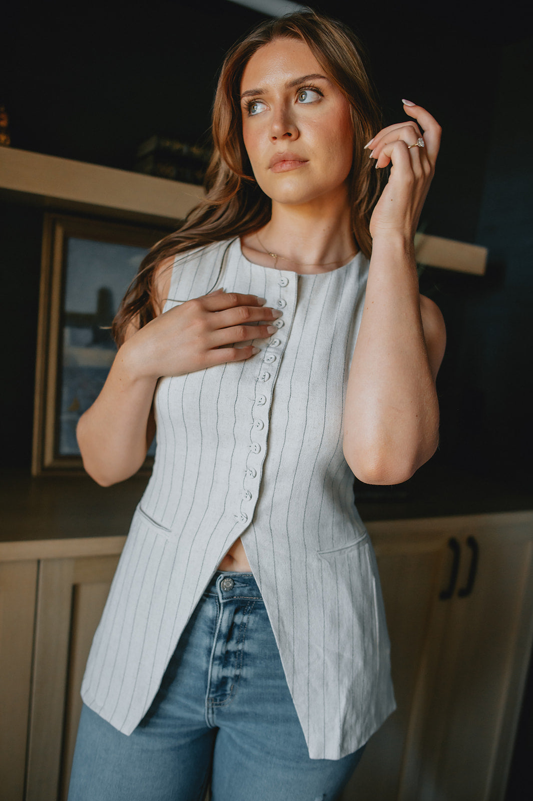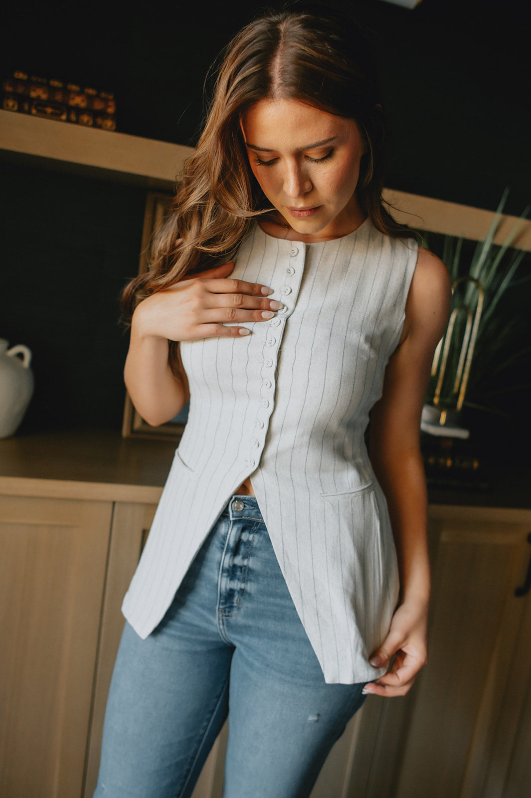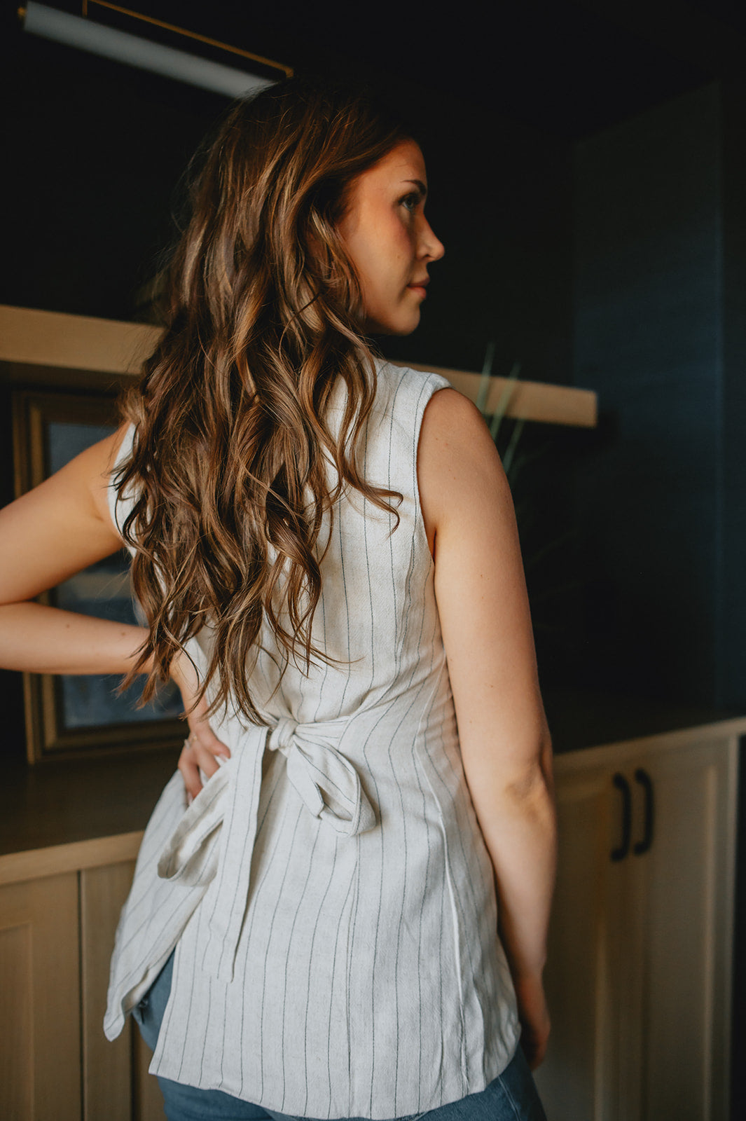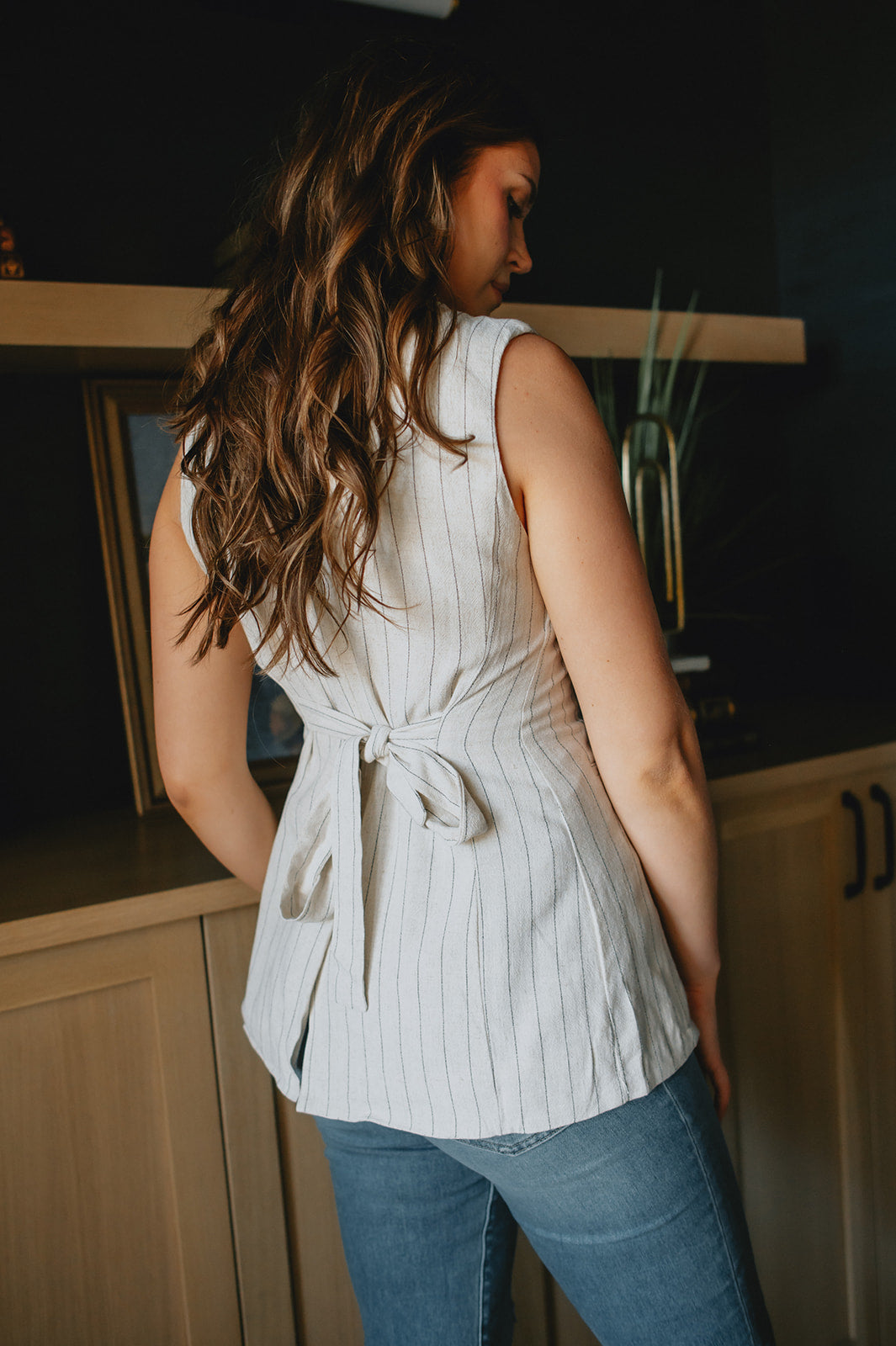 Effortlessly structured with a tailored silhouette, this sleeveless vest offers a refined take on modern suiting. The fitted bodice features delicate button details, while the adjustable tie-back cinches the waist for a custom fit. Its sleek cut and subtle layering detail make it perfect for pairing with a skirt or styling over slim trousers for a polished yet contemporary look.