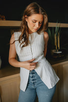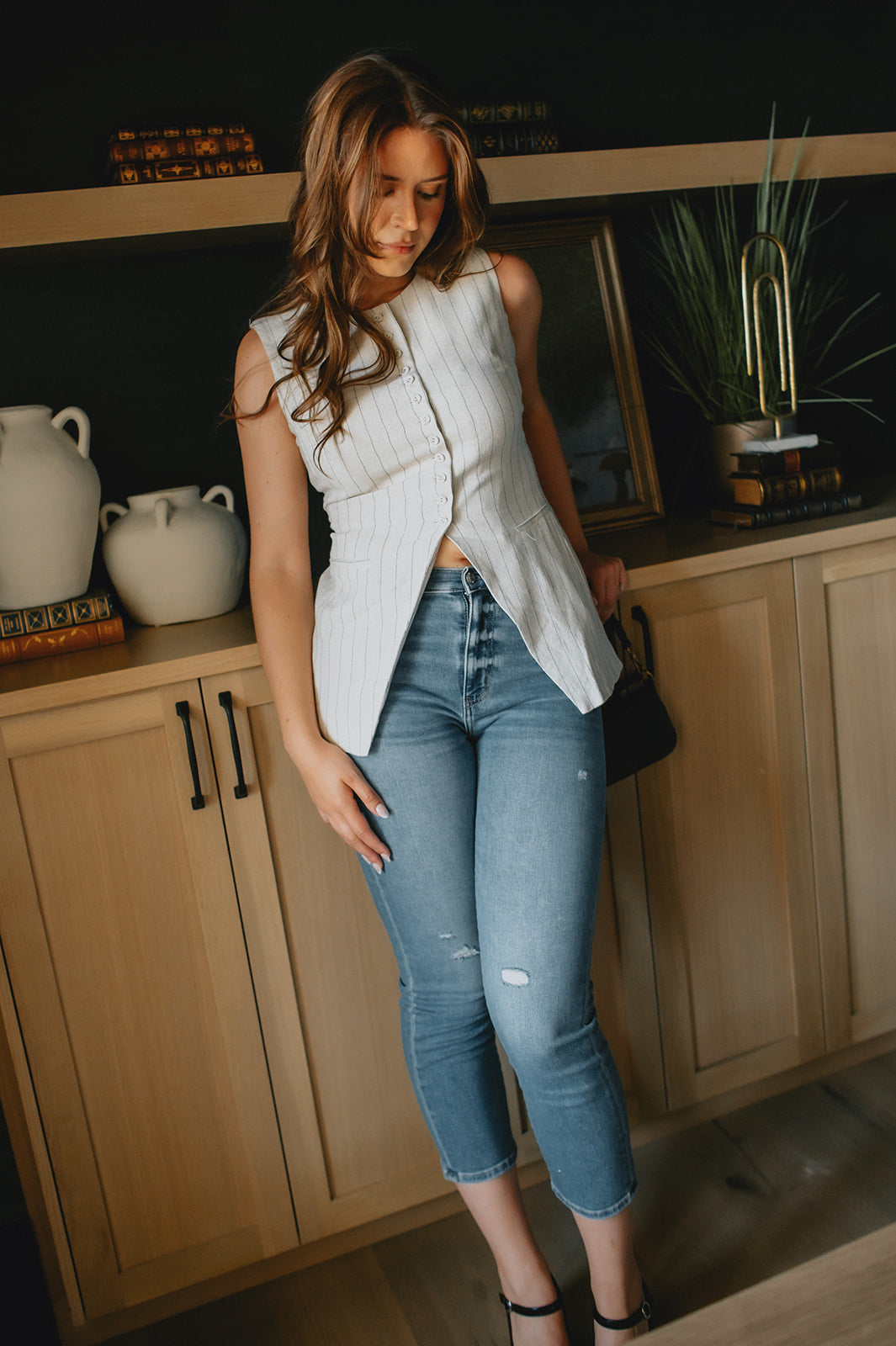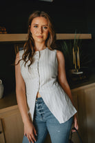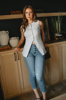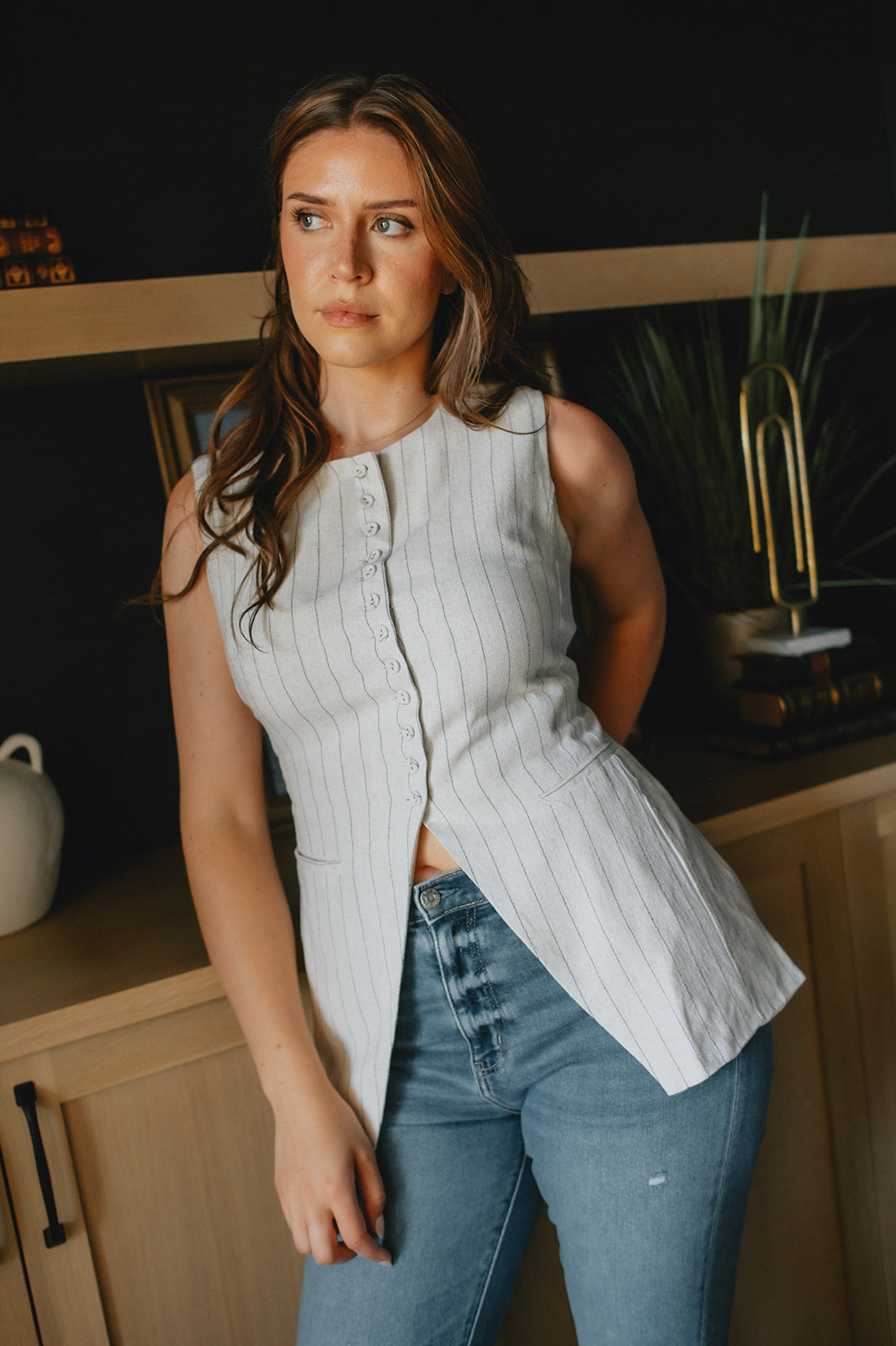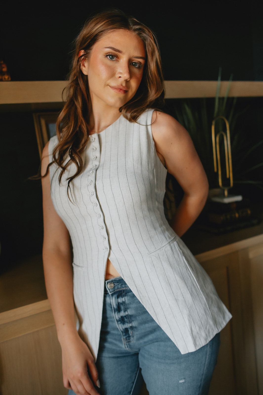 Effortlessly structured with a tailored silhouette, this sleeveless vest offers a refined take on modern suiting. The fitted bodice features delicate button details, while the adjustable tie-back cinches the waist for a custom fit. Its sleek cut and subtle layering detail make it perfect for pairing with a skirt or styling over slim trousers for a polished yet contemporary look.